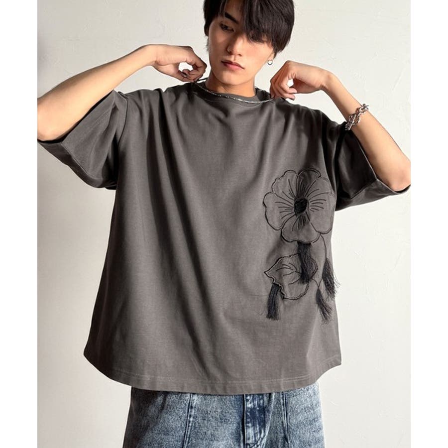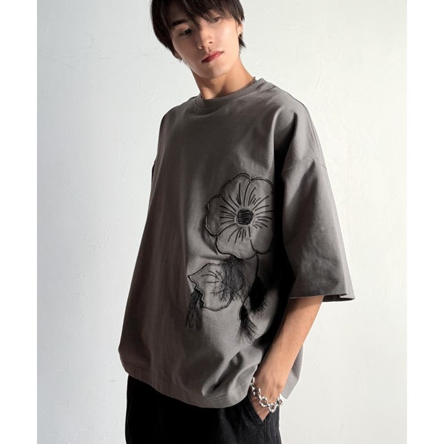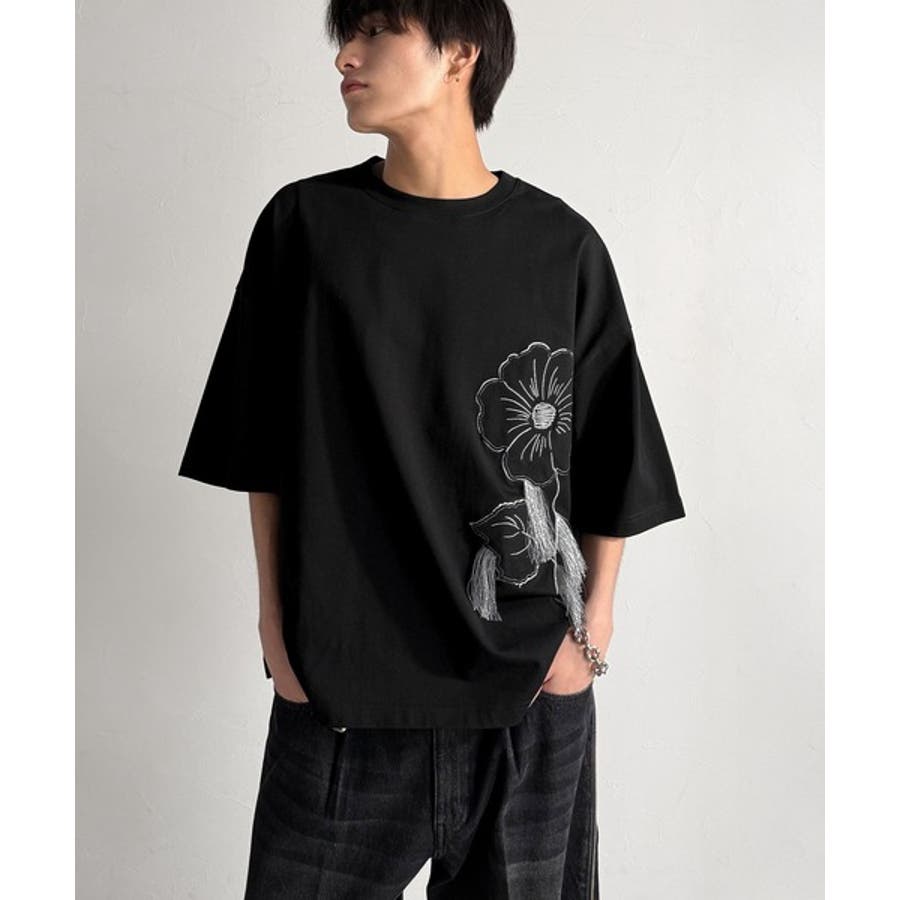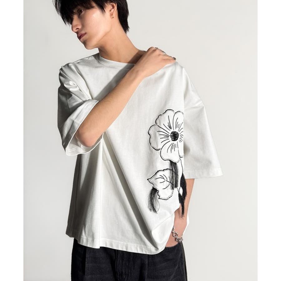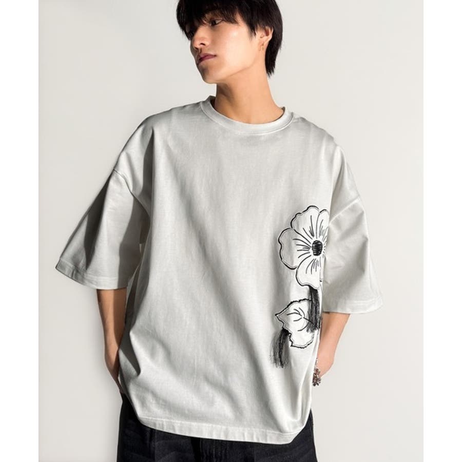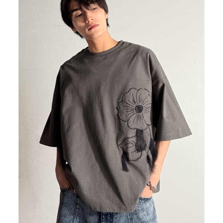 「Flower Stitch Applique Design T-Shirt/綿100%フラワーステッチアップリケデザインTシャツ」