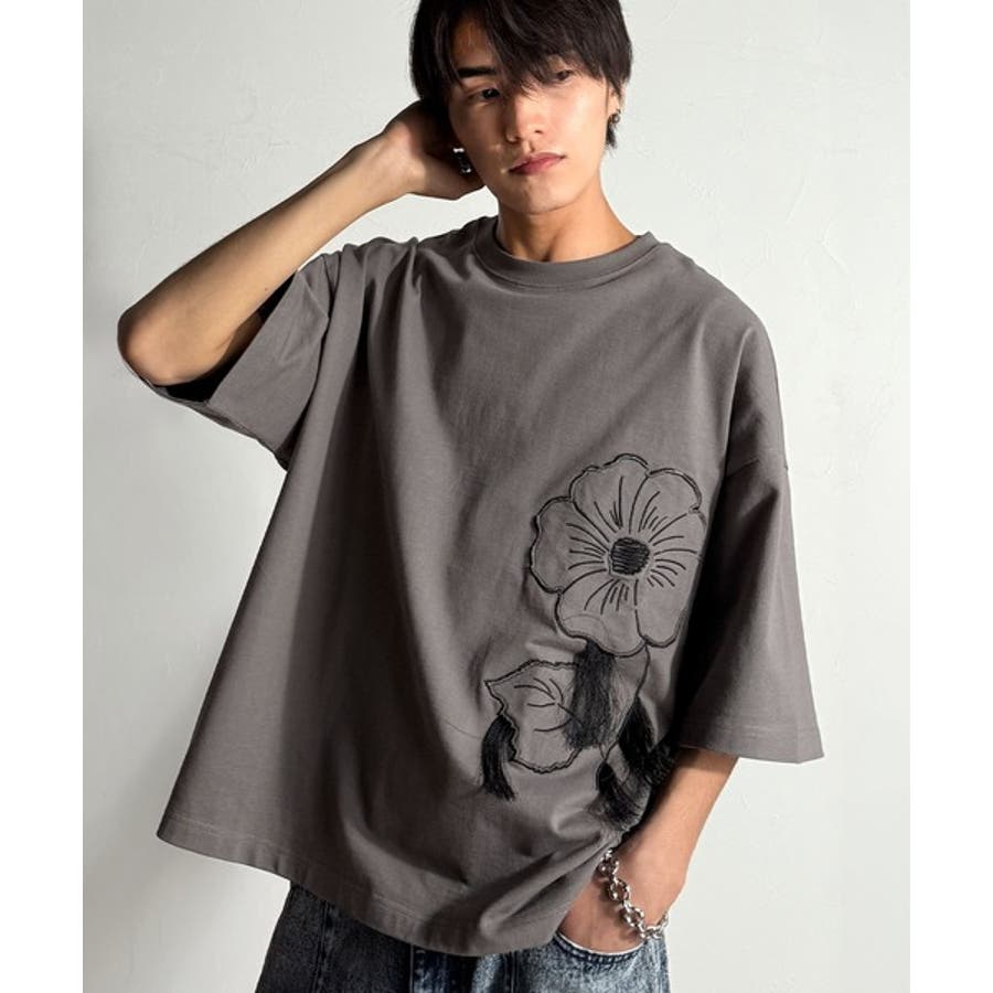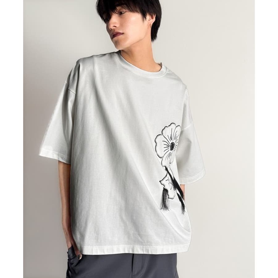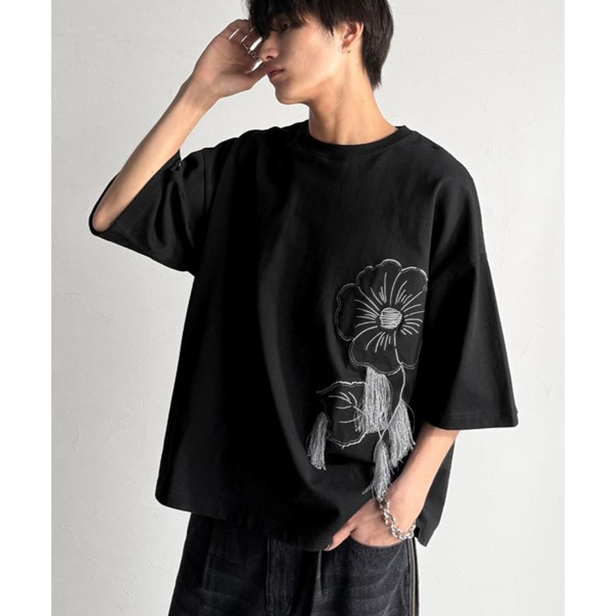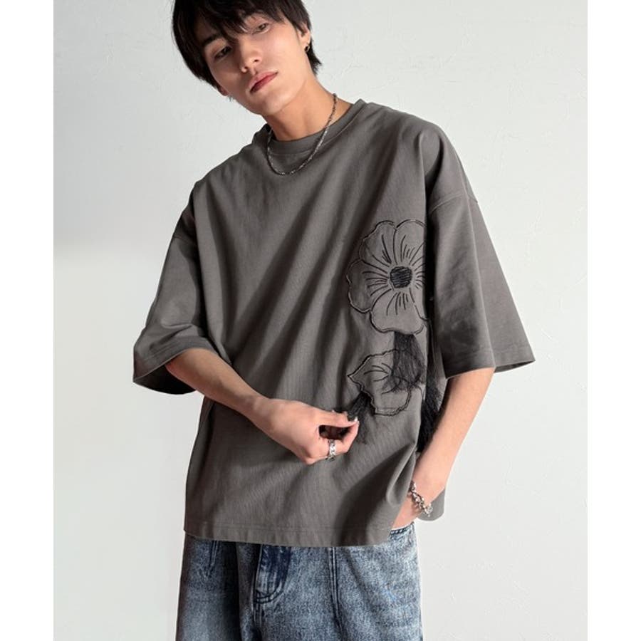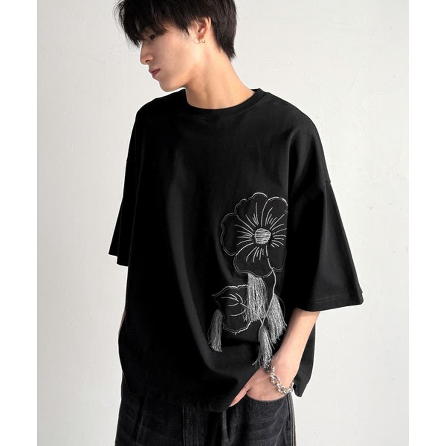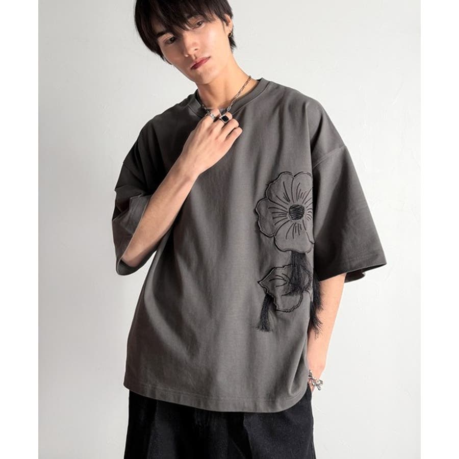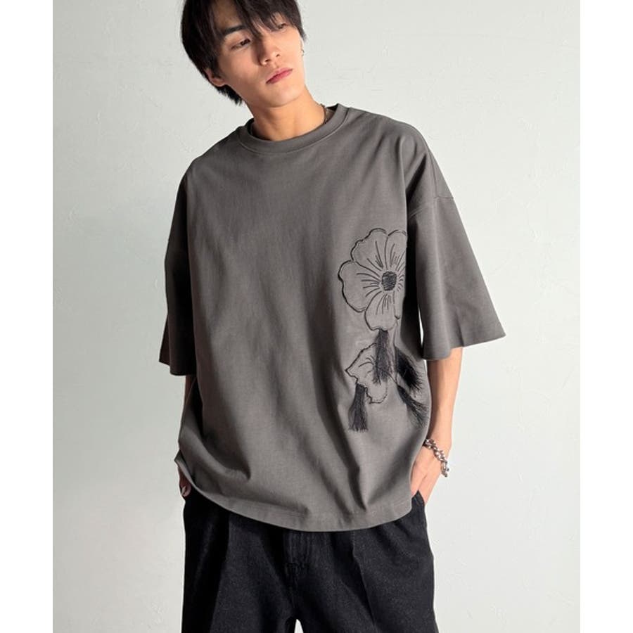 「Flower Stitch Applique Design T-Shirt/綿100%フラワーステッチアップリケデザインTシャツ」