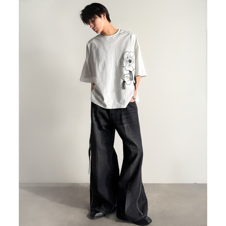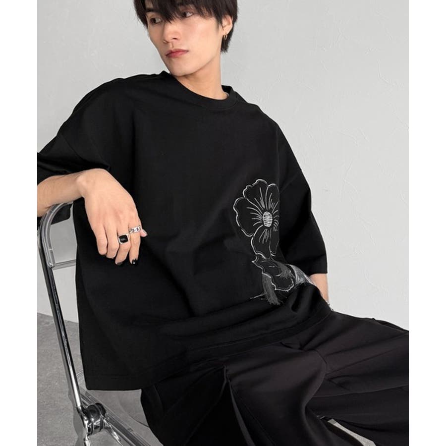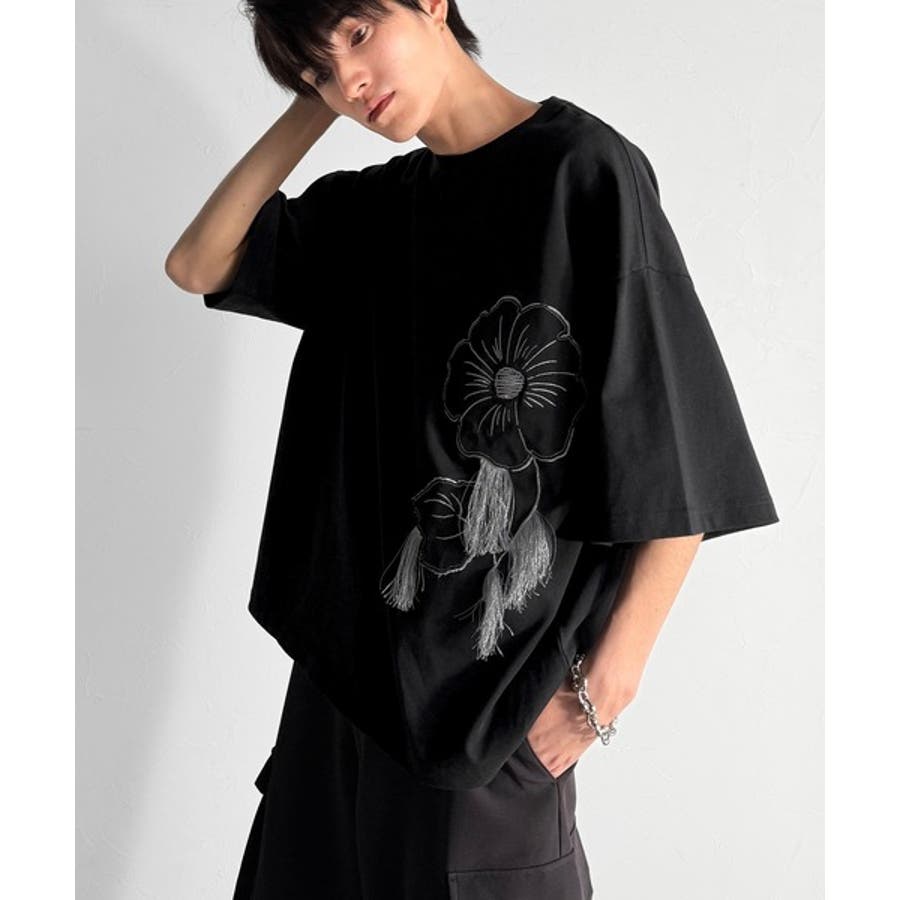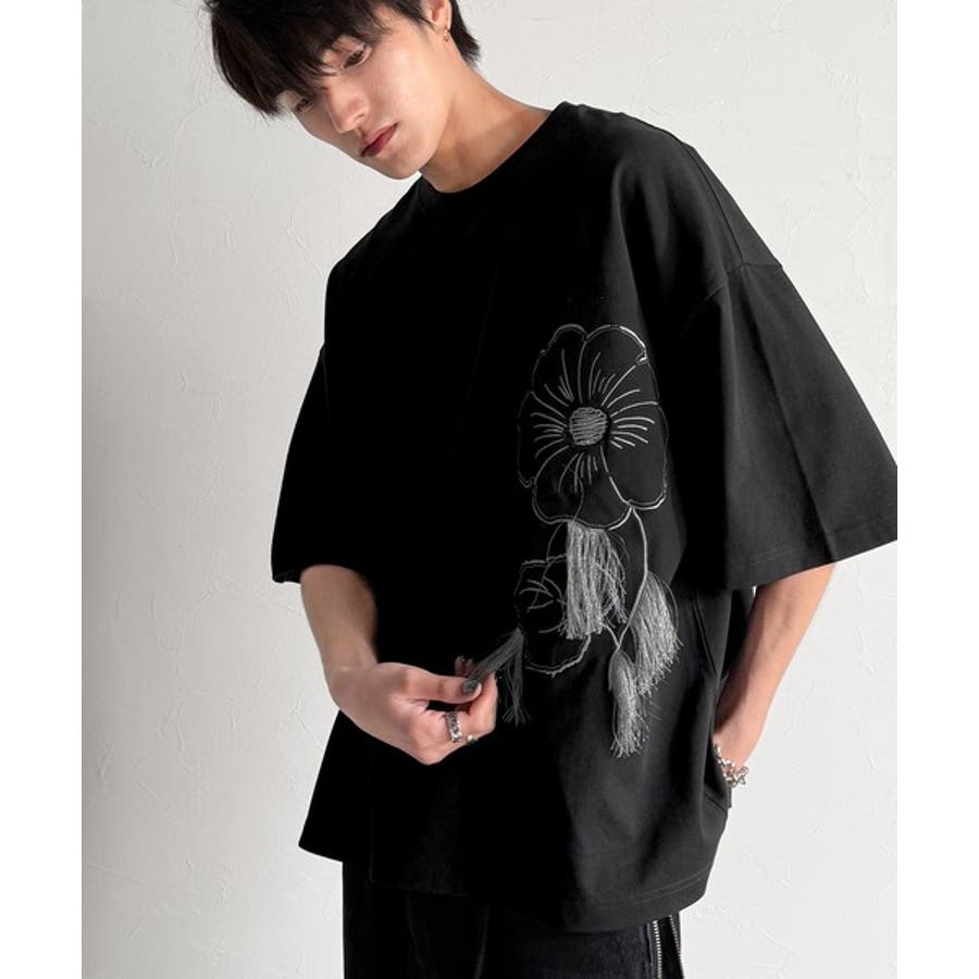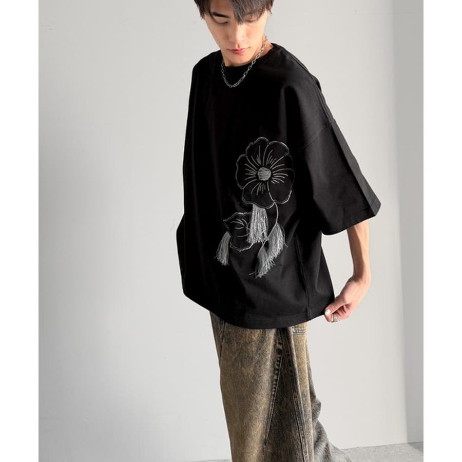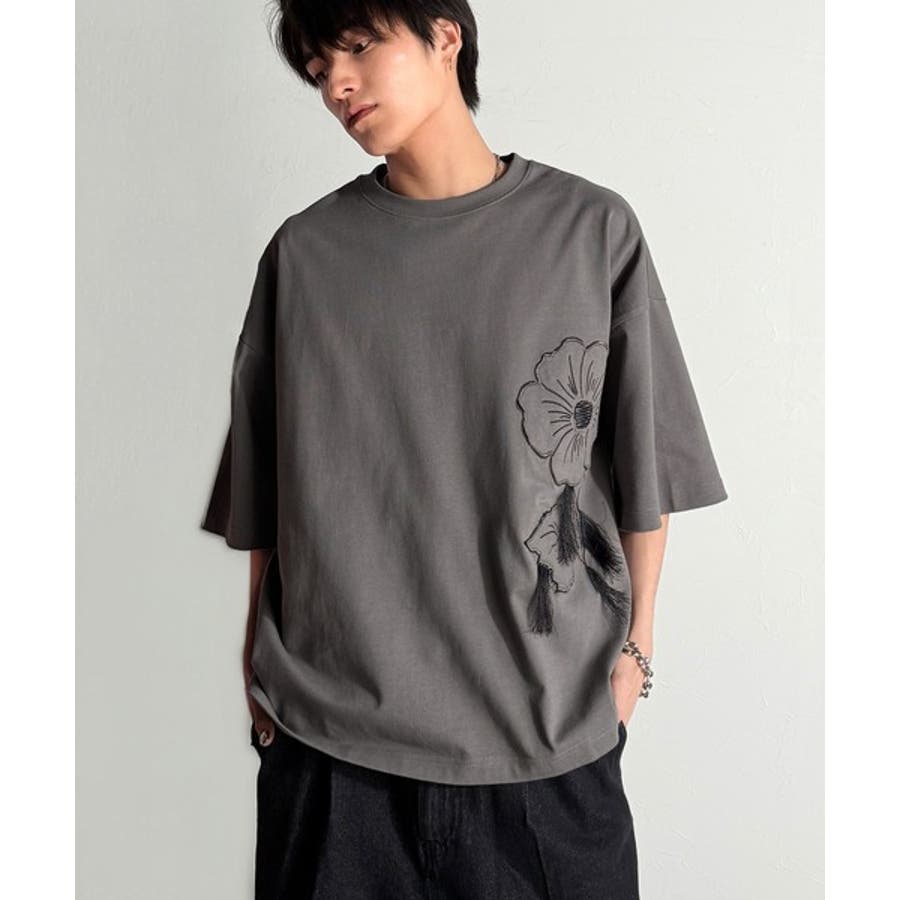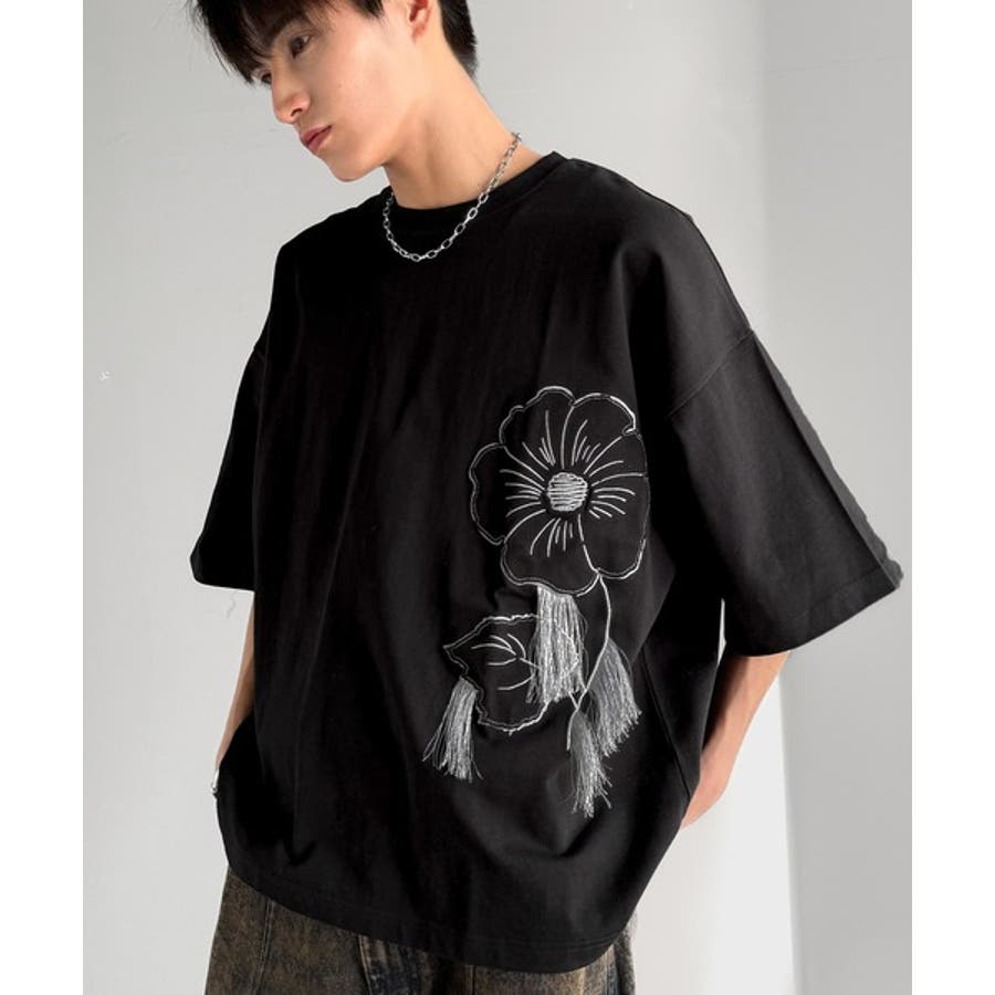 「Flower Stitch Applique Design T-Shirt/綿100%フラワーステッチアップリケデザインTシャツ」