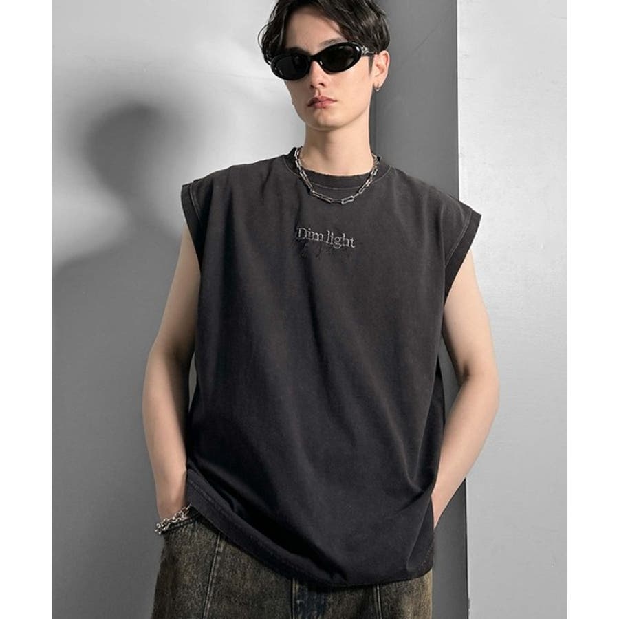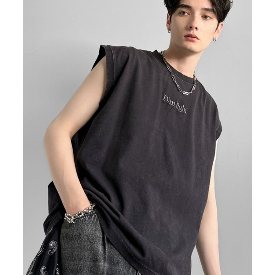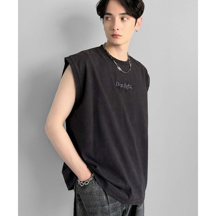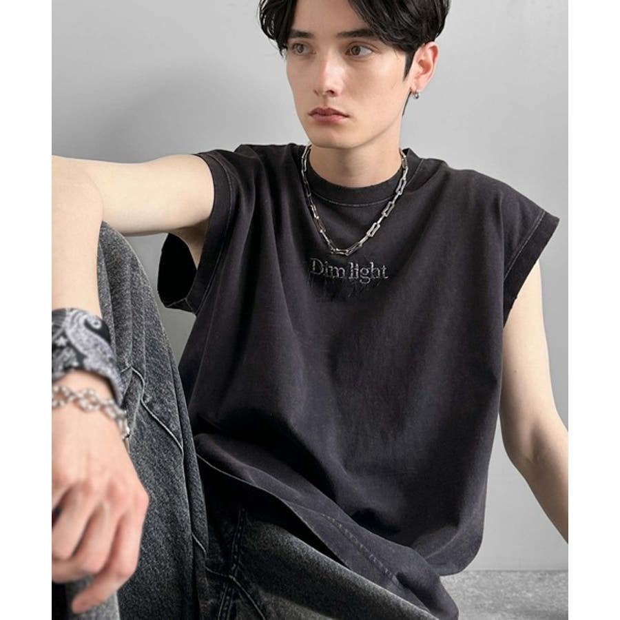 紐刺繍スノーウォッシュ加工ノースリーブTシャツ」