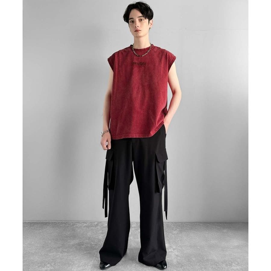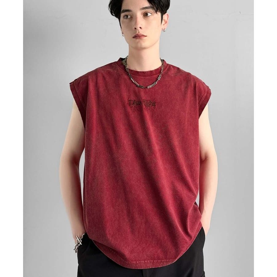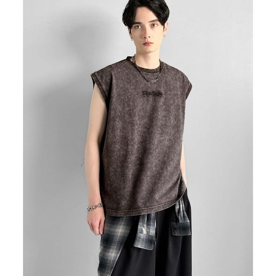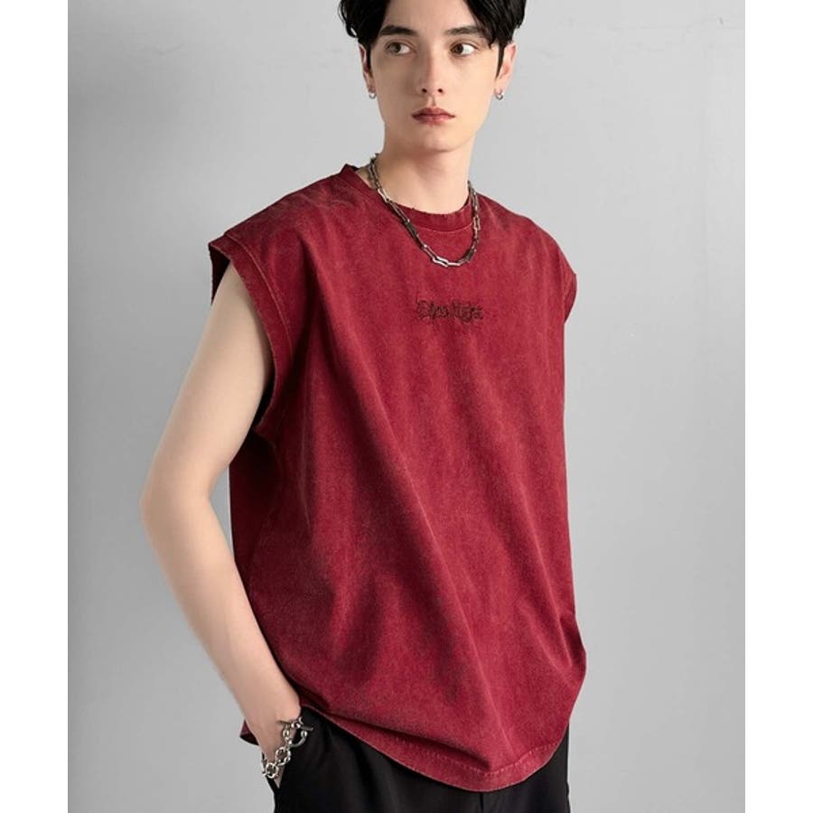 紐刺繍スノーウォッシュ加工ノースリーブTシャツ String Embroider…