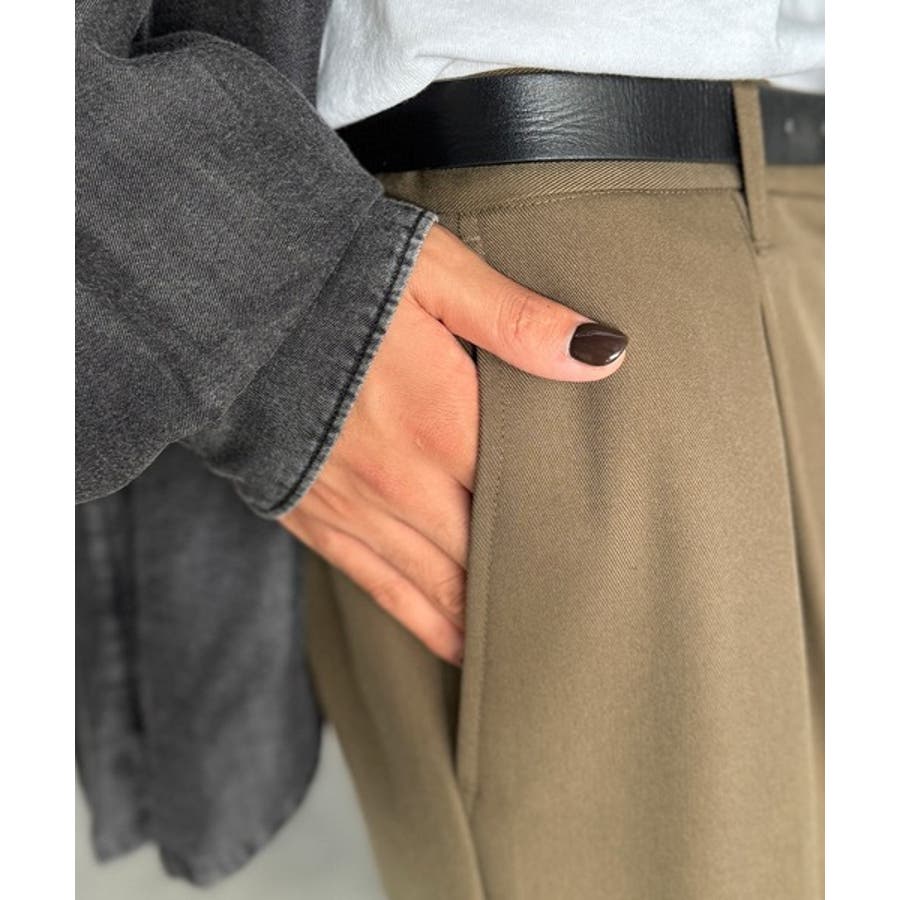 ウエストにワンタックを入れて程よいゆとりを確保しつつ、裾に向かって広がるフレアラインで美しいシルエットを実現。