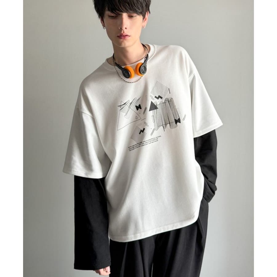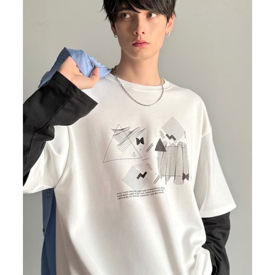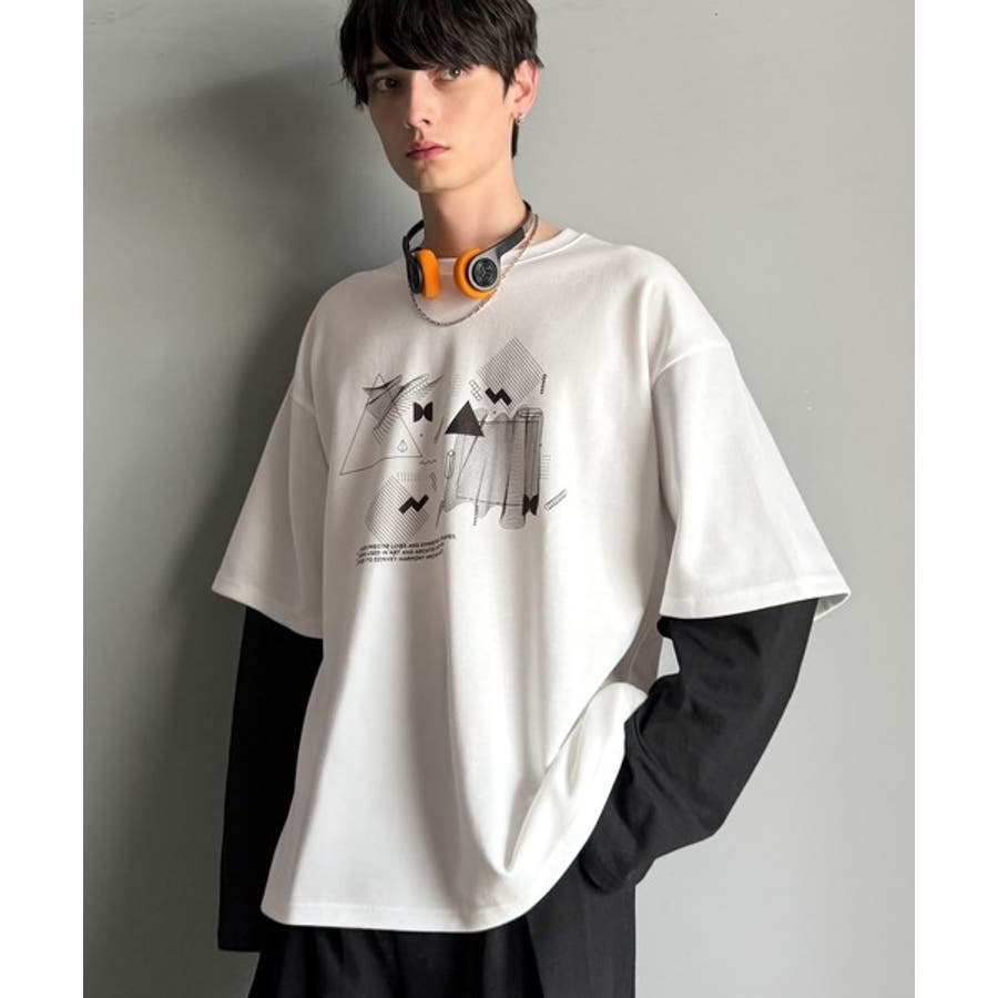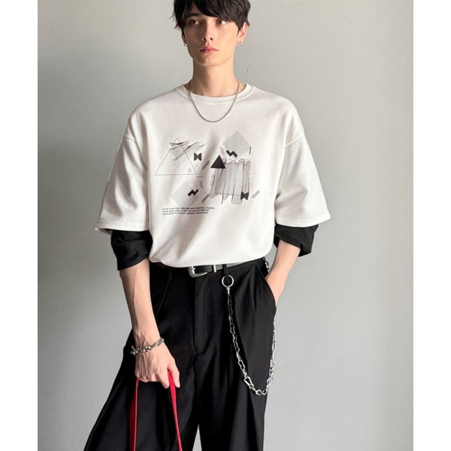 幾何学柄ポンチ素材レイヤードTシャツ 」