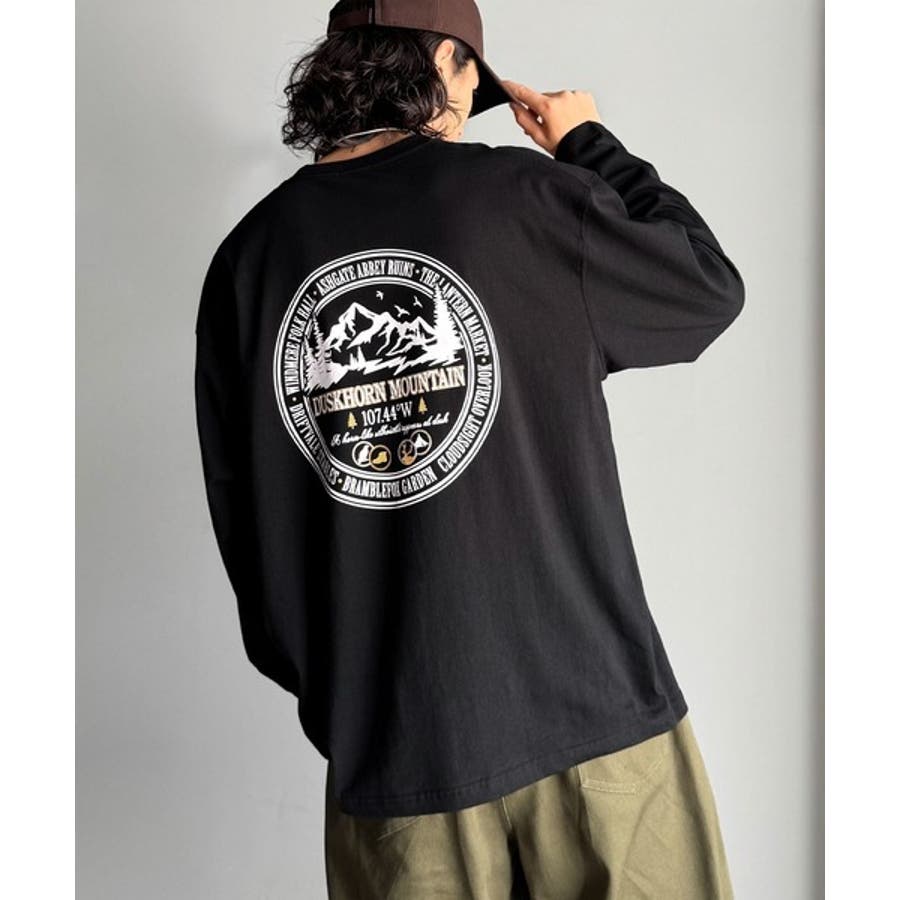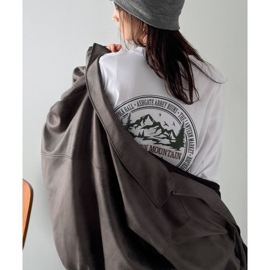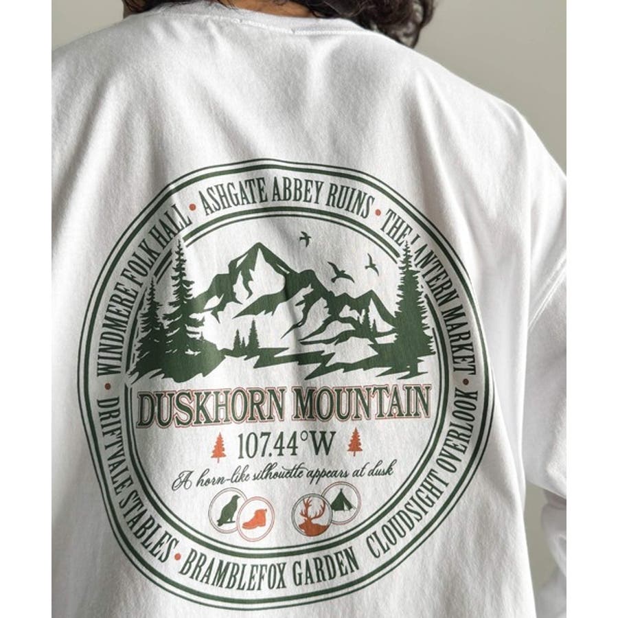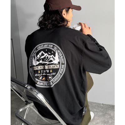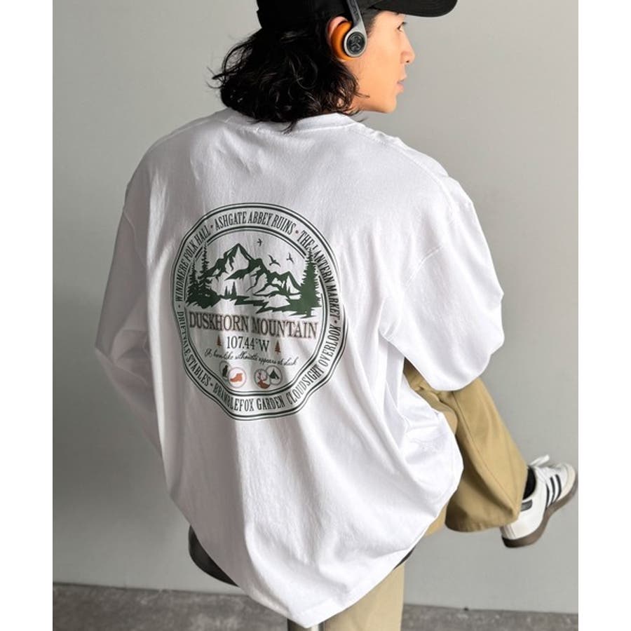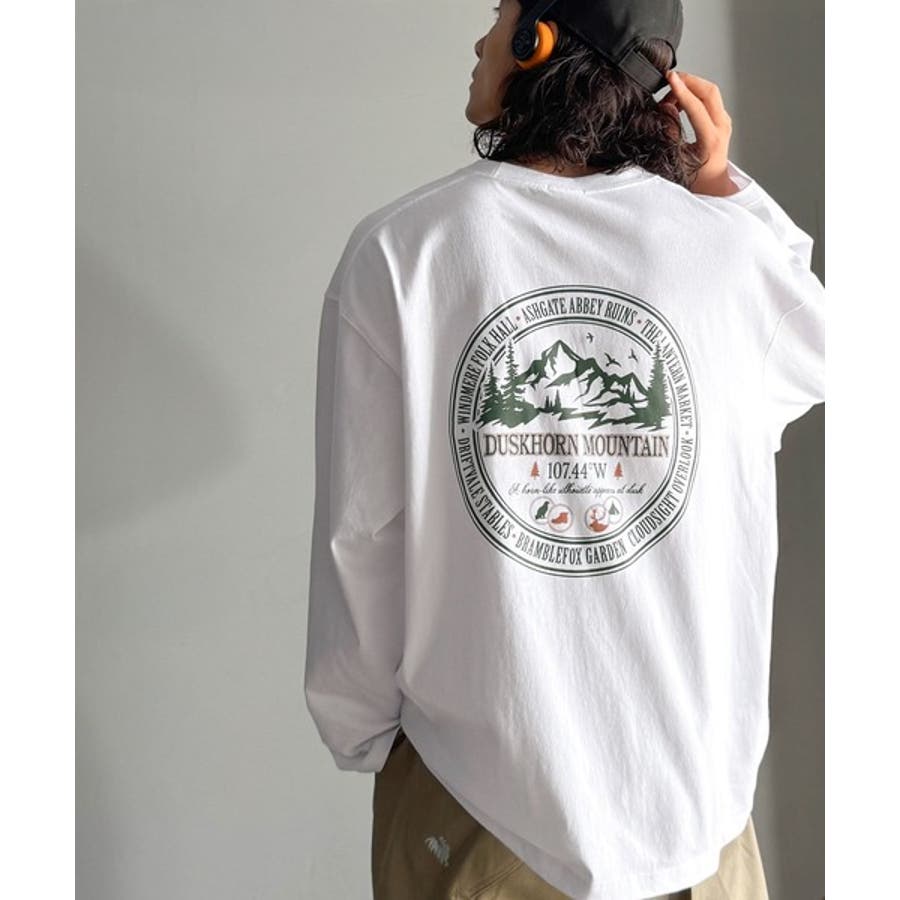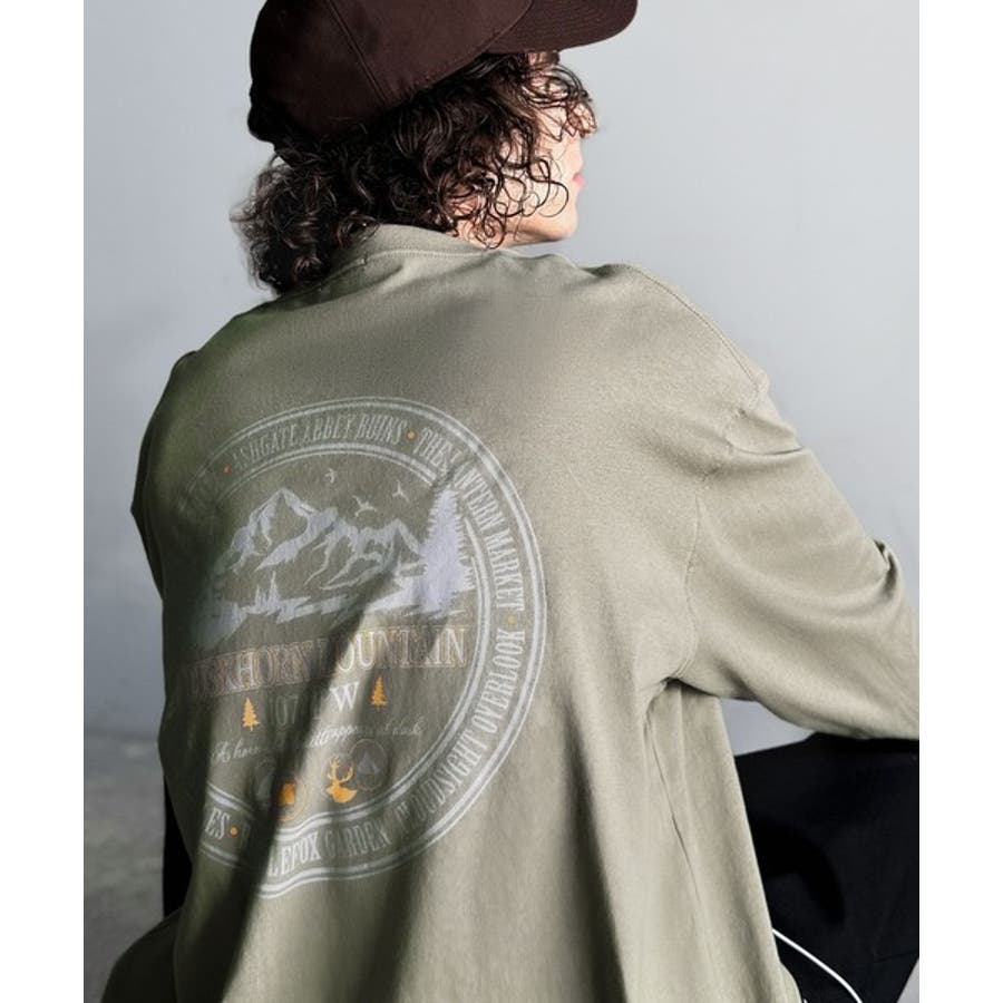 フロントとバックに山岳をモチーフにしたグラフィックプリントを施した一枚。