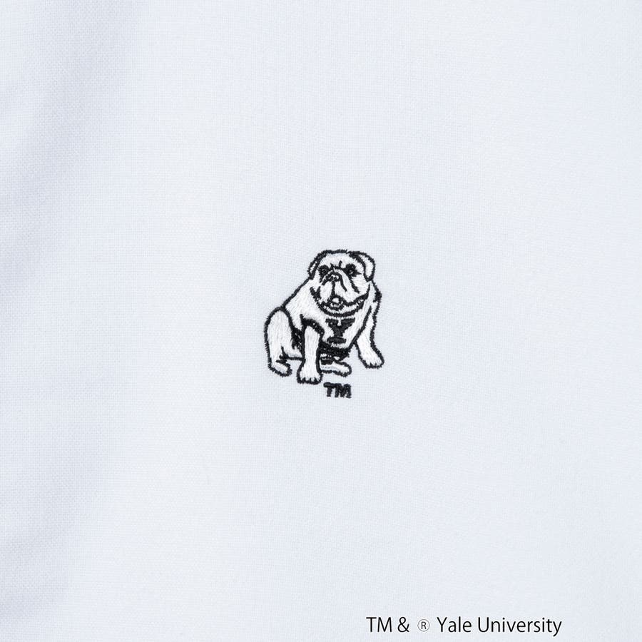左胸元に施した米国の名門校「YALE大学」のマスコットキャラクターであるブルドッグ犬の「ハンサム・ダン」のワンポイント刺繍がさりげなくアクセントに。
