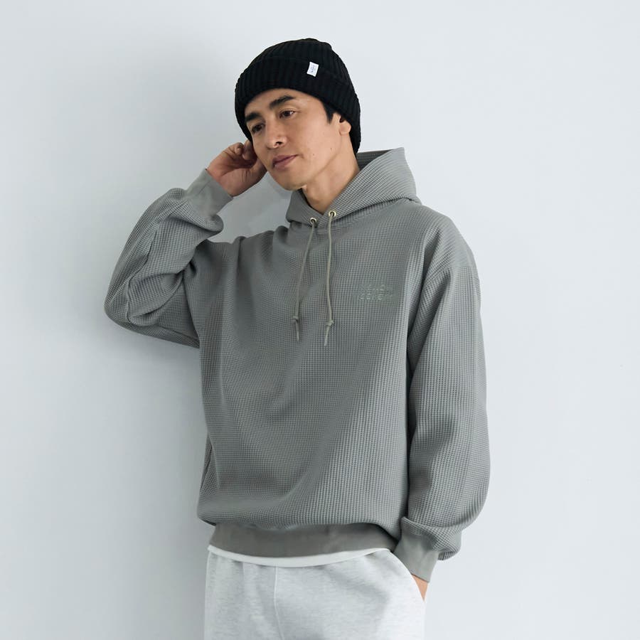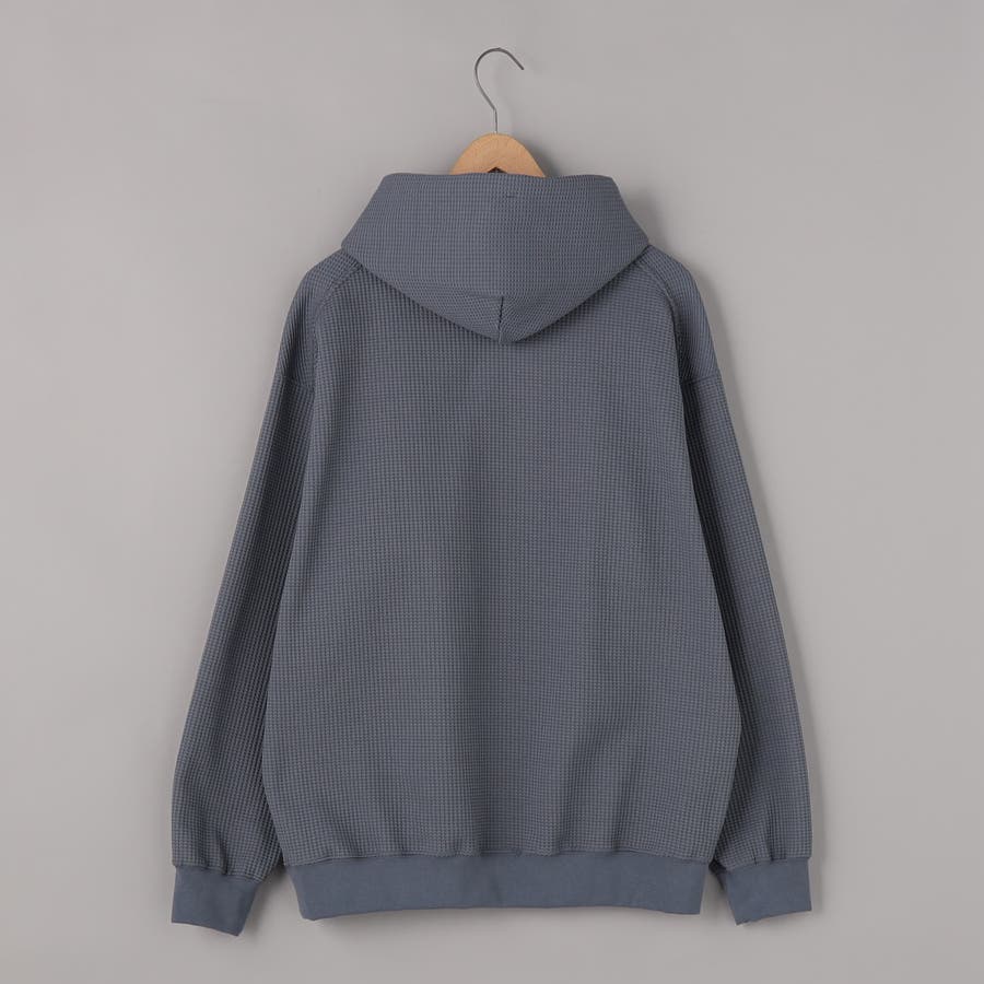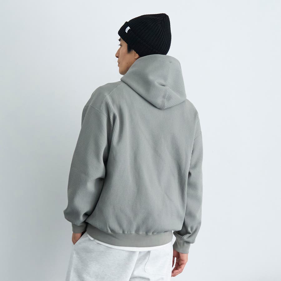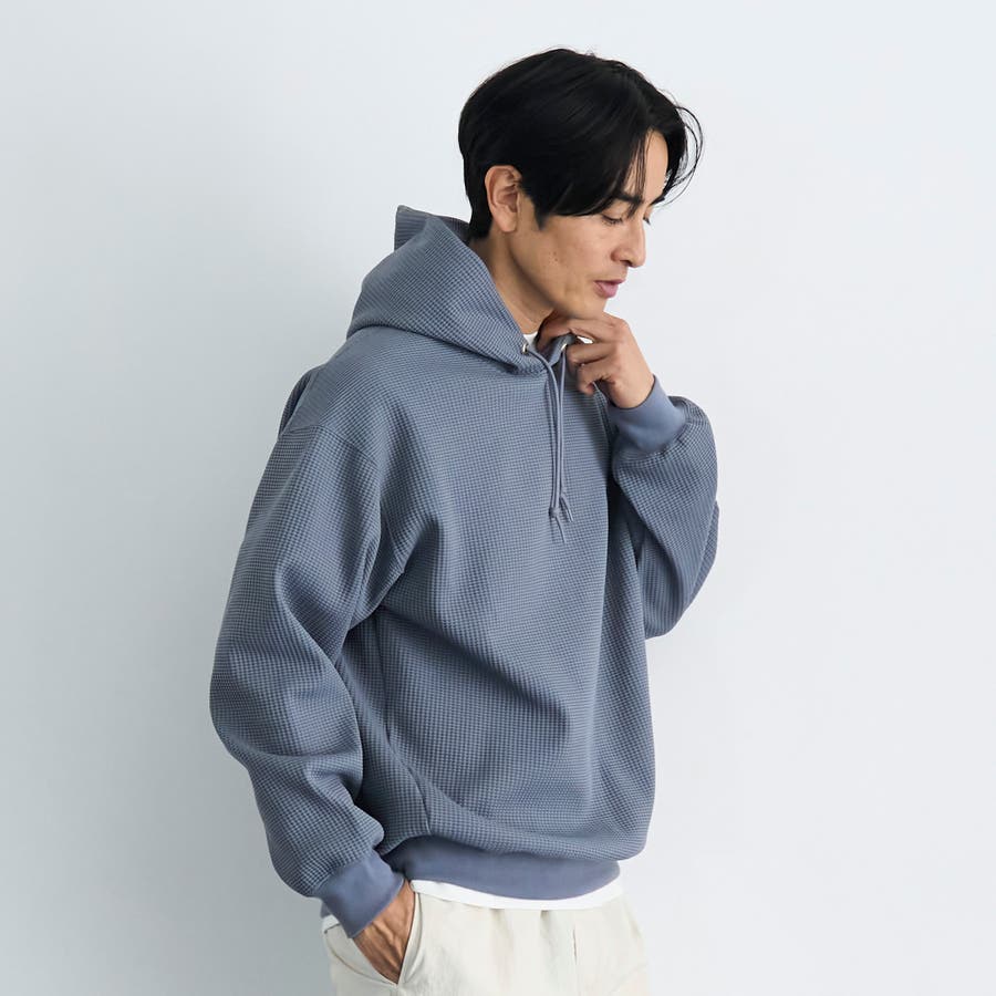 ワッフル素材を僅かに裏起毛させ、柔らく暖かみのある肌触りに仕上げたワッフルパーカー。