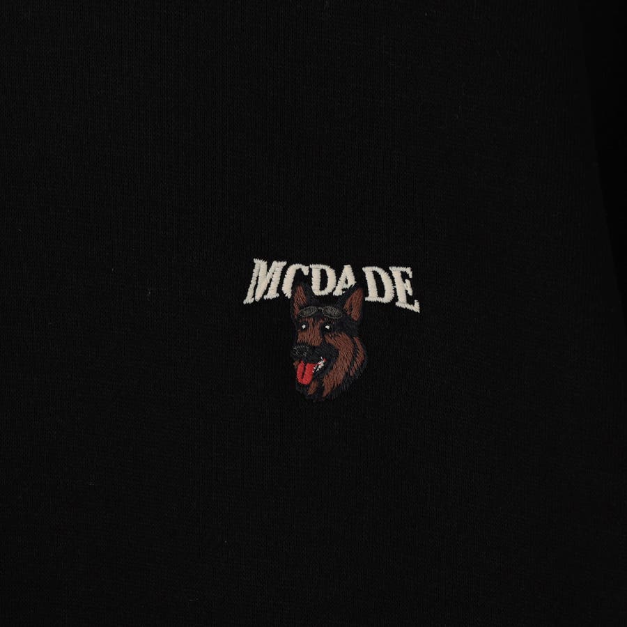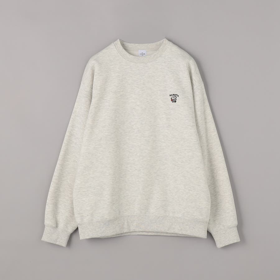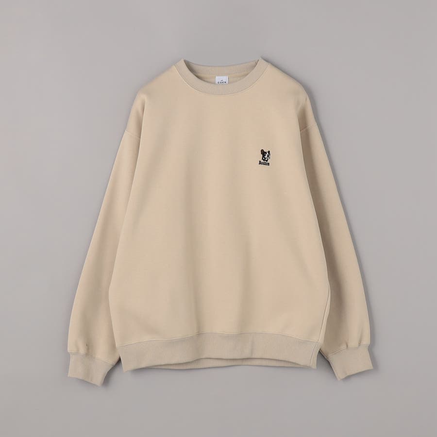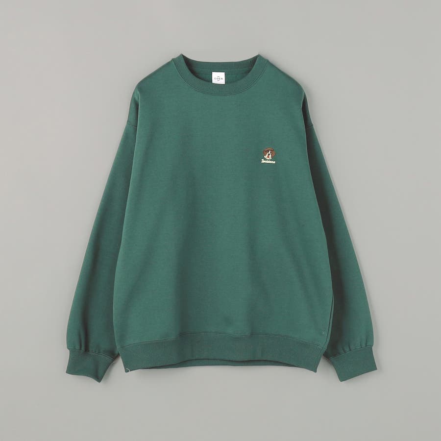 ヘッドホンや蝶ネクタイを付けた犬の刺繍を、さりげなくあしらったクルーネックスウェット。