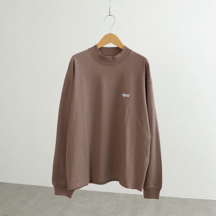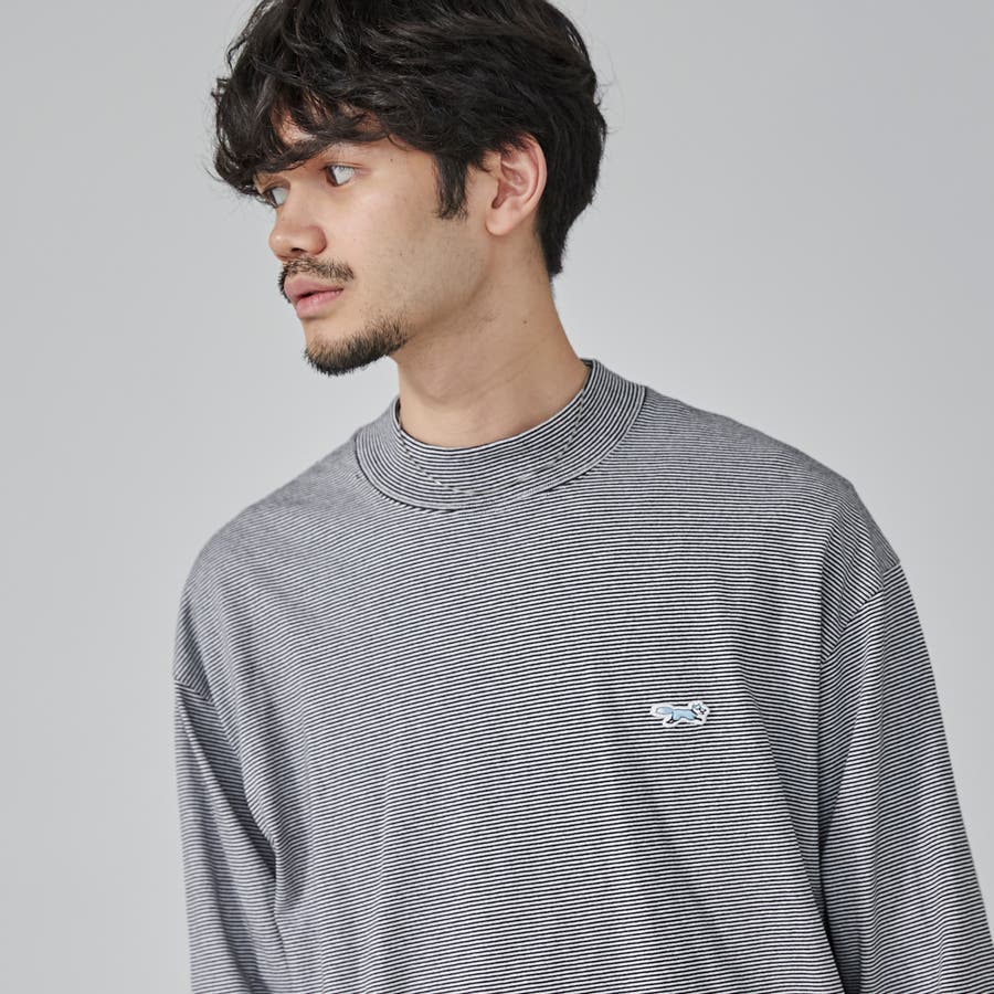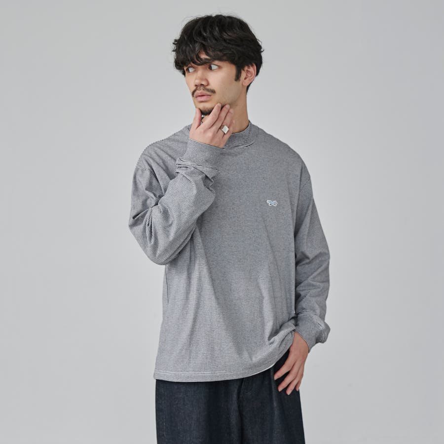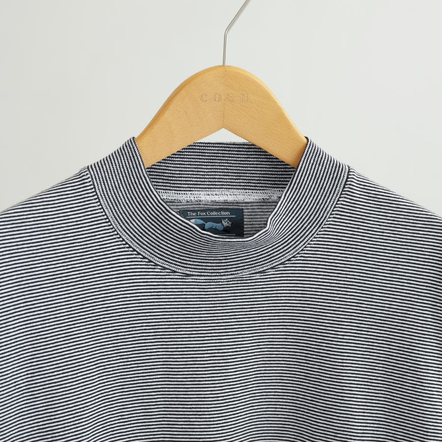 ピッチの細いボーダーでデザインした時代性を感じられるモックネックロンTです。