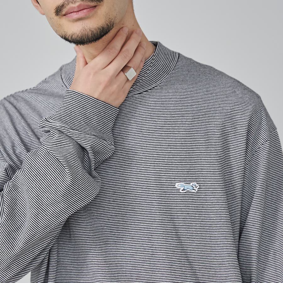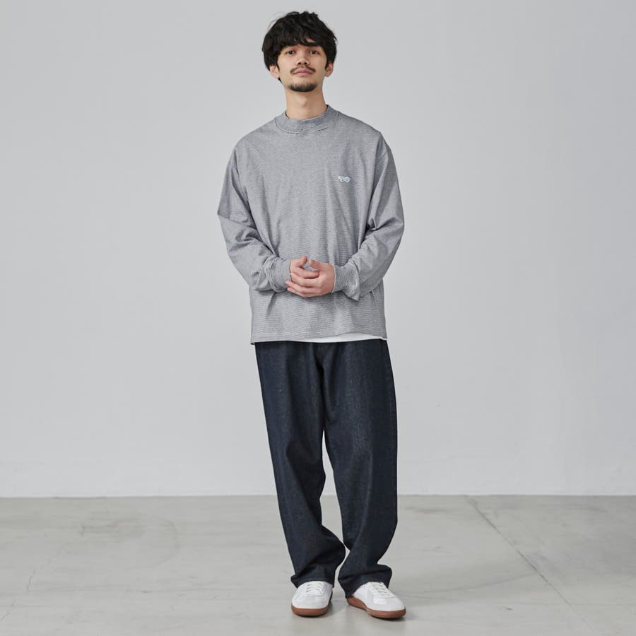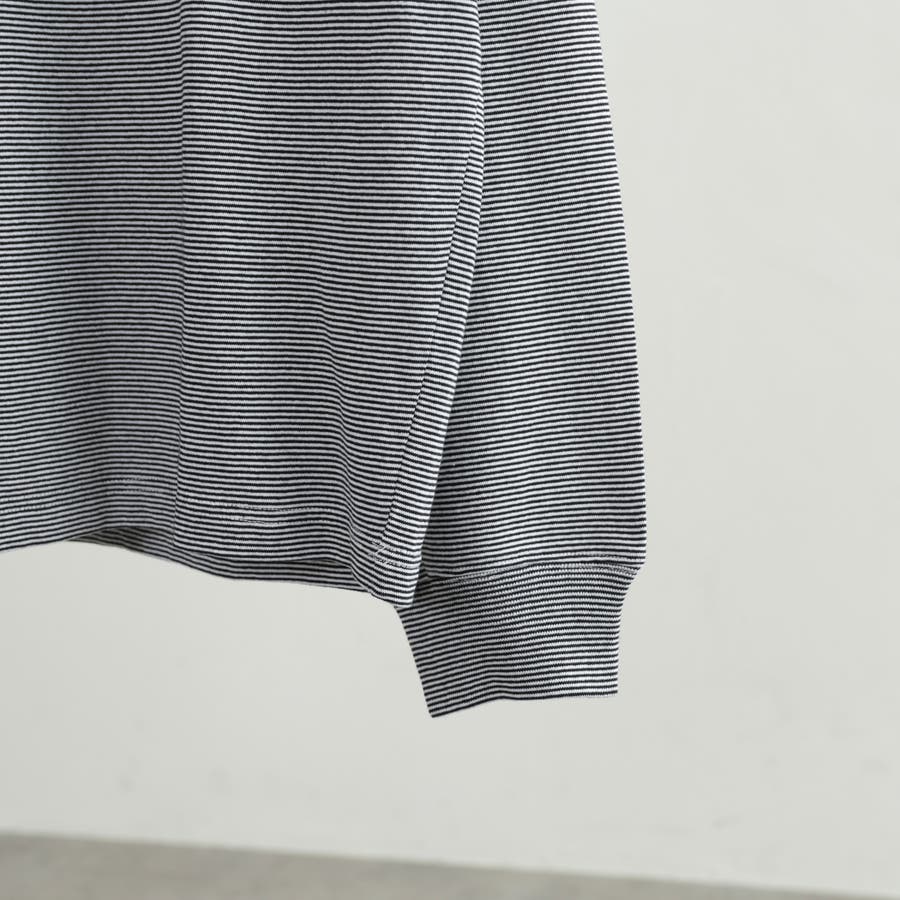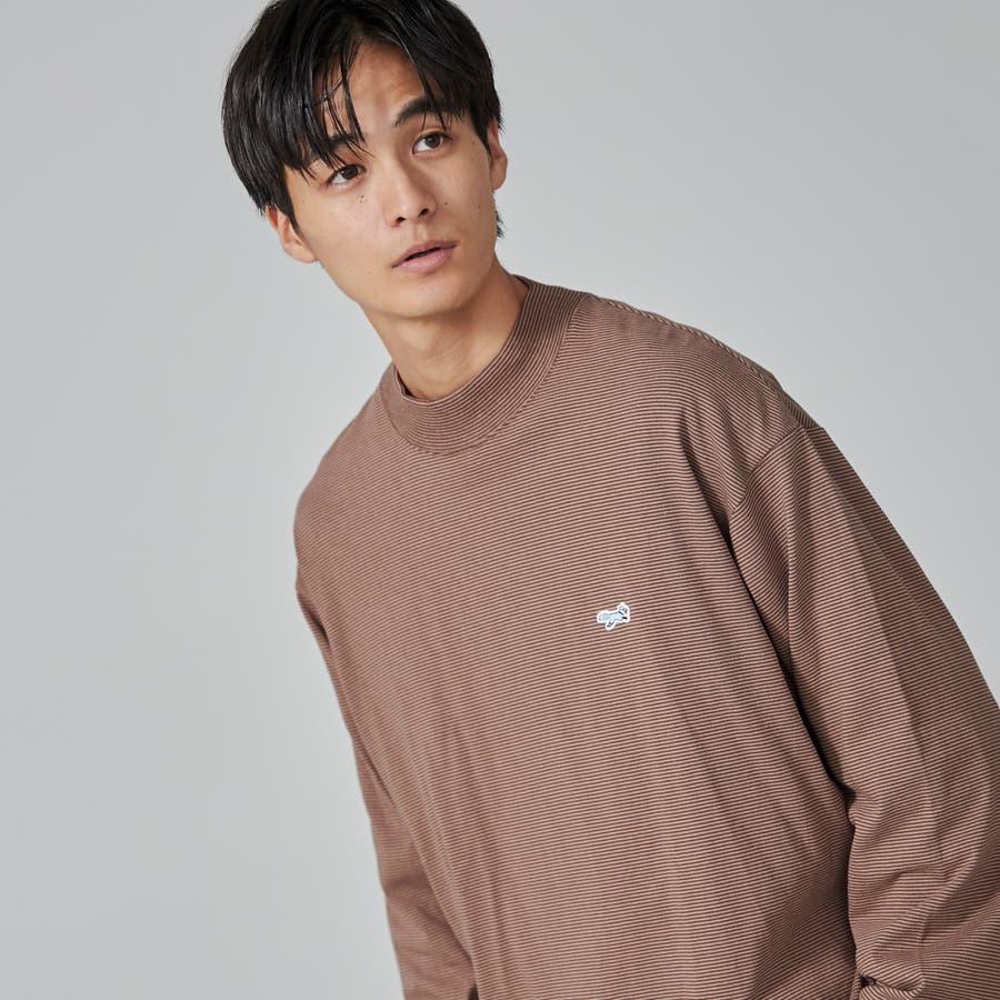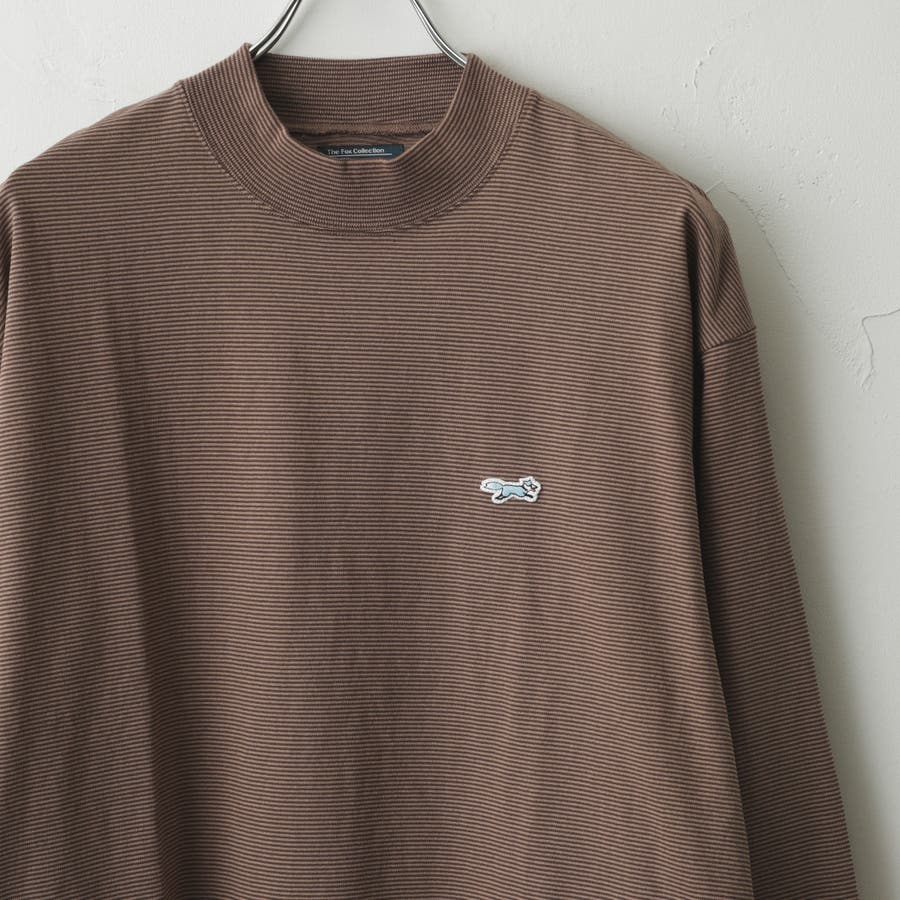 ピッチの細いボーダーでデザインした時代性を感じられるモックネックロンTです。