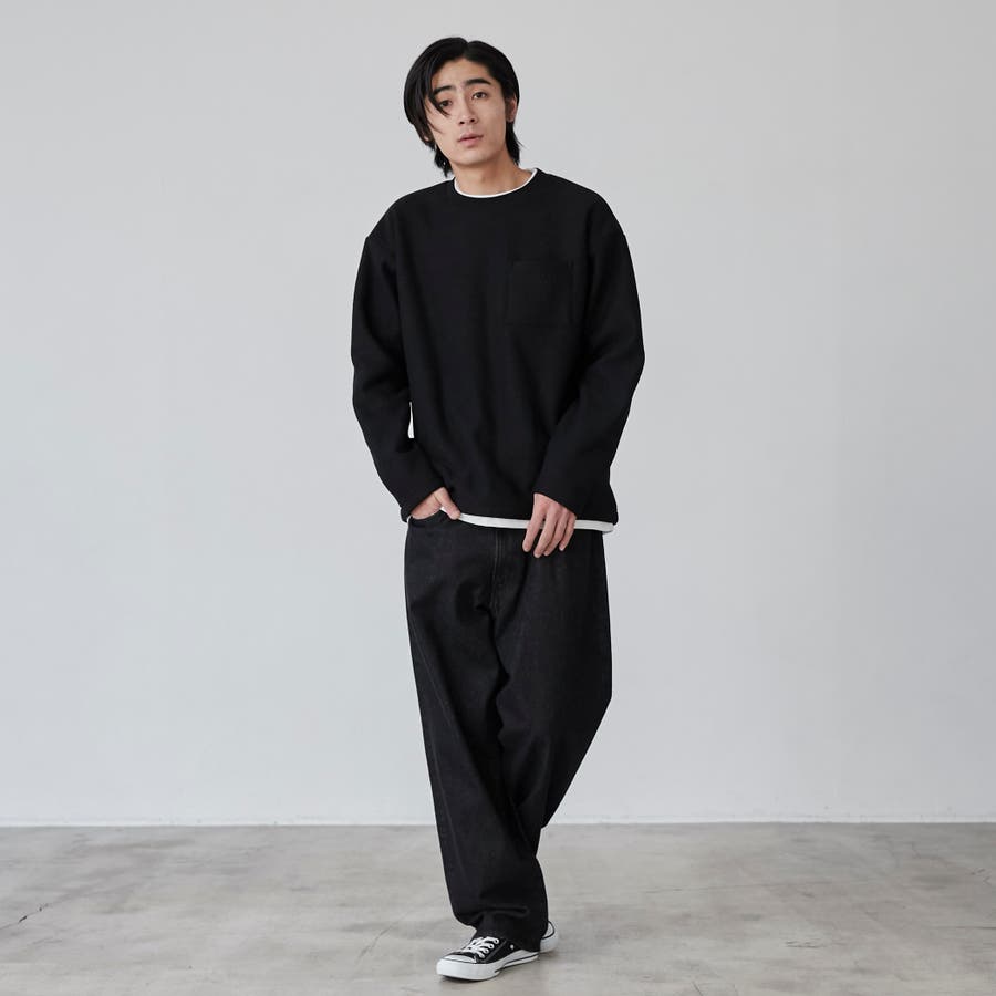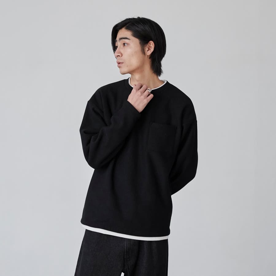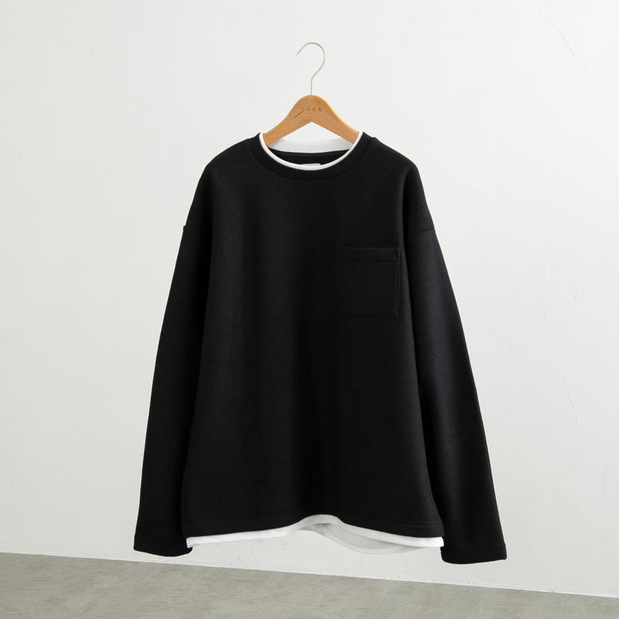 フェイク仕様のインナーがチラッと見えるようにデザインされたレイヤードスウェット。