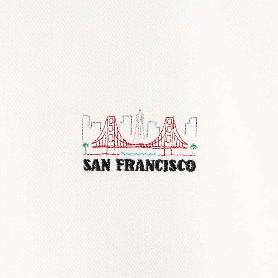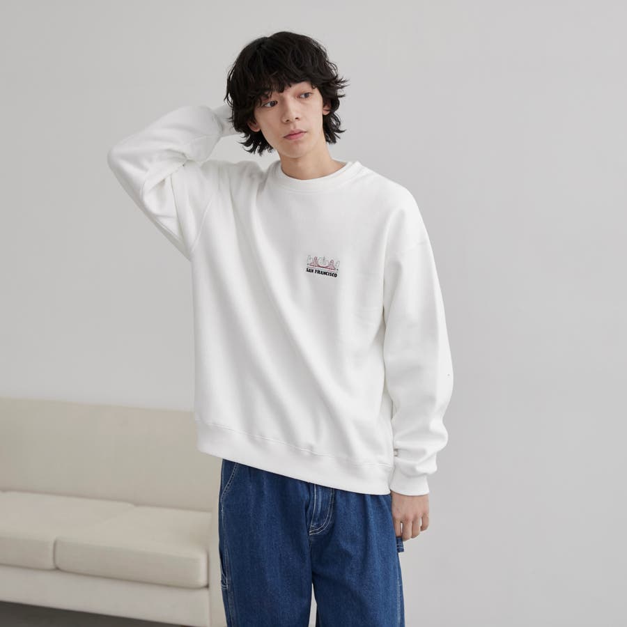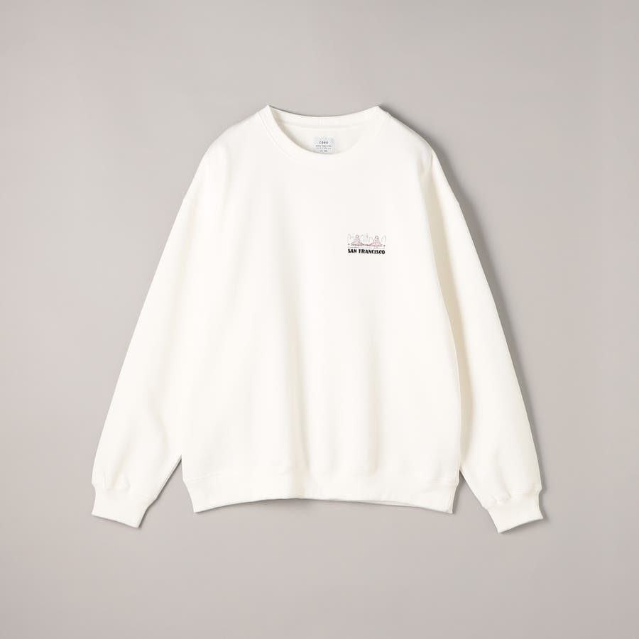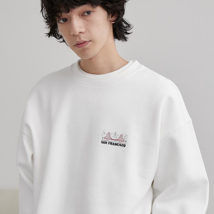 アメリカの都市や州の名称を、多様なタッチの刺繍で表現したクルーネックスウェット。