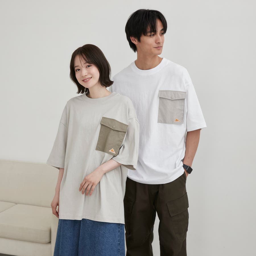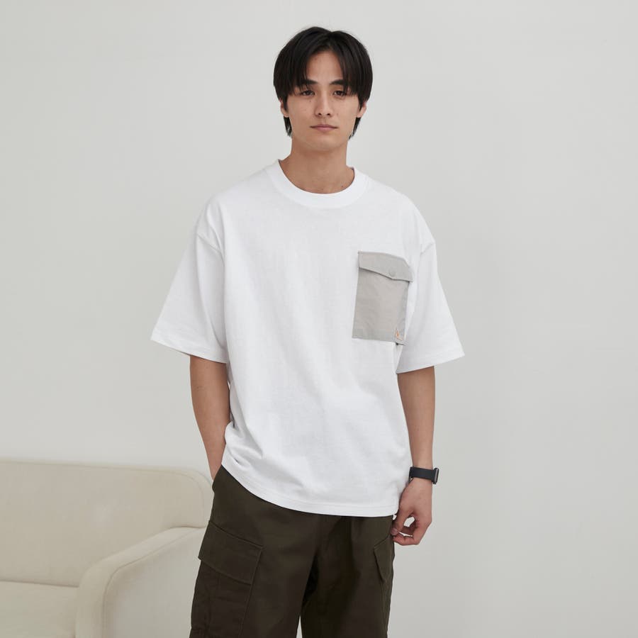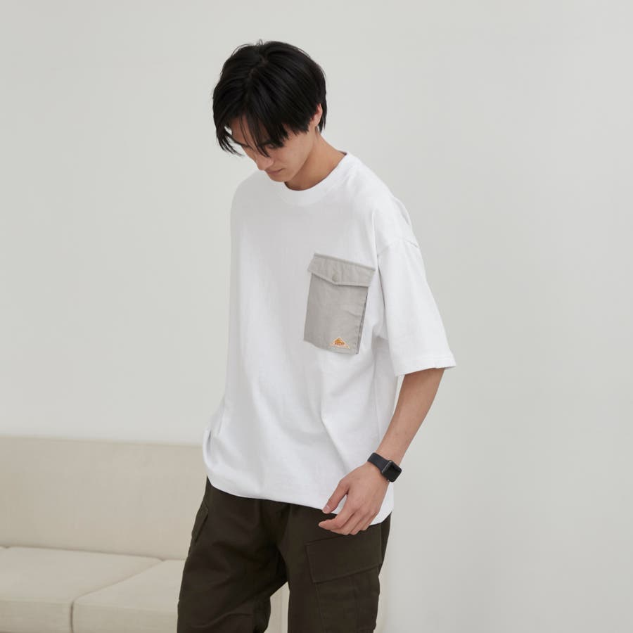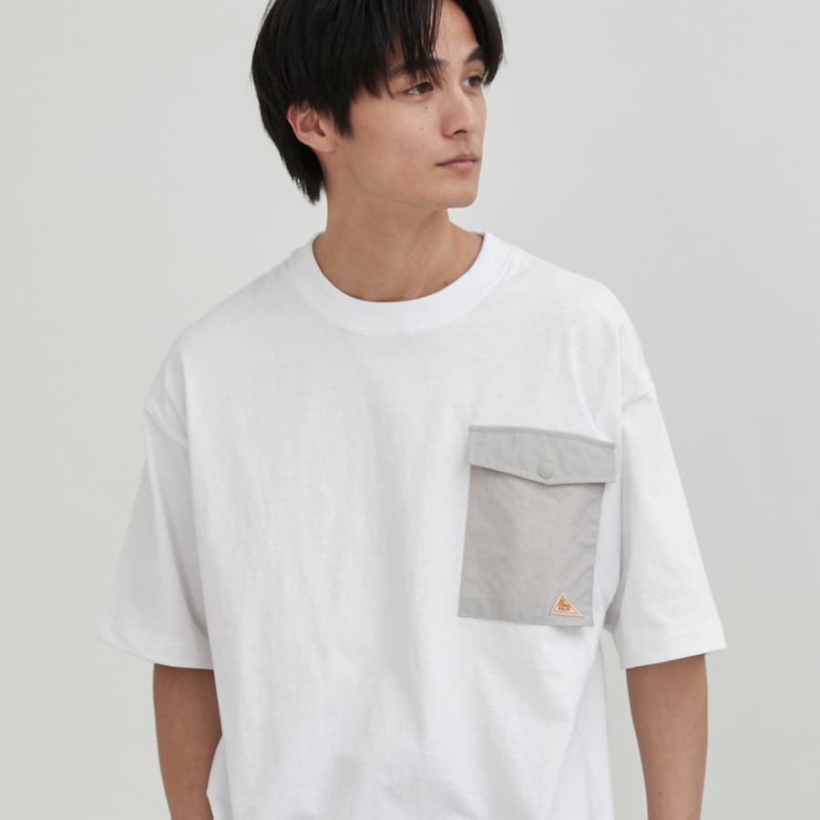 シンプルなデザインに、フラップ付き別布ポケットがアクセントとなった半袖Tシャツ。