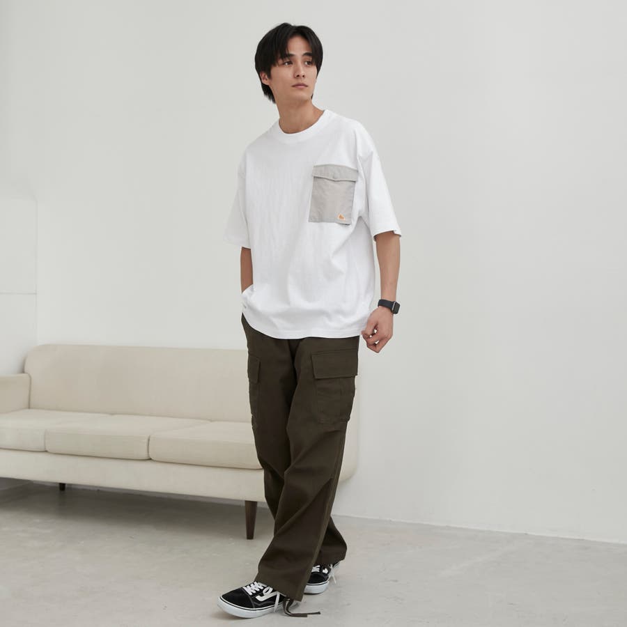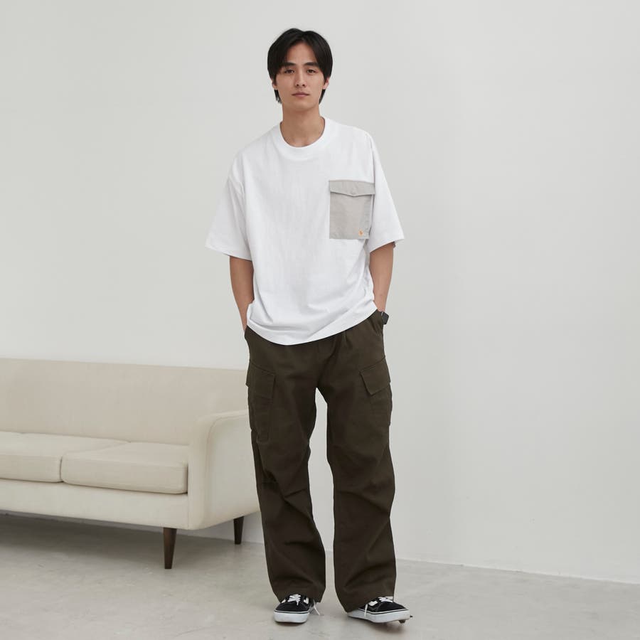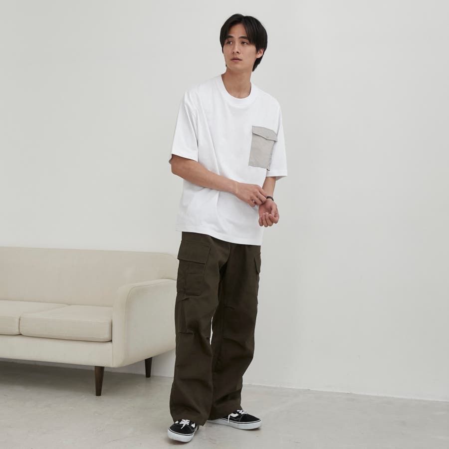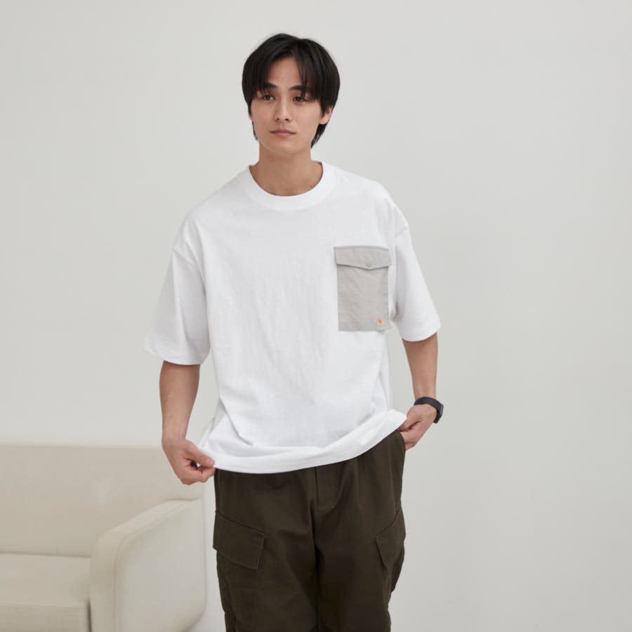 シンプルなデザインに、フラップ付き別布ポケットがアクセントとなった半袖Tシャツ。