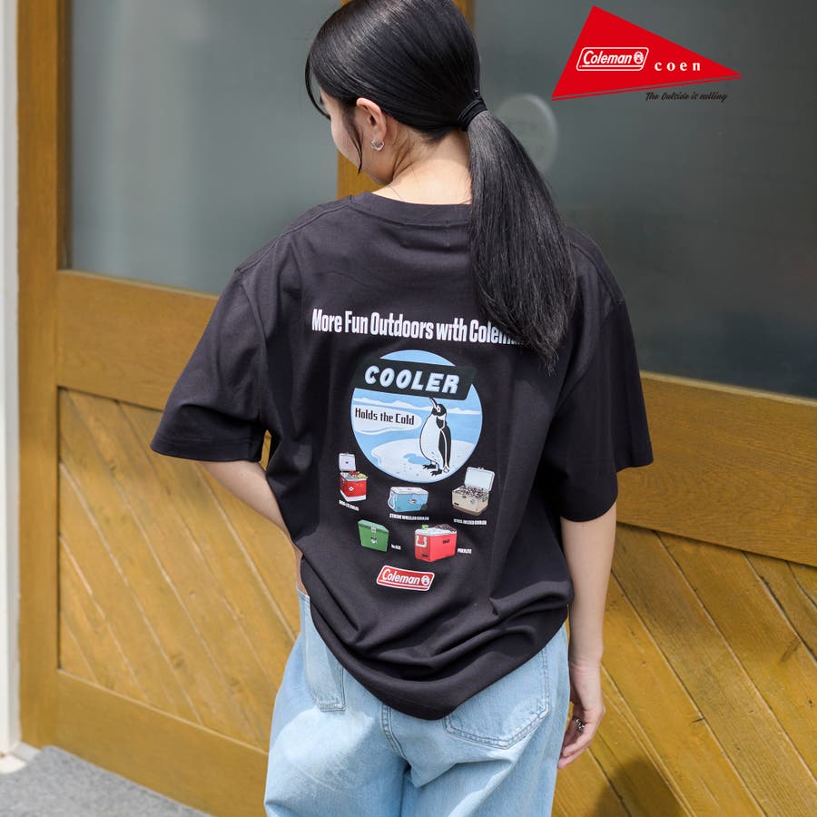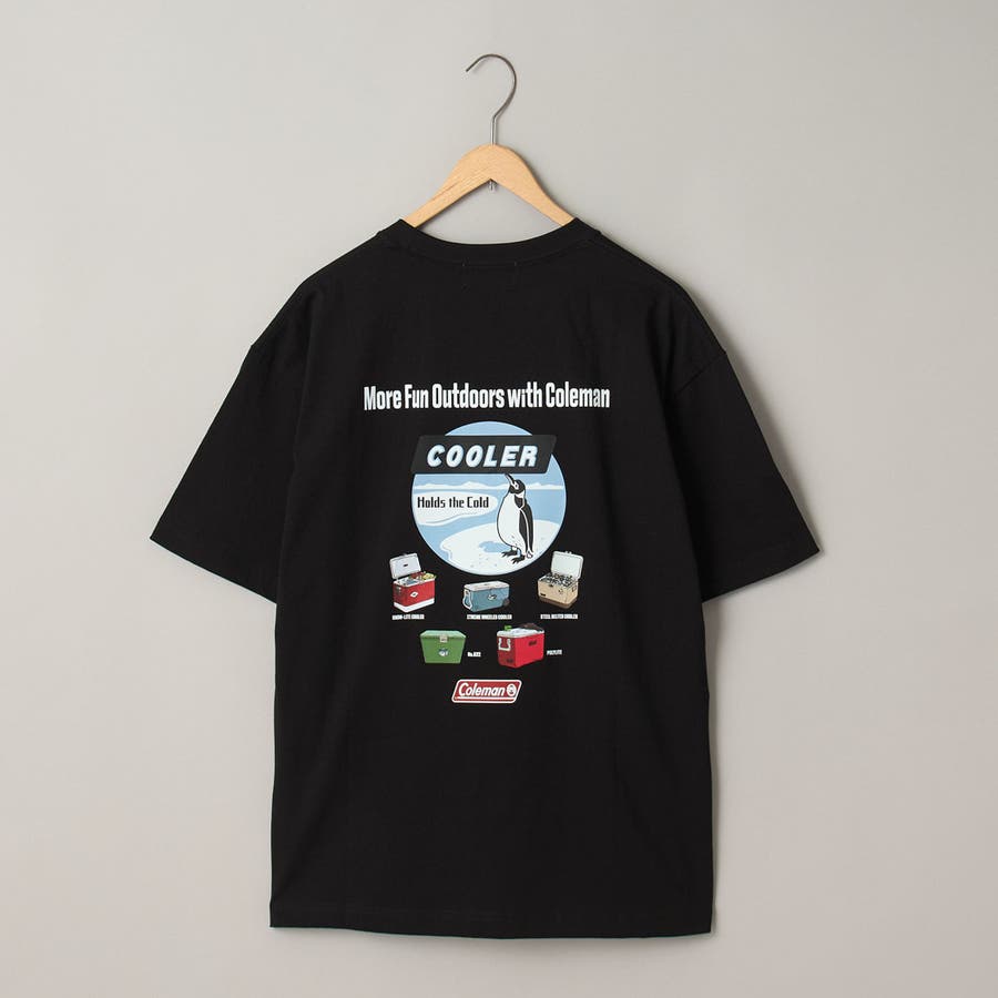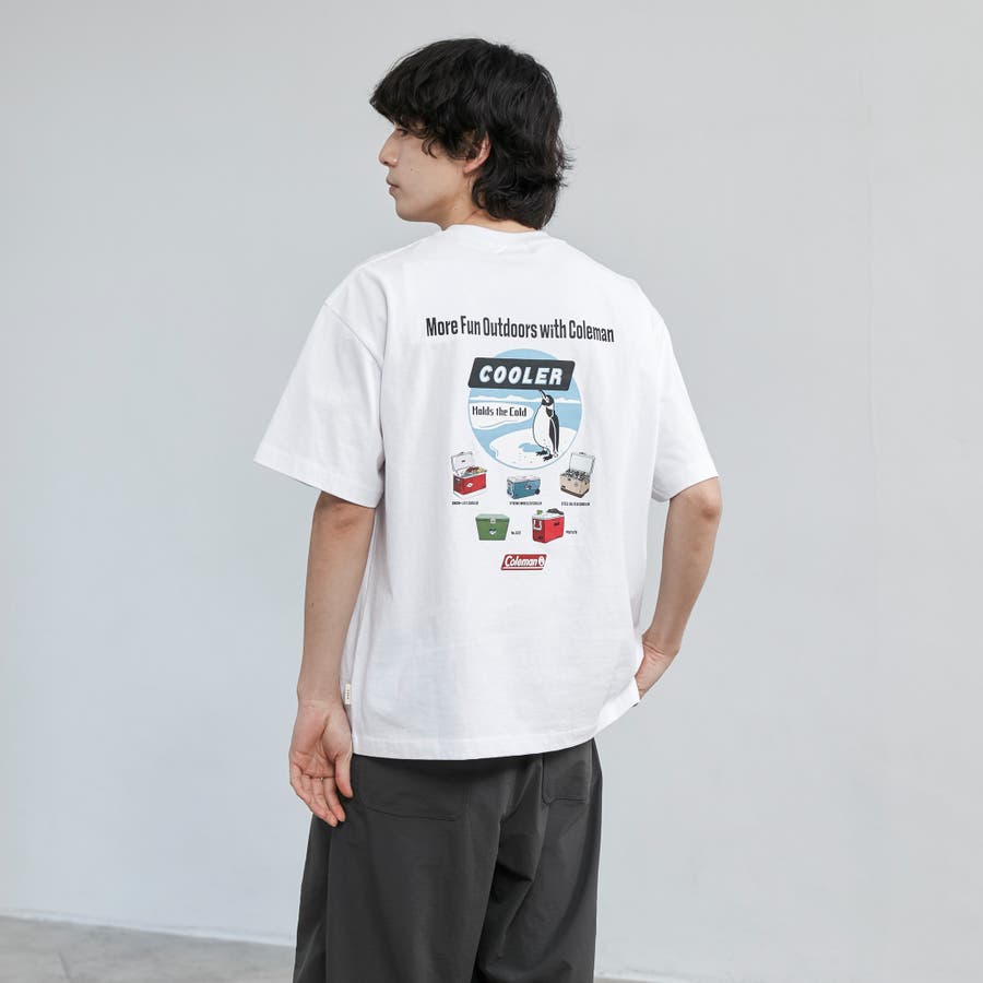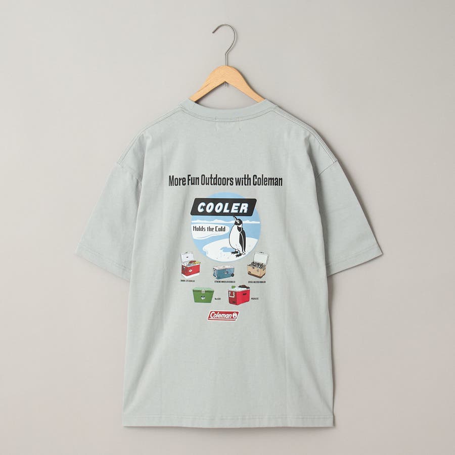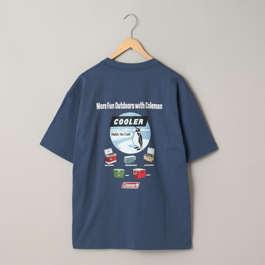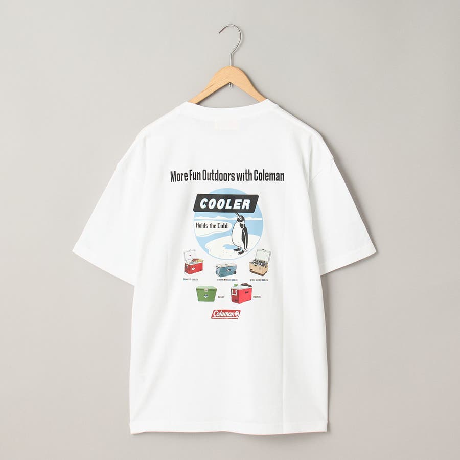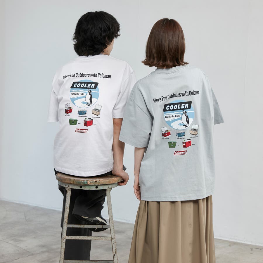 バックに涼し気なペンギンとコールマンのクーラーボックスがプリントされ、アウトドアの楽しさを演出したプリントTシャツ。