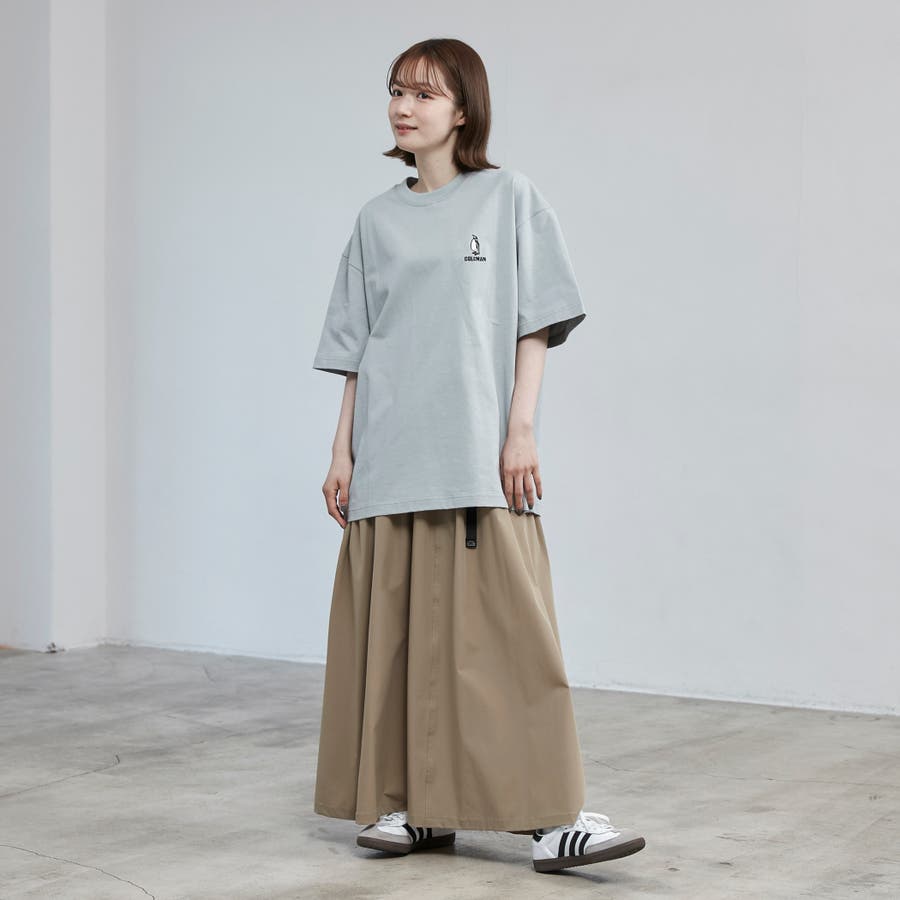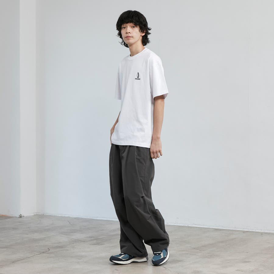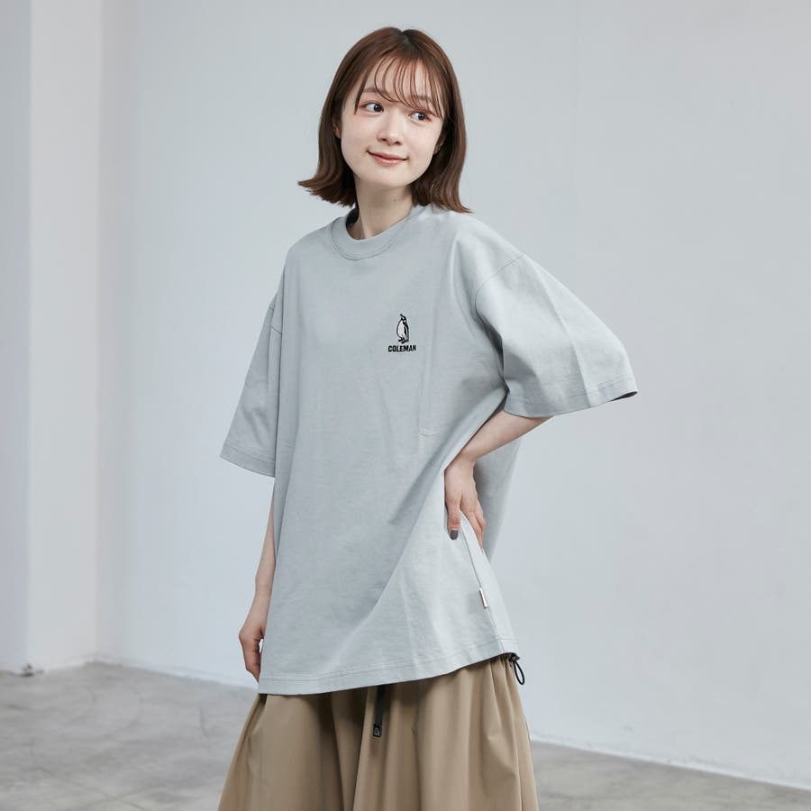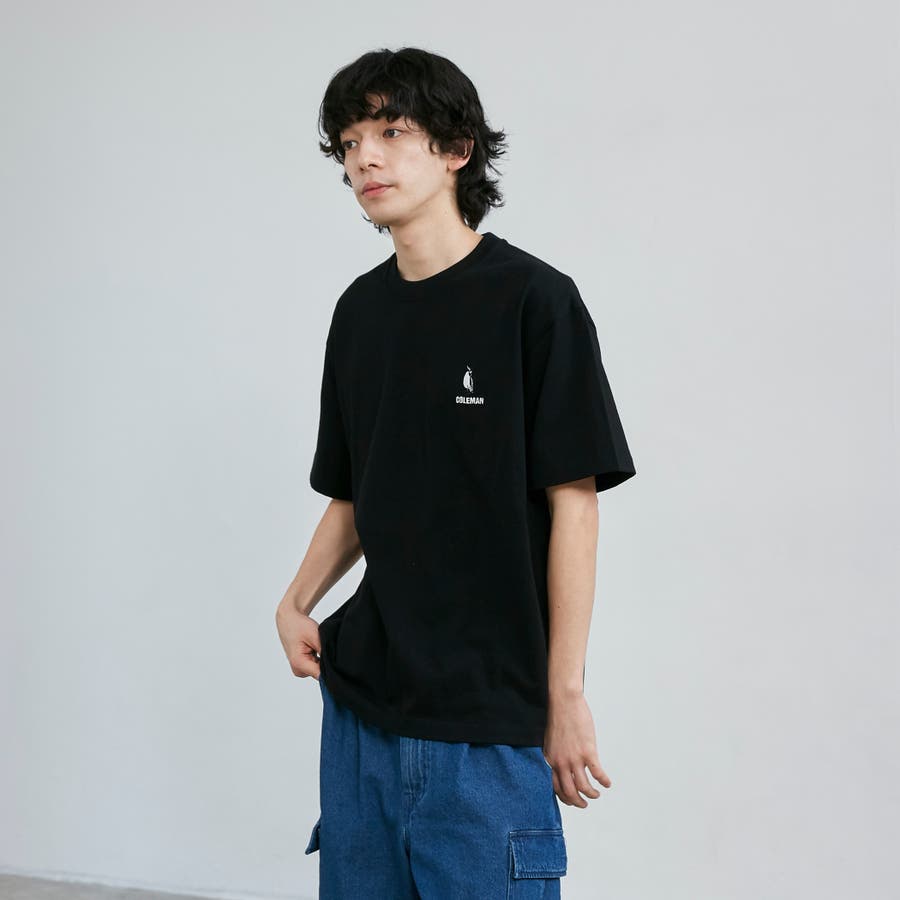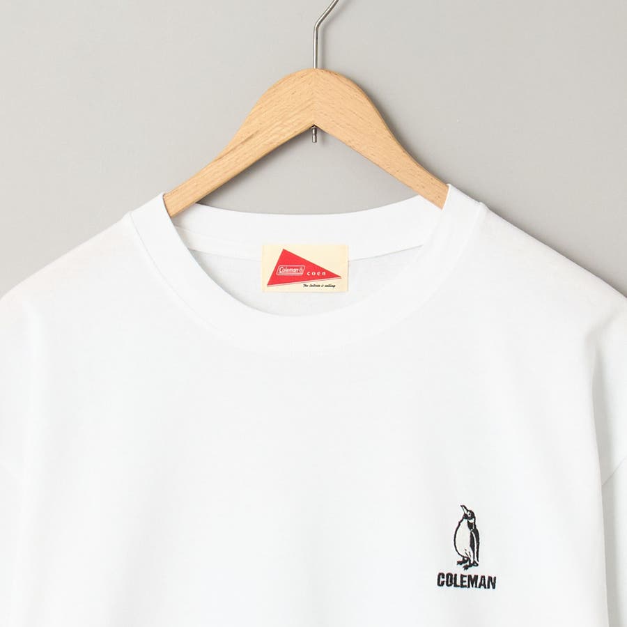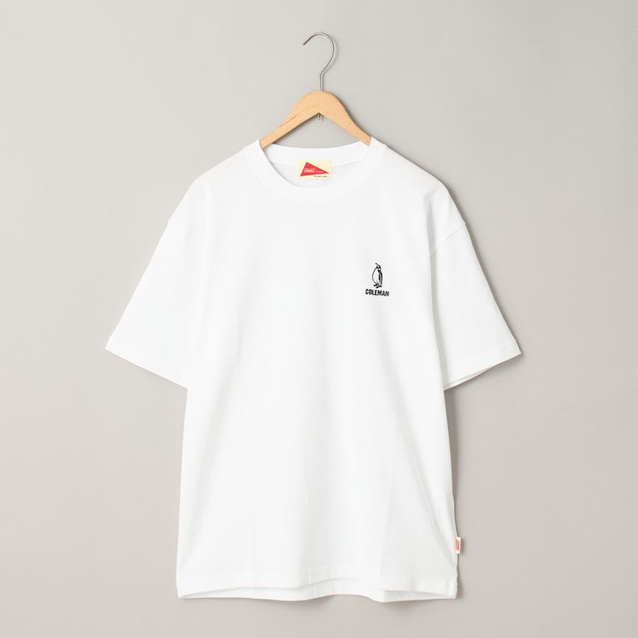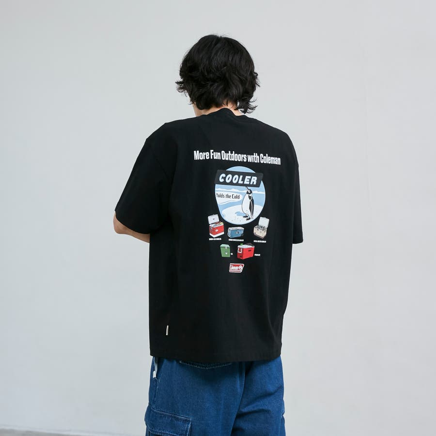 バックに涼し気なペンギンとコールマンのクーラーボックスがプリントされ、アウトドアの楽しさを演出したプリントTシャツ。