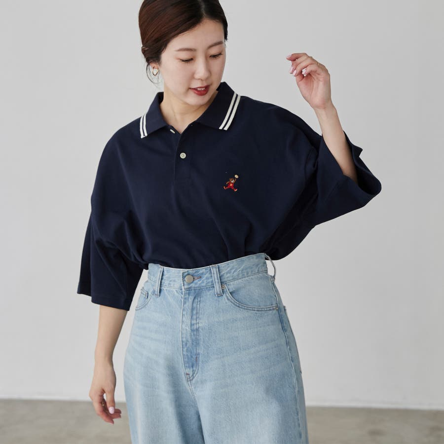 シンプルな無地のボディに、襟元のラインやスポーツをしているベアの刺繍がポイントで◎