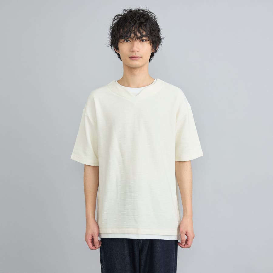 ネックと裾から覗くように別布を配したフェイクレイヤードTシャツ。