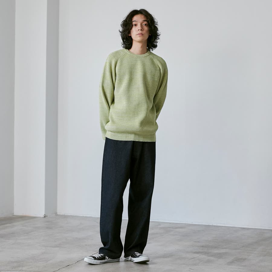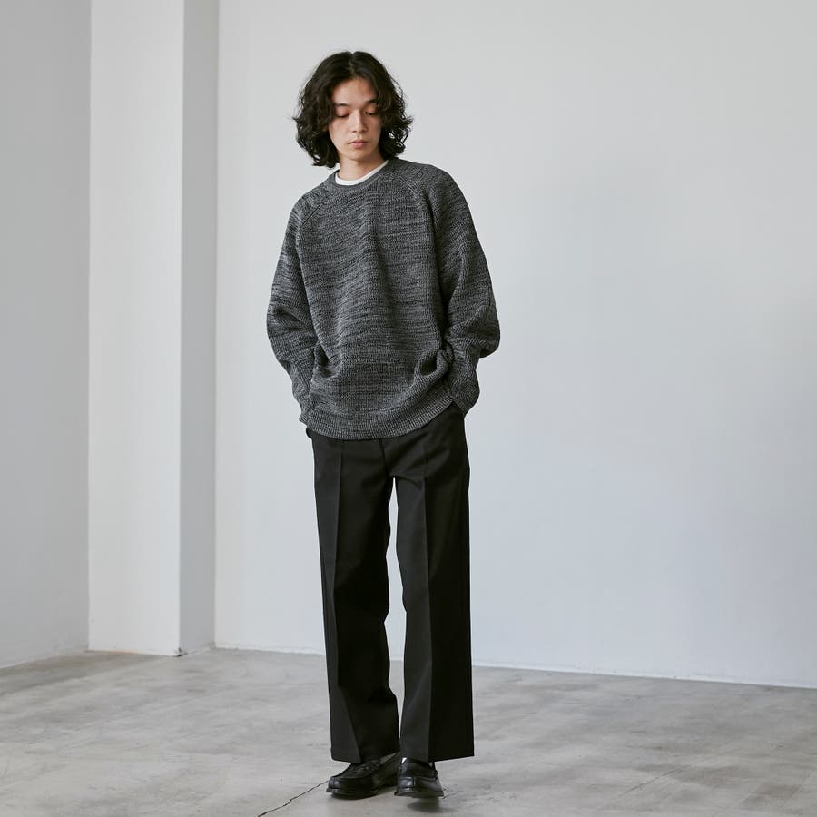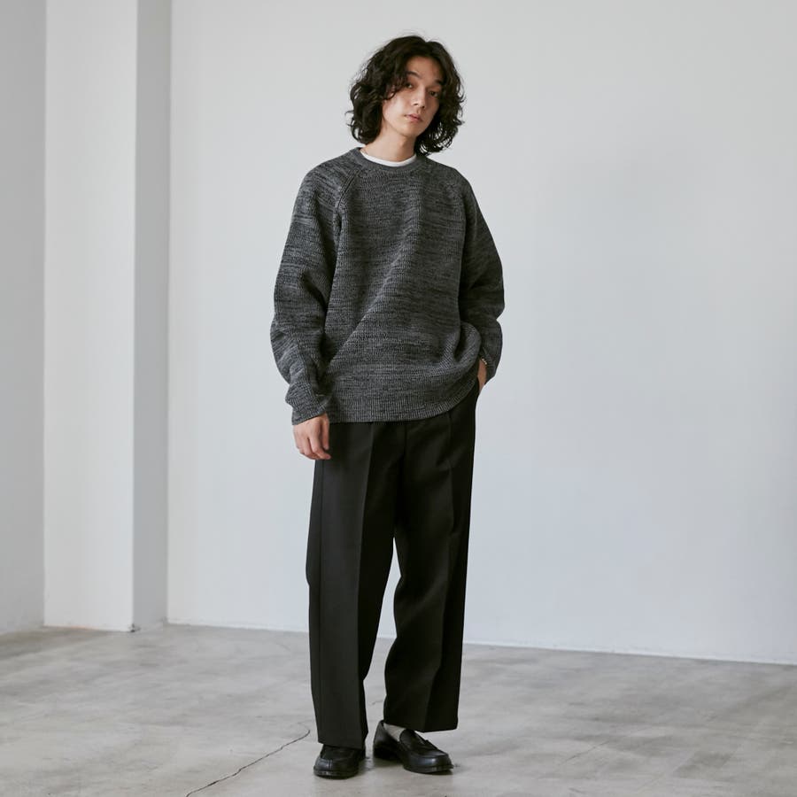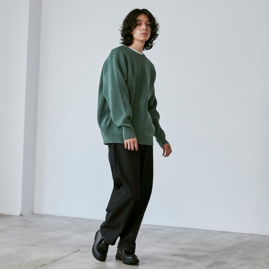 ニット素材特有の生地の伸びを感じられるので、動きやすく着心地のいい素材になります。