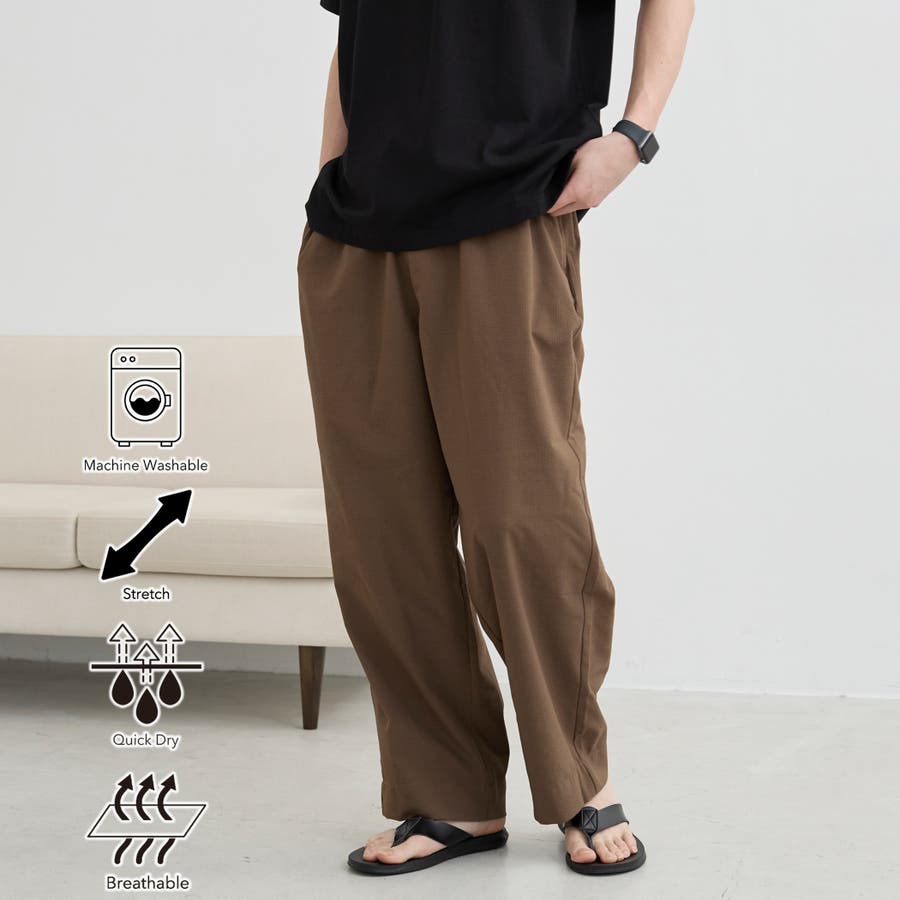 「すだれ」の構造に着目し、高い通気性と軽さを両立させた高機能快適ポリエステル素材「爽多(R)」を使用したイージーワイドパンツ。