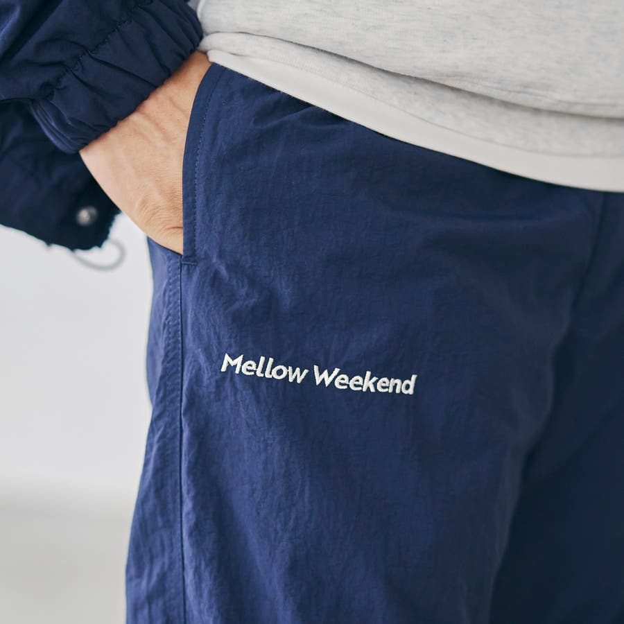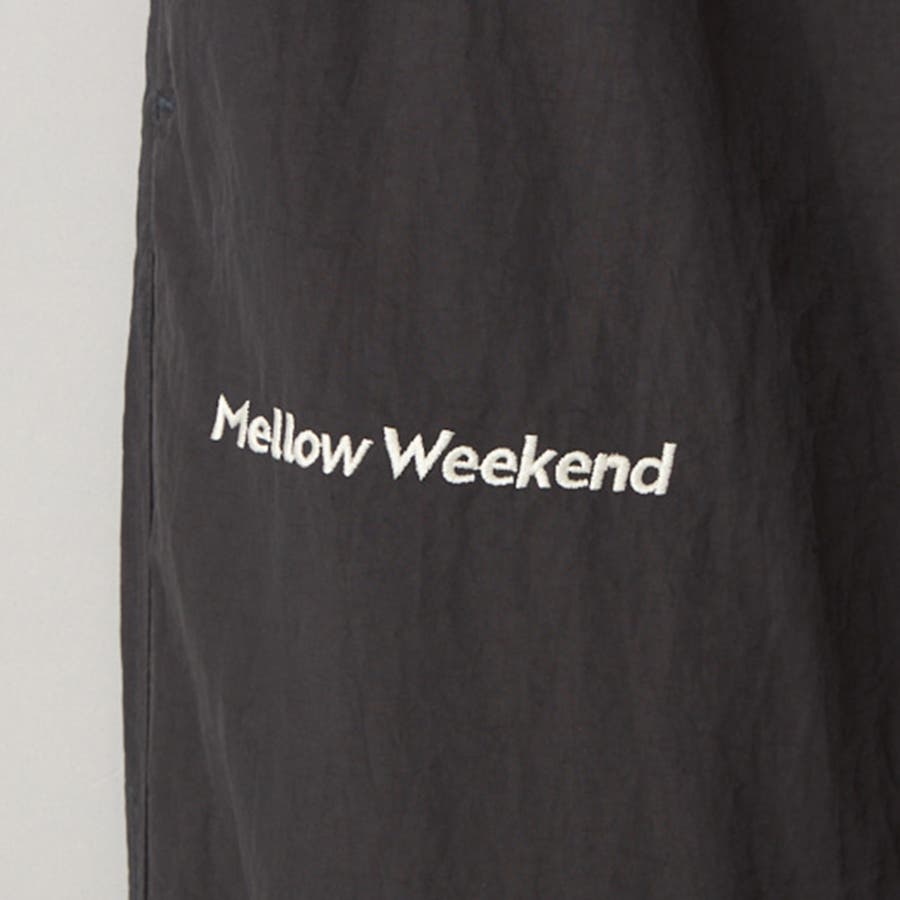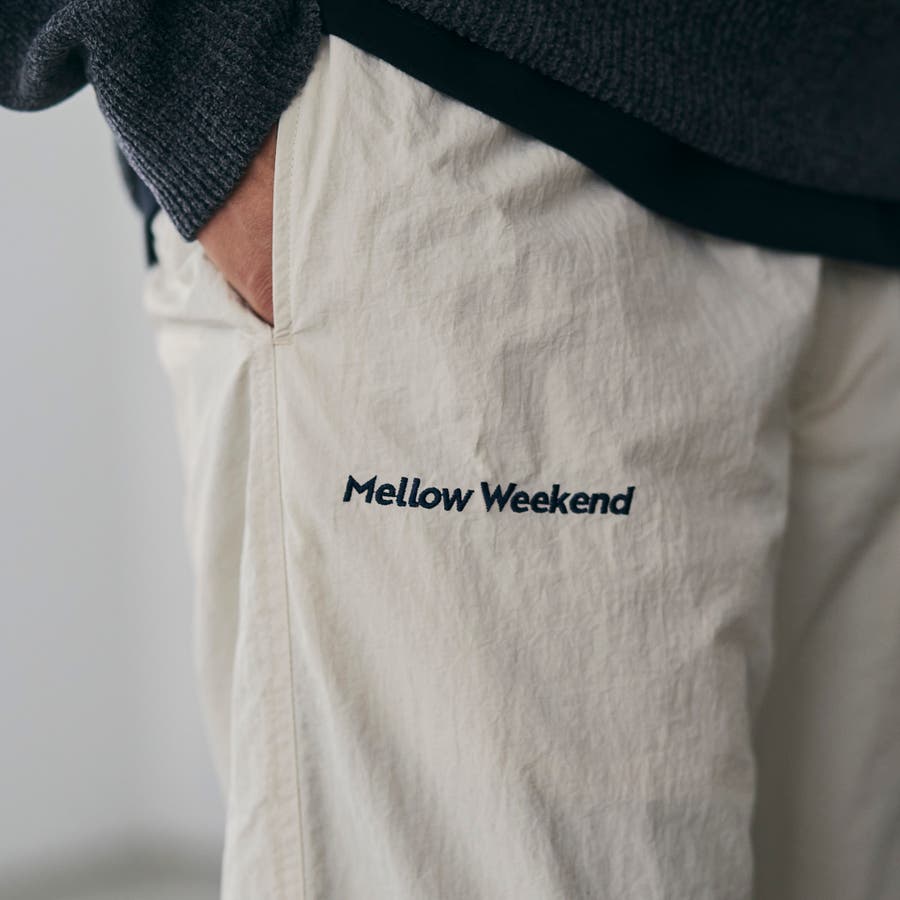 左腿にはヴィンテージライクなDISCUSロゴ、右腿にはCOENのディレクションテーマ「Mellow weekend」をあしらい、さりげないアクセントに。
