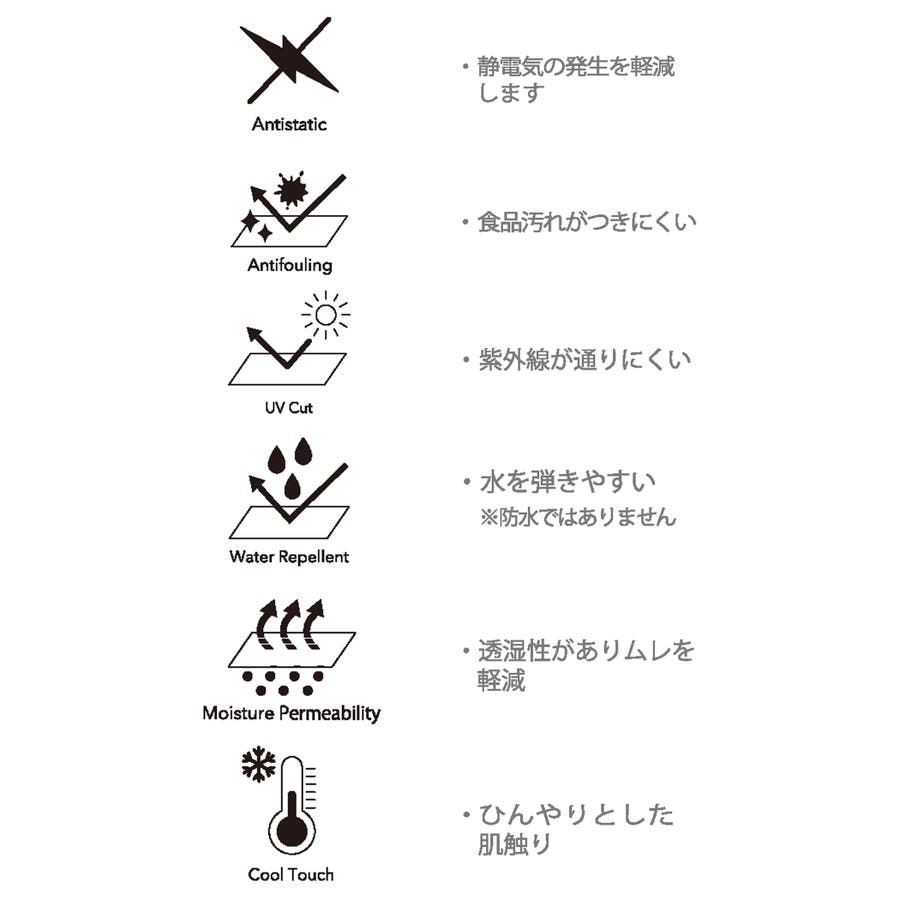 機能性:帯電防止性、防汚(食品汚れ)性、UVカット性、撥水性、透湿性、接触冷感性