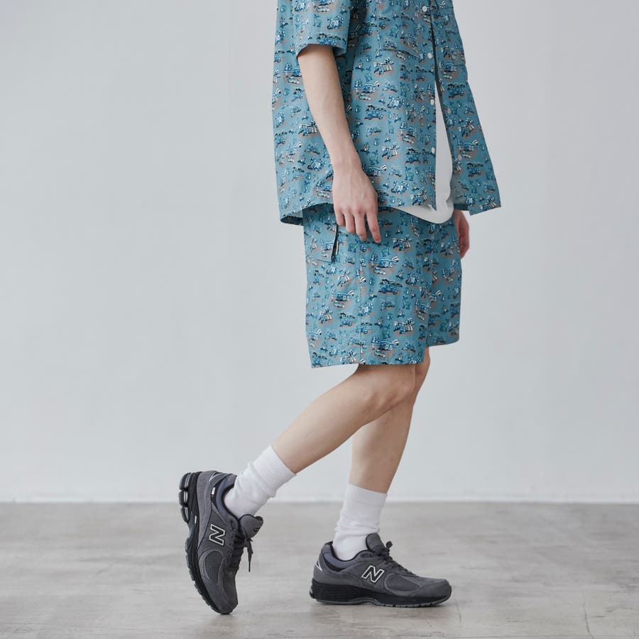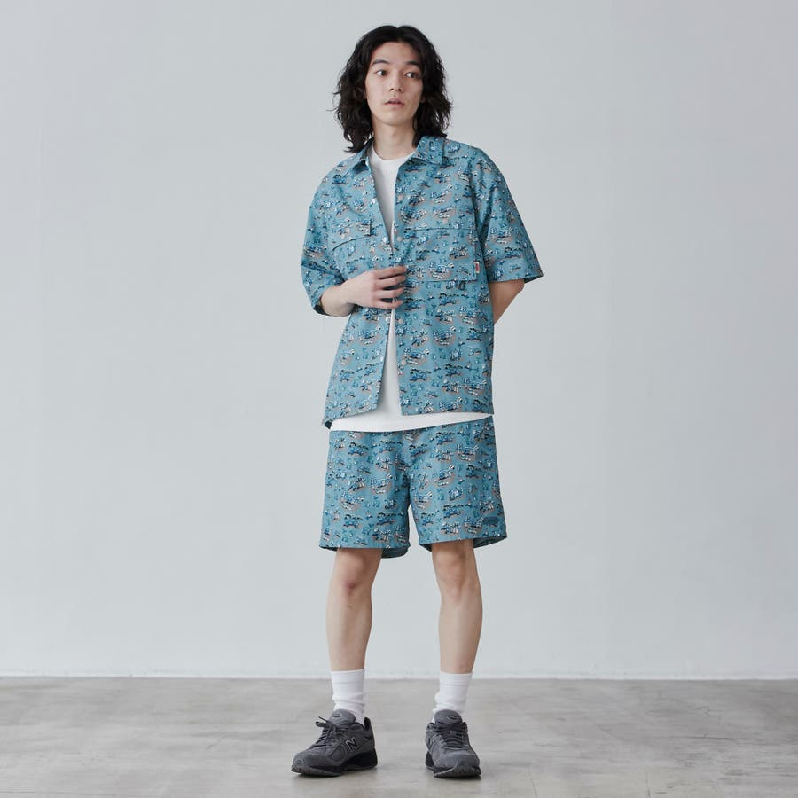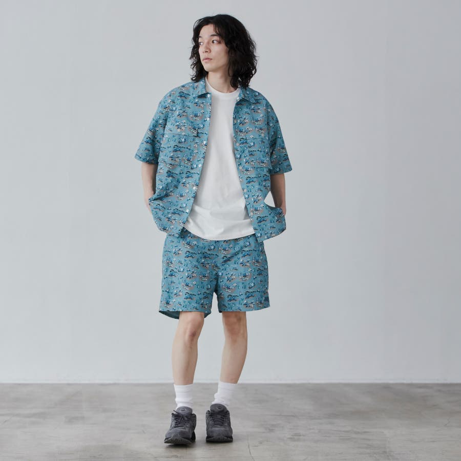 アウトドアシーンを彷彿とさせる柄模様を全体に配した、着るだけで様になる1枚。