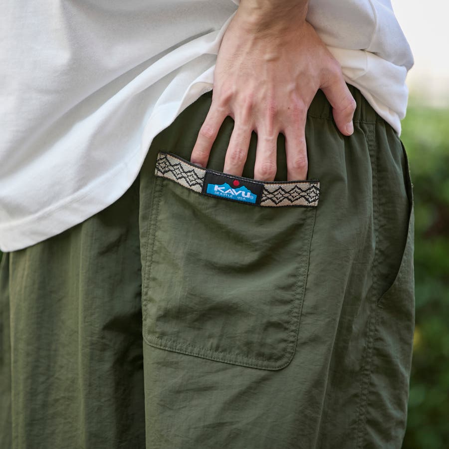 ウェービングベルトの先端部分にはKAVUのロゴ、後ろ右ポケットにはWAVING テープがアクセントになった1枚。
