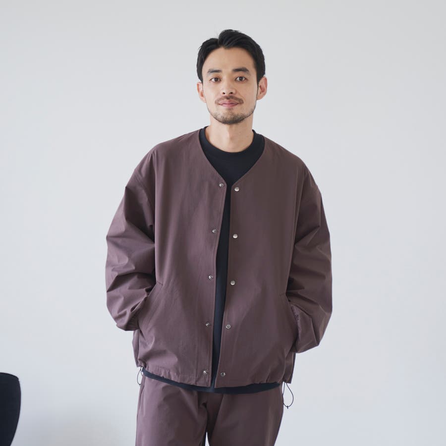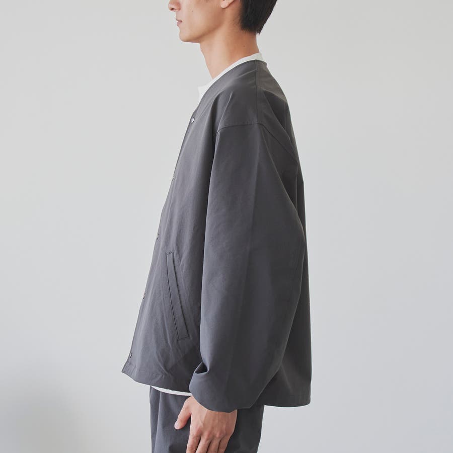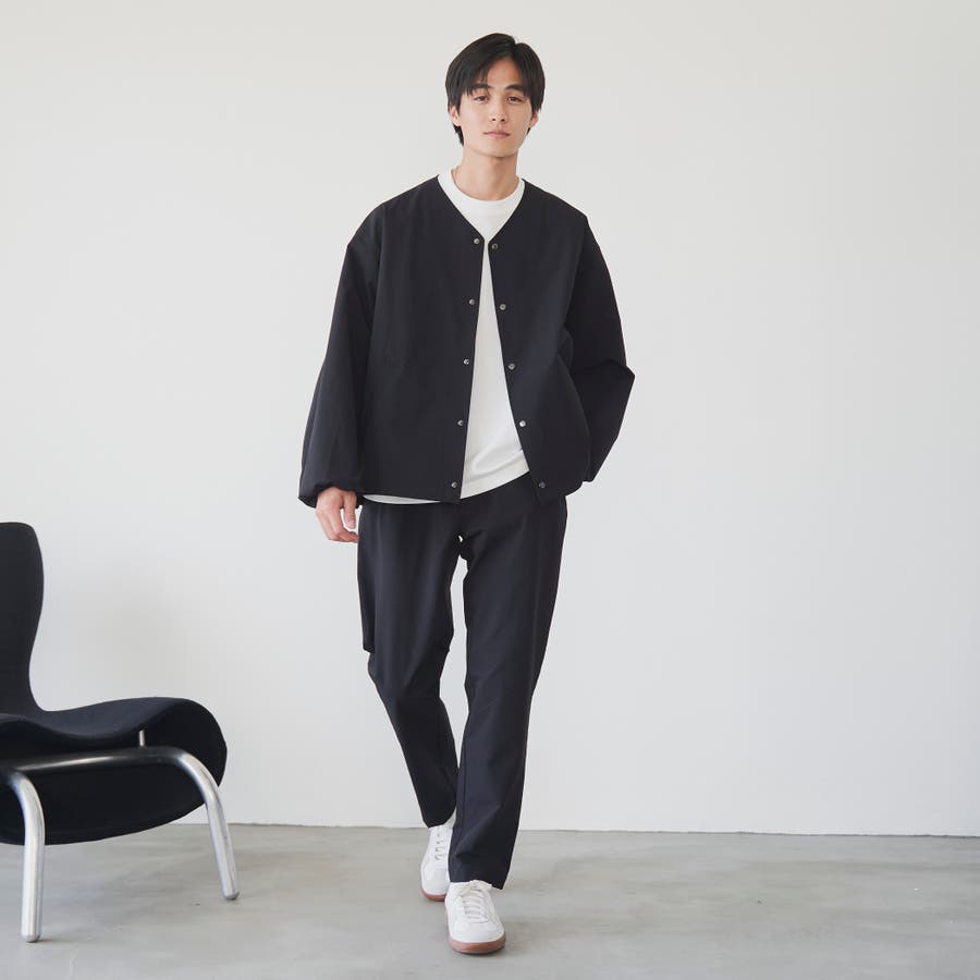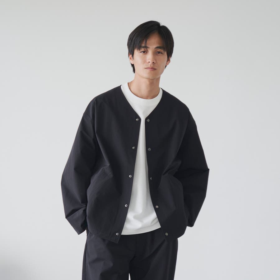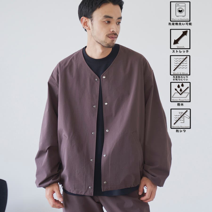 縦横に伸びる2wayストレッチ、ウォッシャブル、撥水、防シワといったマルチ機能付きのシンプルなノーカラージャケット。