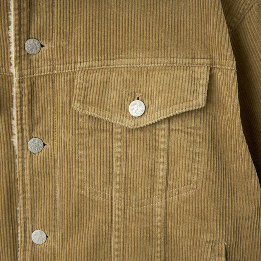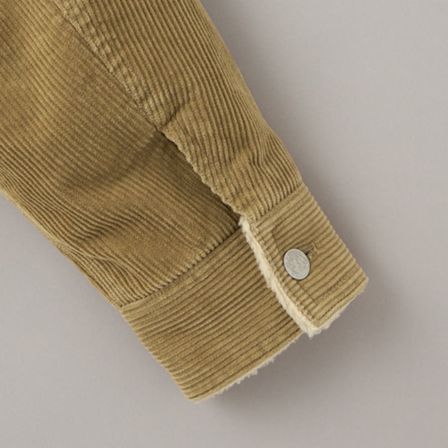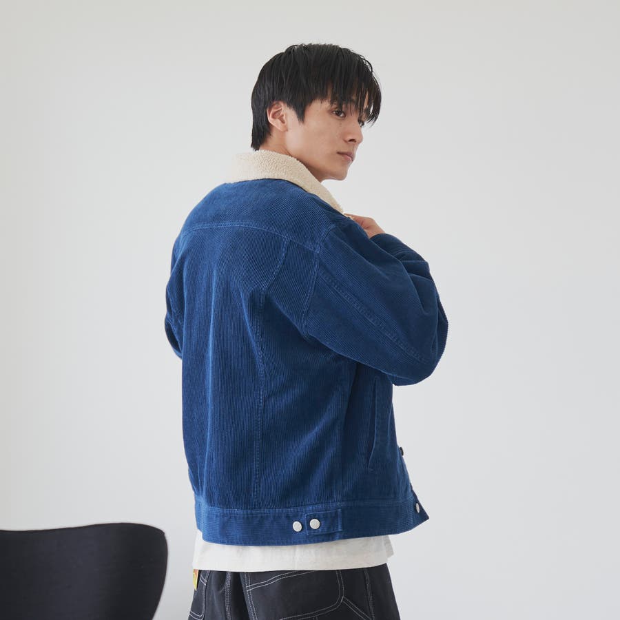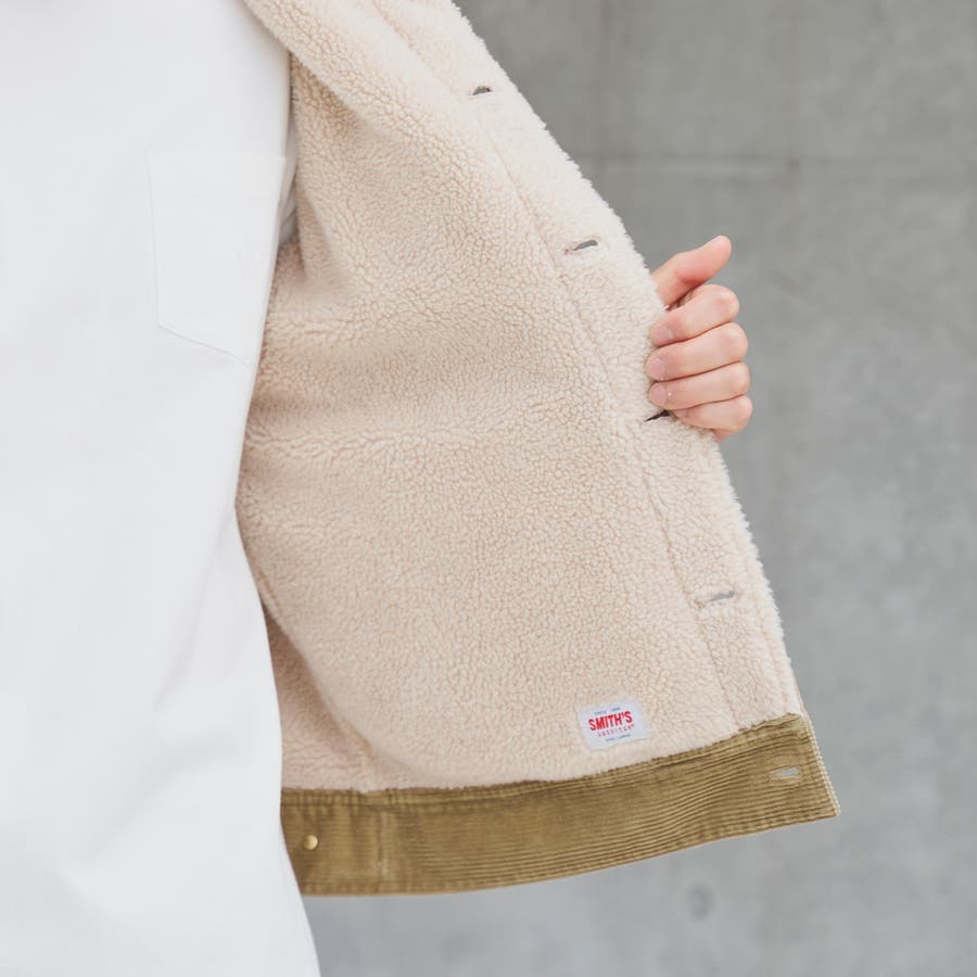 表地には季節感のあるコーデュロイ素材を使用し、裏地と襟にはボアをあしらうことで、見た目にも暖かく、着心地も快適に。