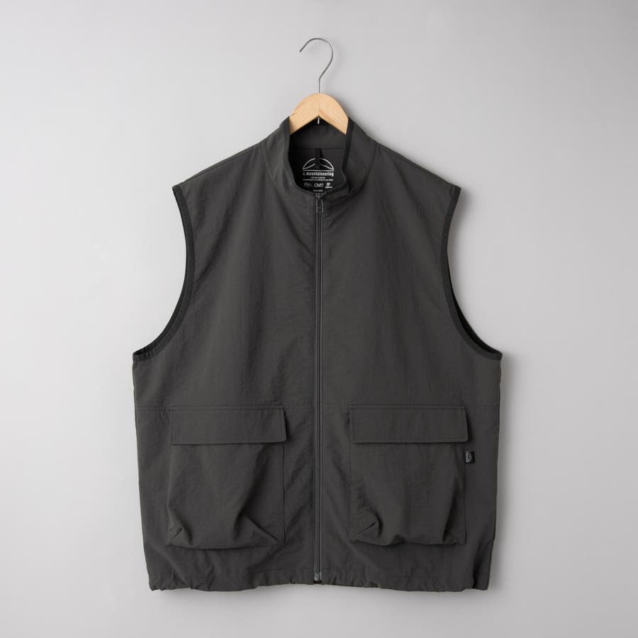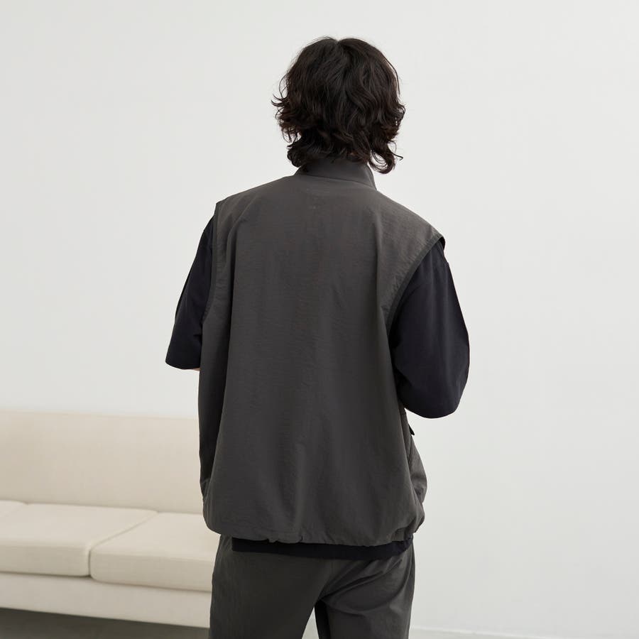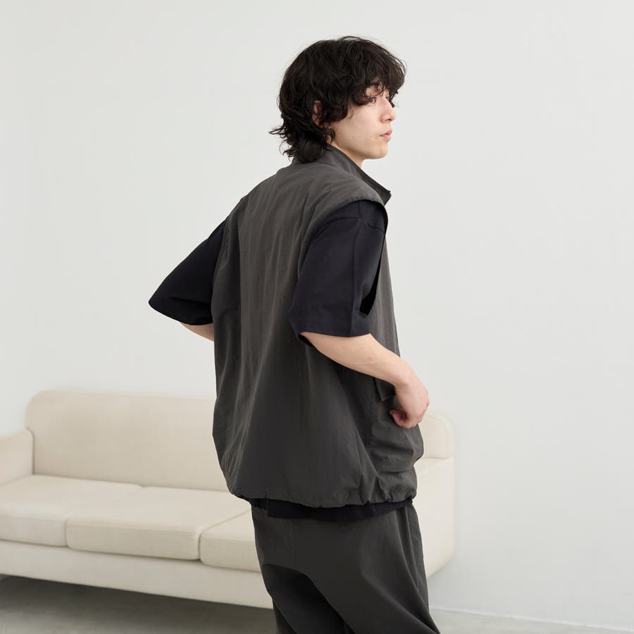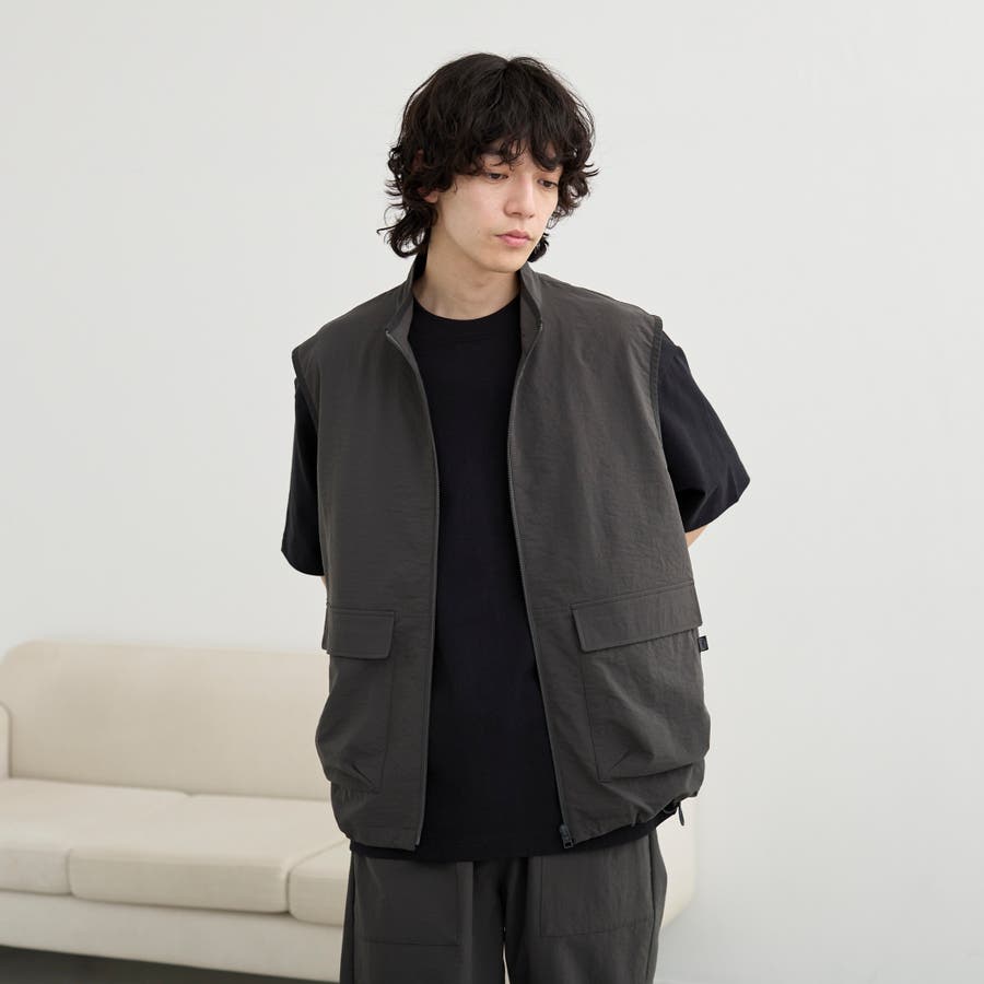 シンプルなTシャツにレイヤードするだけで、スタイリングが簡単に決まるスタンドカラーのZIPベストです。