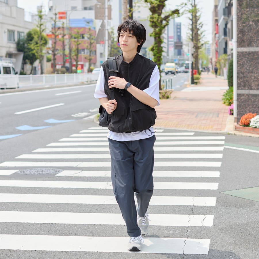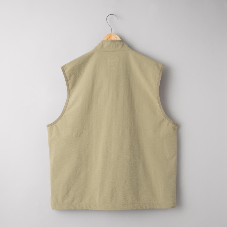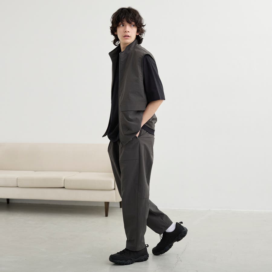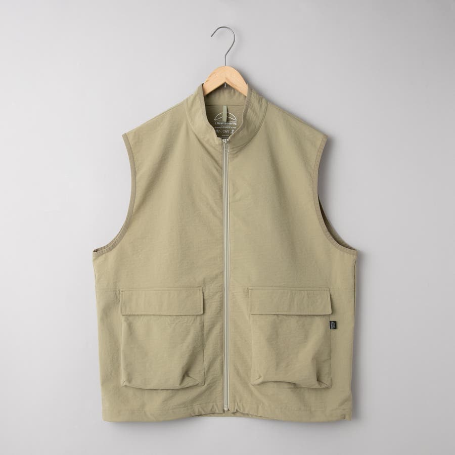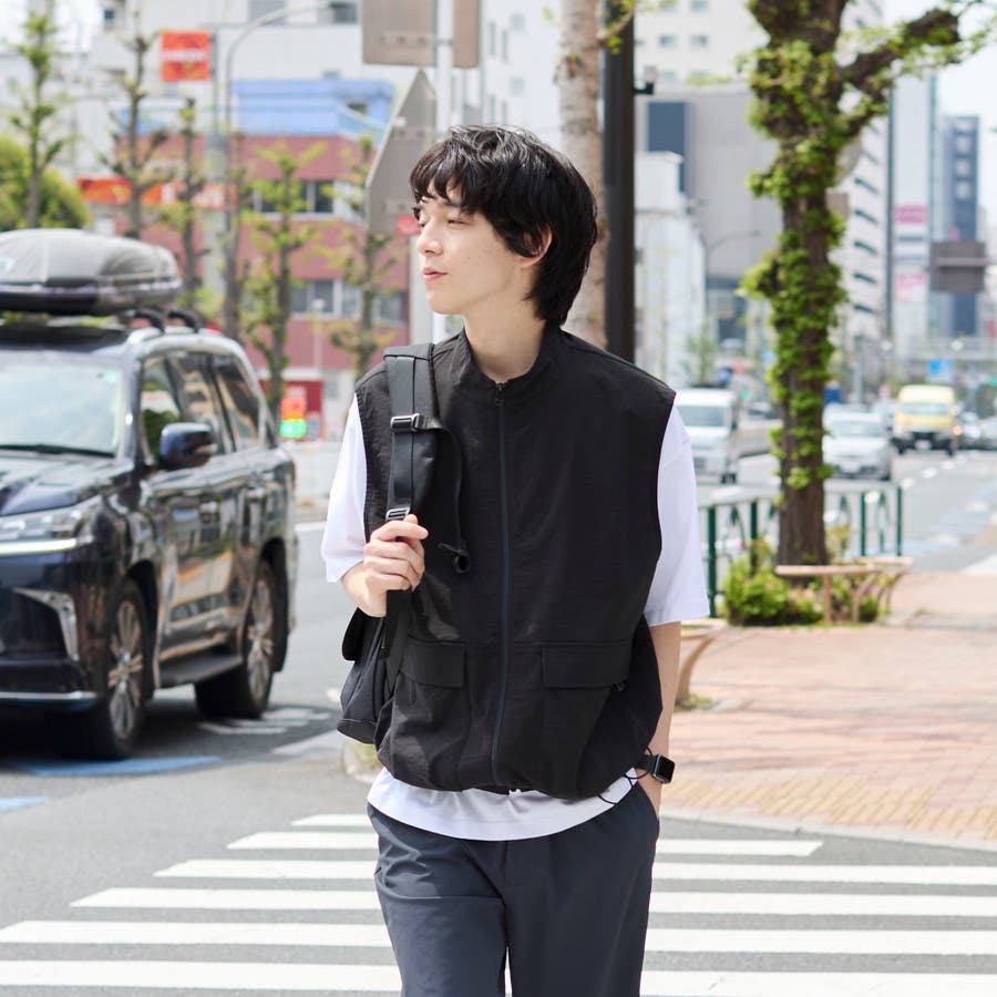 シンプルなTシャツにレイヤードするだけで、スタイリングが簡単に決まるスタンドカラーのZIPベストです。