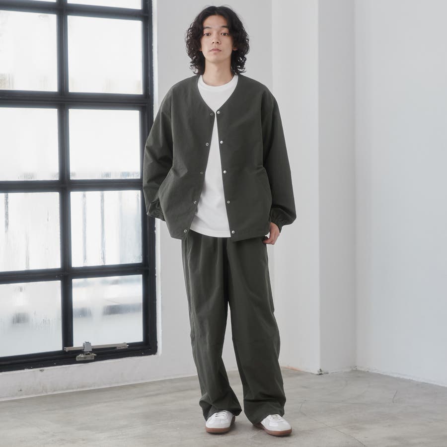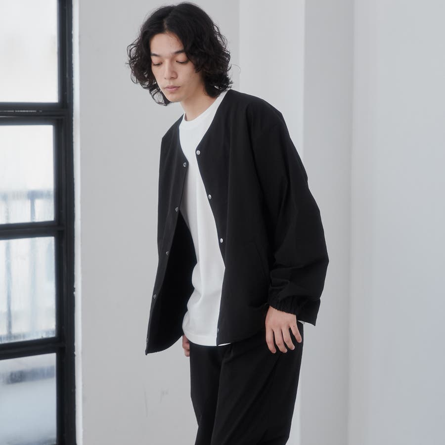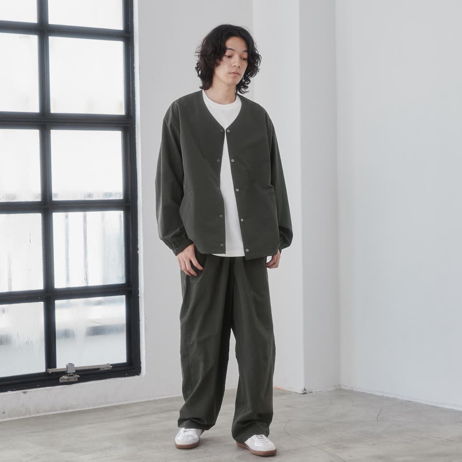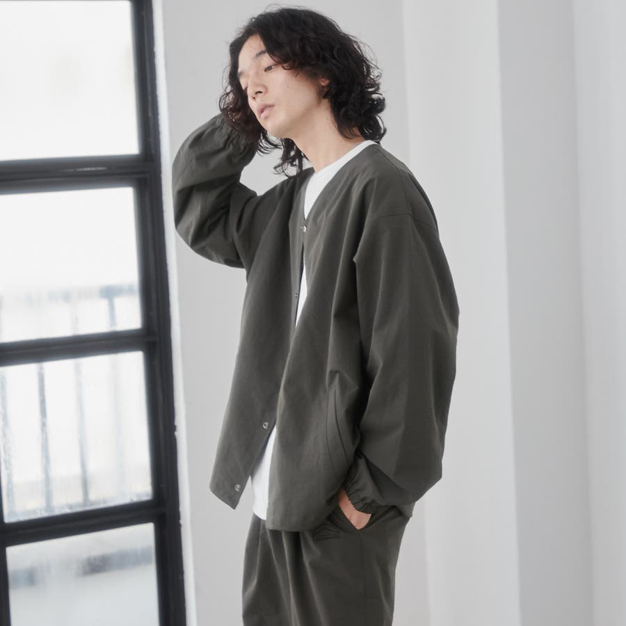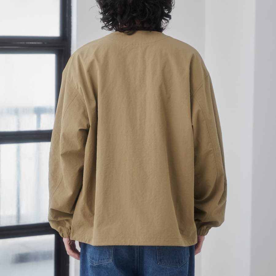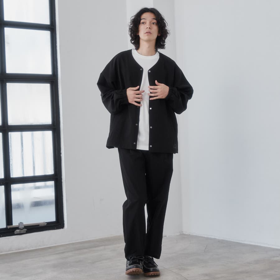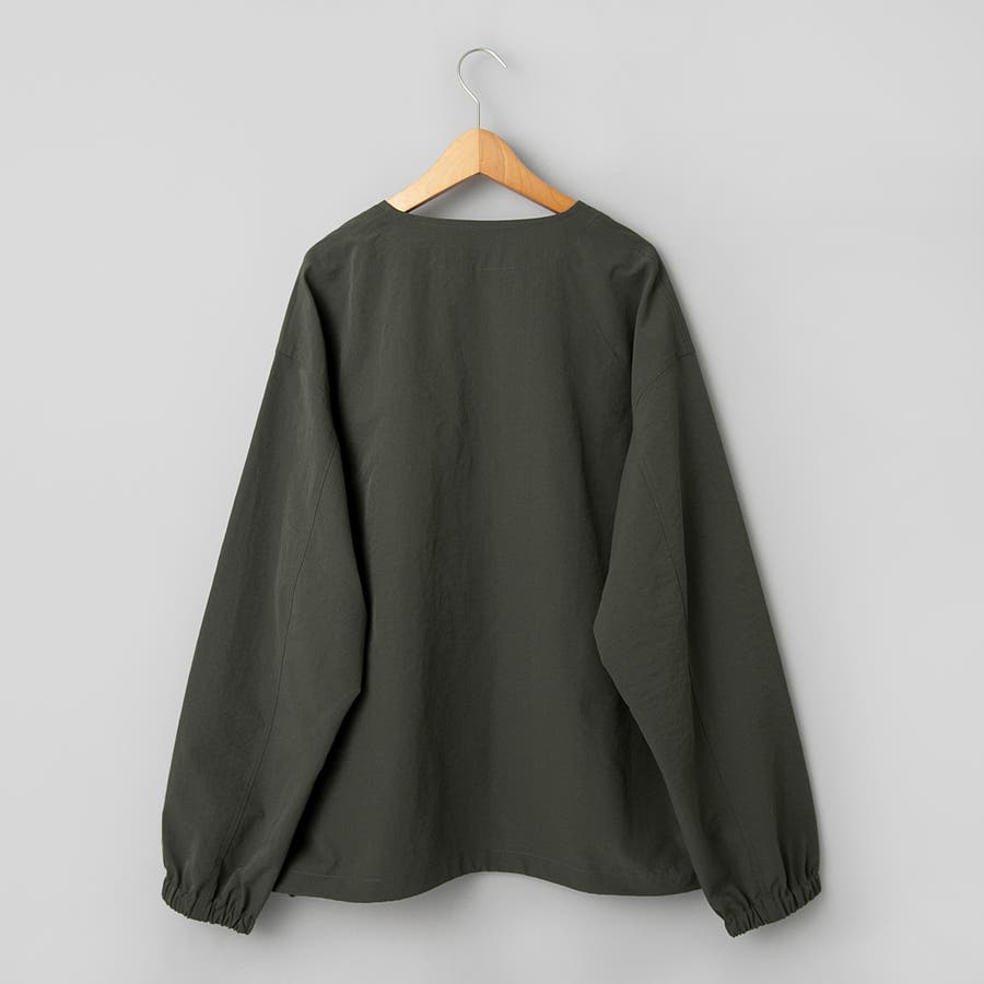 ワッシャー感(自然なシワの風合い)のある軽い素材感で、身幅やアームホールにゆとりのもたせたルーズシルエットながら、襟元はノーカラーデザインですっきりとした印象で抜け感が出ます。