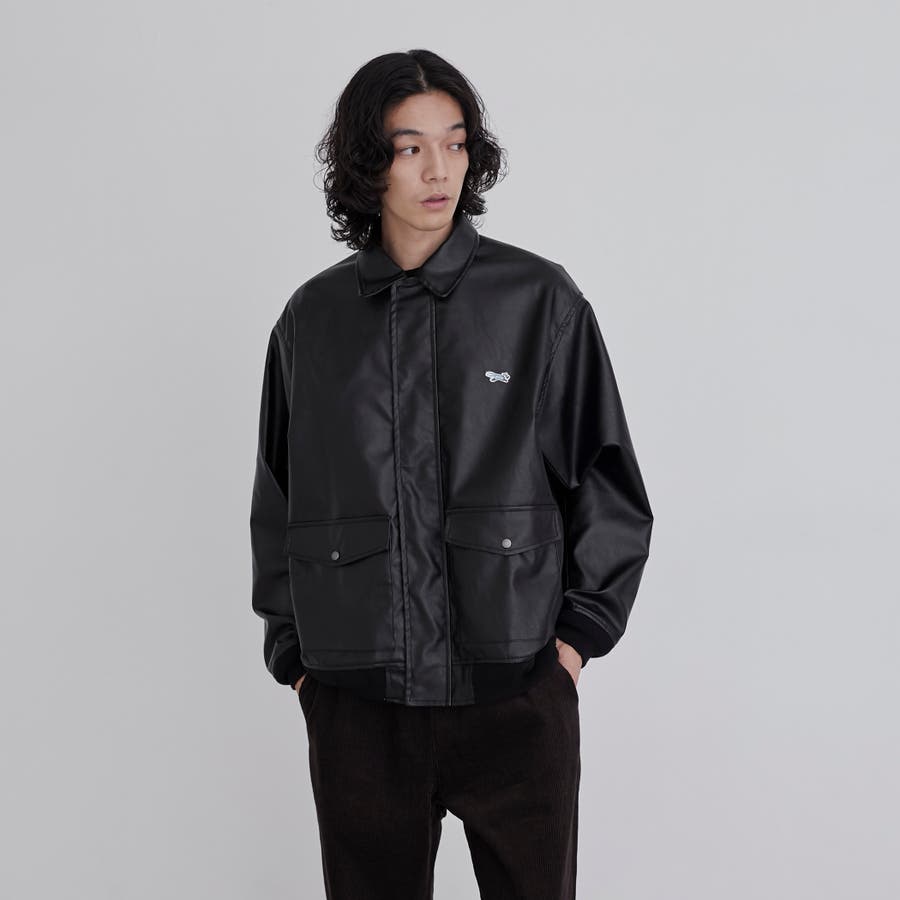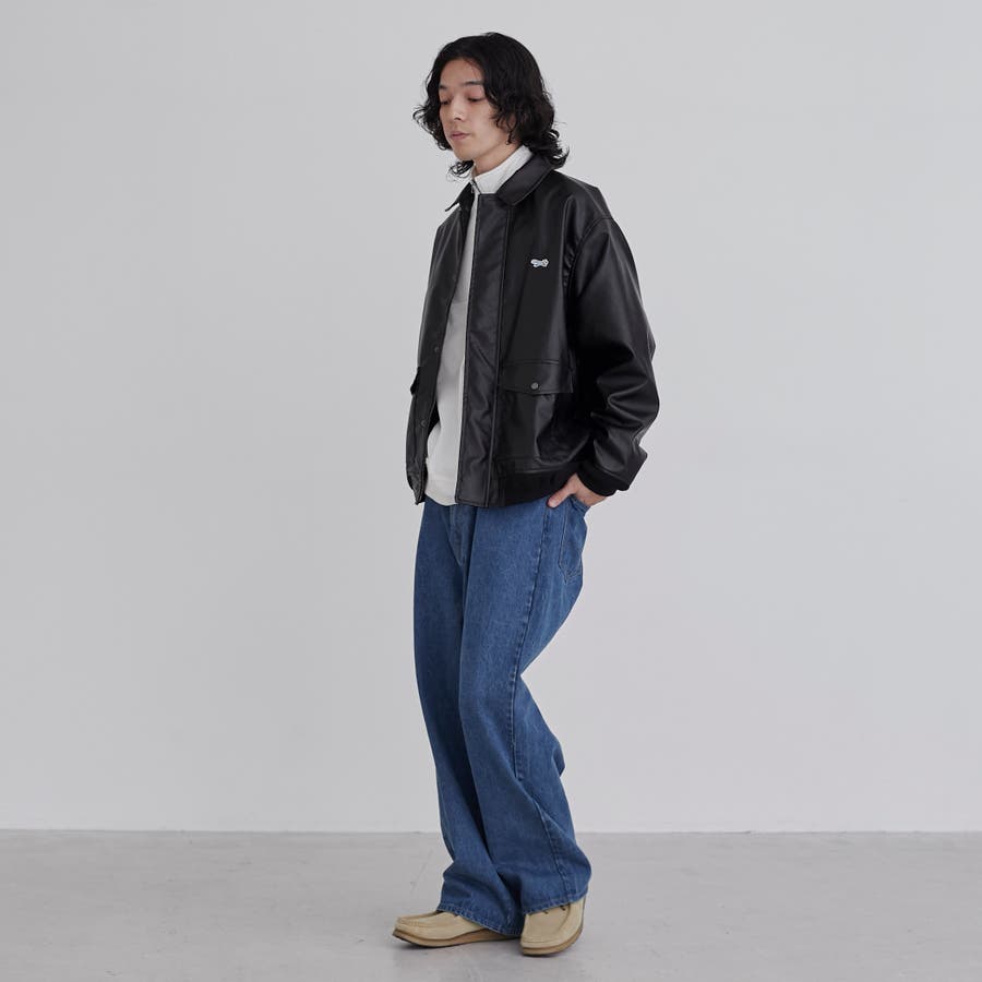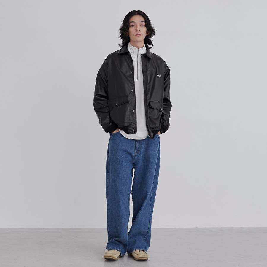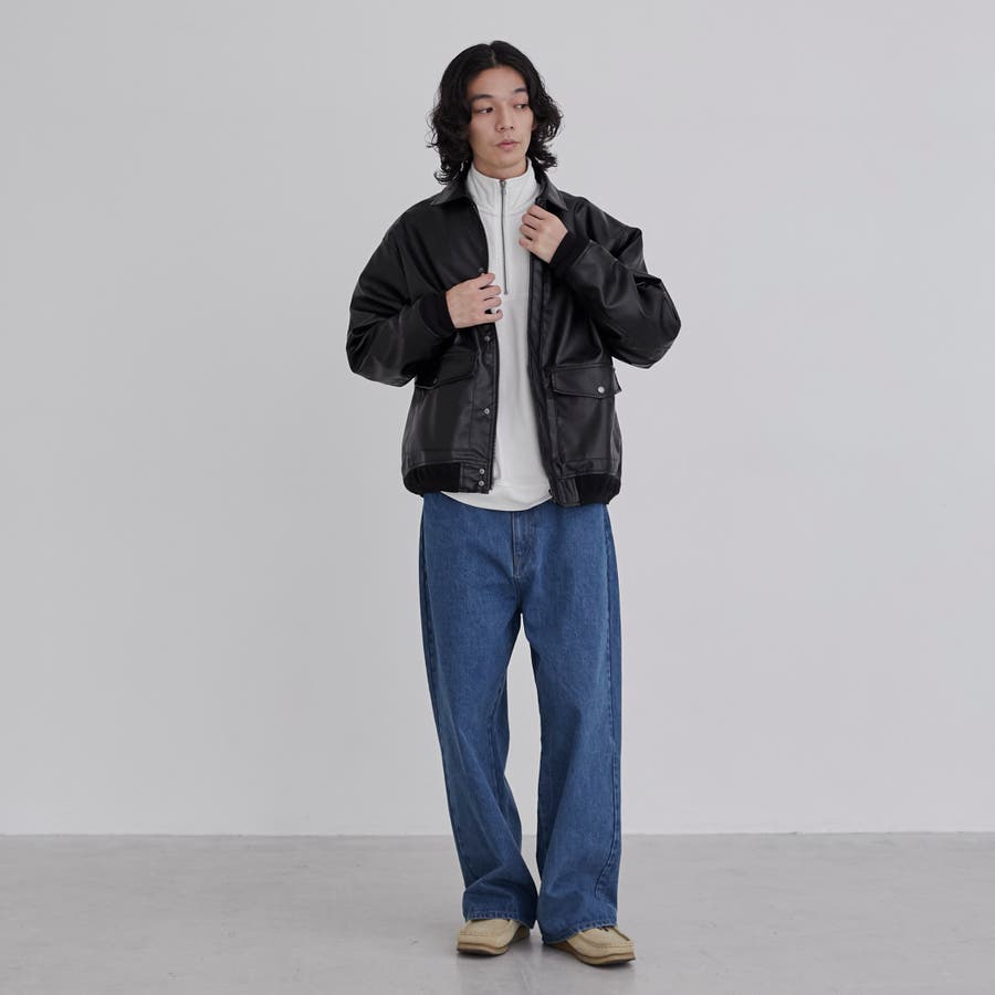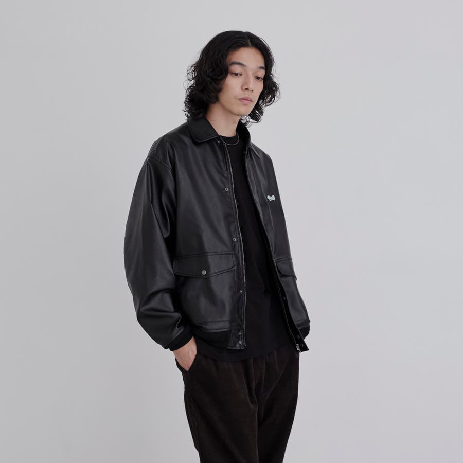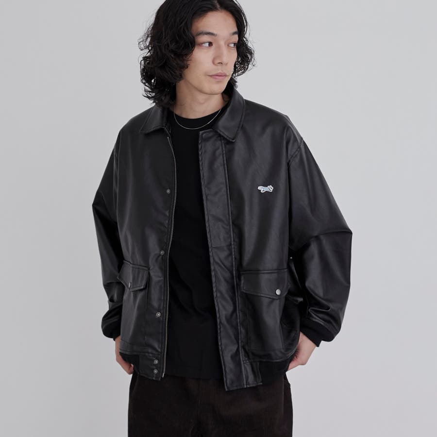 重くなりがちなレザー調ですが袖口と裾部分をリブ仕様にするなど、かっちりすぎないカジュアルとのバランスが取れた1着に。