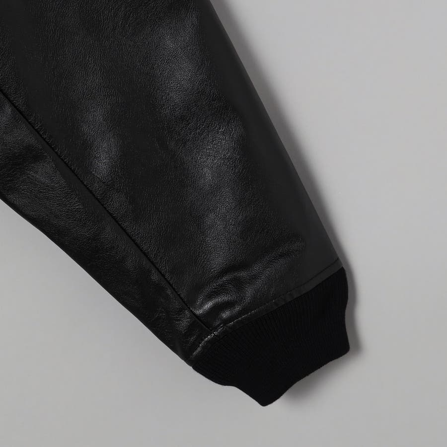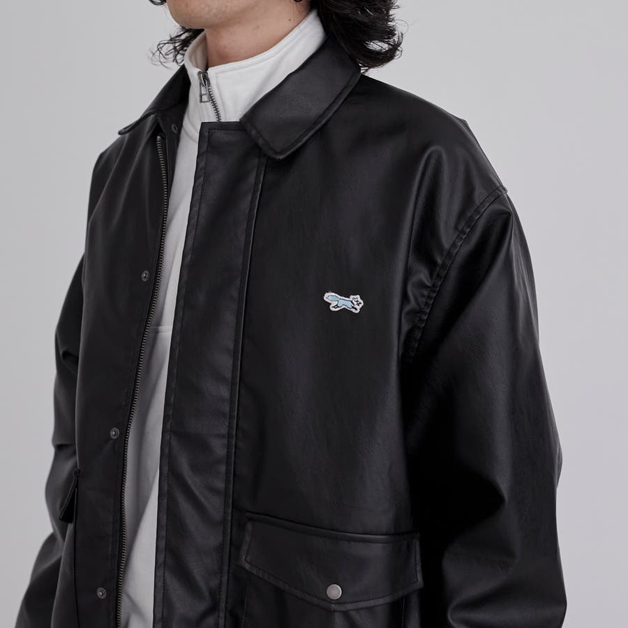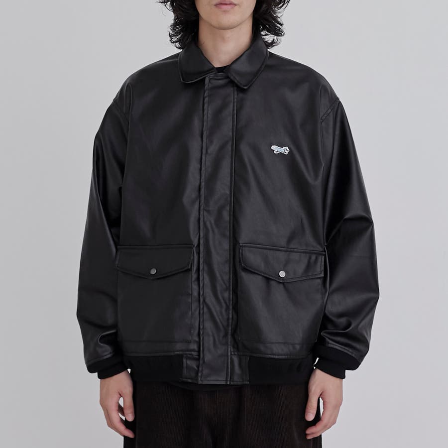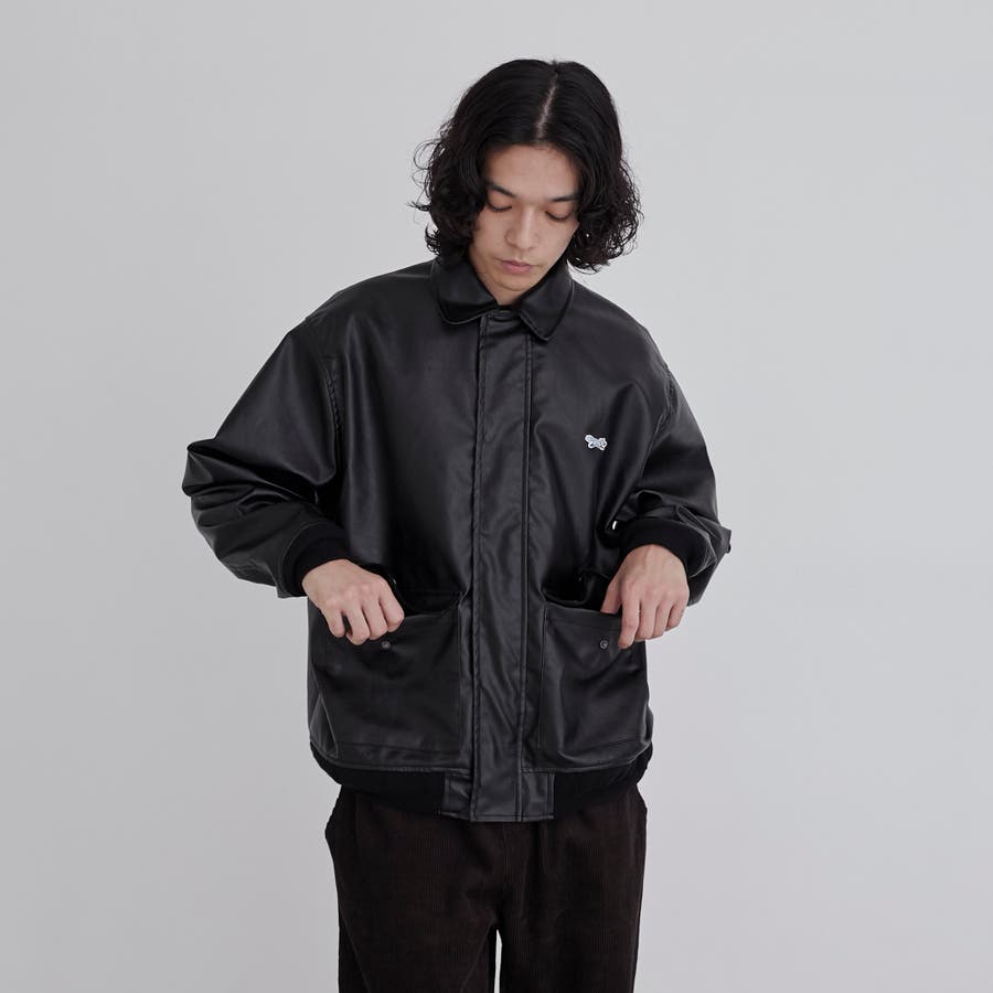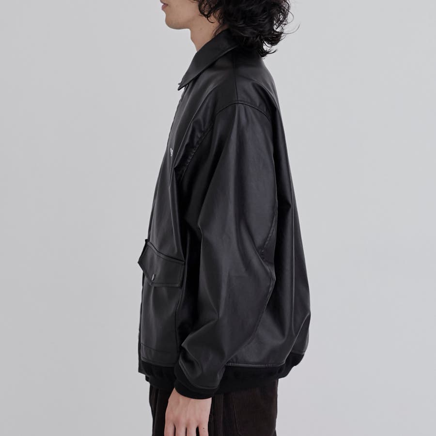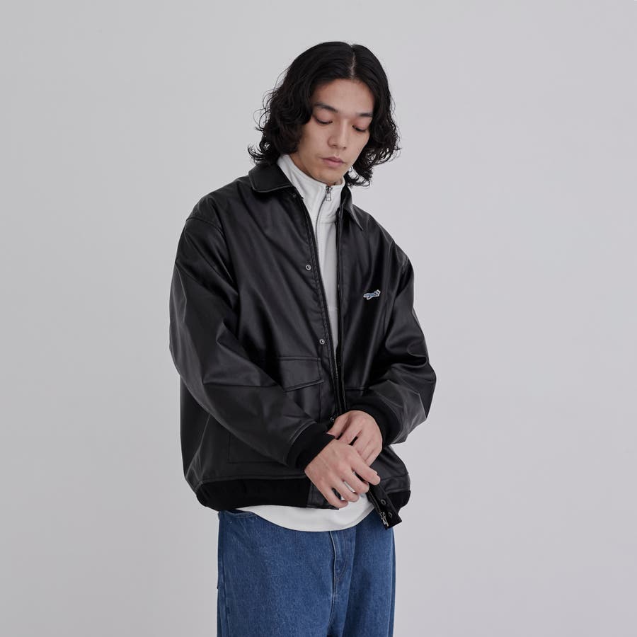 重くなりがちなレザー調ですが袖口と裾部分をリブ仕様にするなど、かっちりすぎないカジュアルとのバランスが取れた1着に。