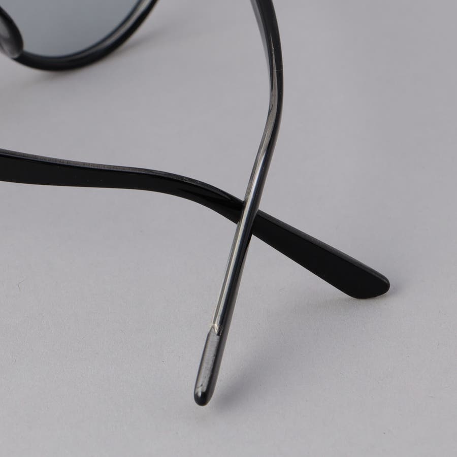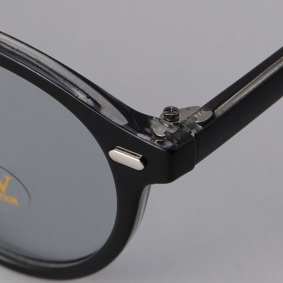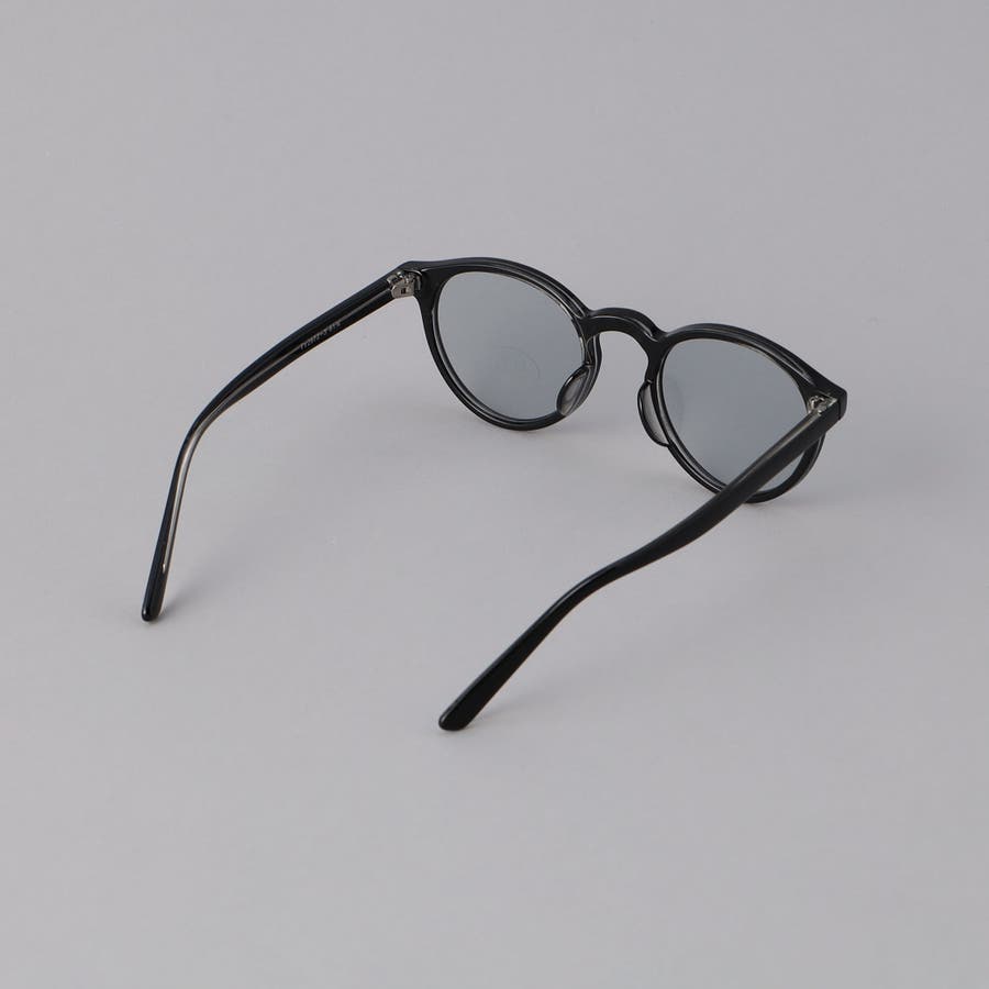 コーディネートに馴染みやすい、プラスチックフレームのサングラス。