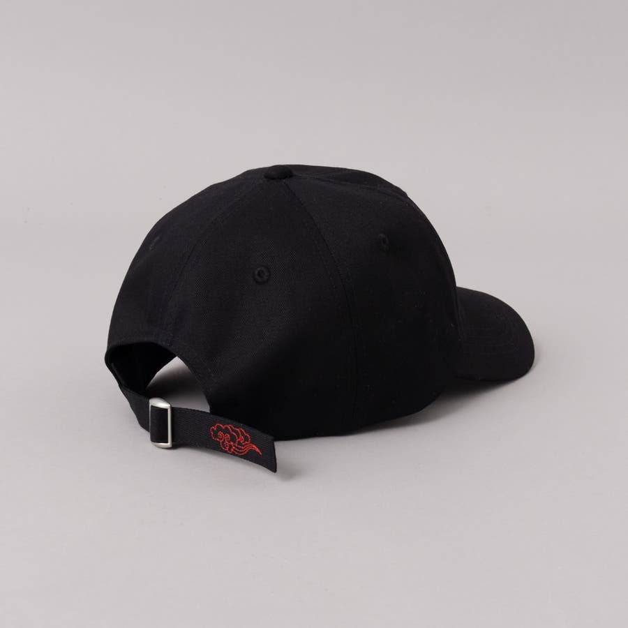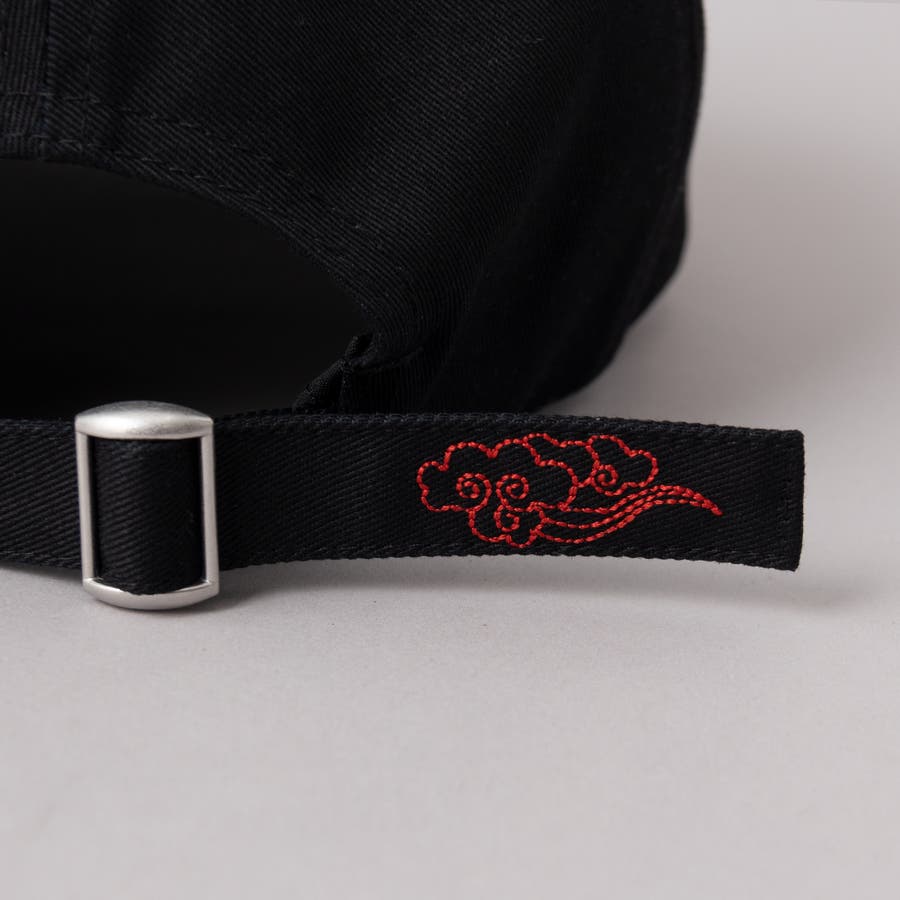 バックベルトで頭周りのサイズ調節が可能。ベルトの先には中華風の雲をモチーフにした刺繍もあしらわれています。