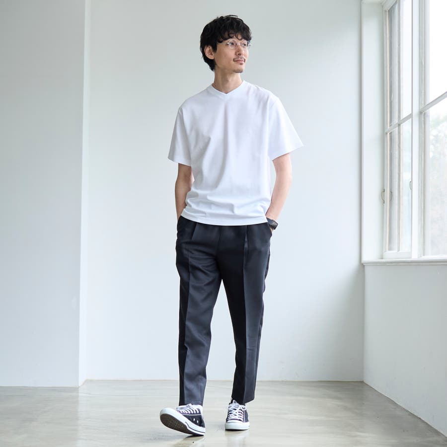 ジャケットのインナーに合うように設定されたボディーサイズと絶妙なネックの空き具合が大人の雰囲気を醸し出す一着。ゆったりすぎない程よいシルエットでオンスタイルでもオフスタイルでも着回し抜群です。