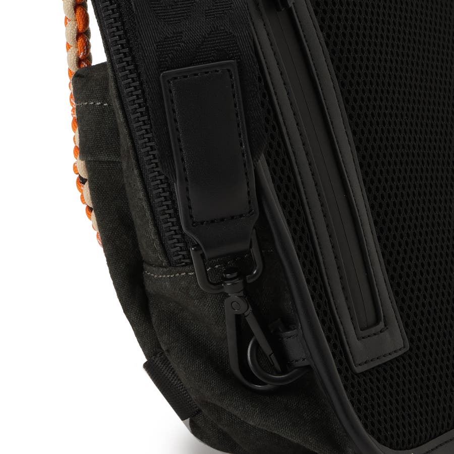 ステッチやカラビナがアクセントになり、スポーティかつ都会的な雰囲気を演出。