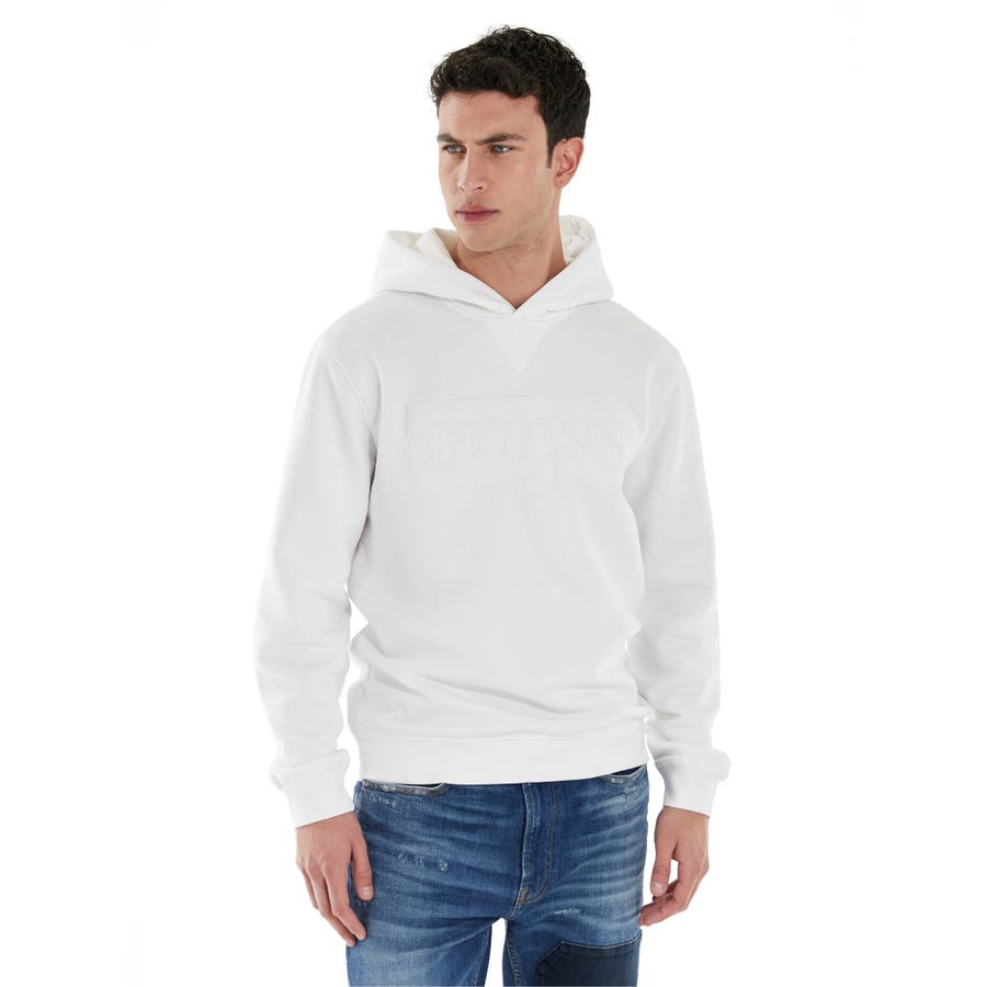 フロントに同色でGUESSのスクエアロゴを施したデザインのフーディースウェットシャツ。
