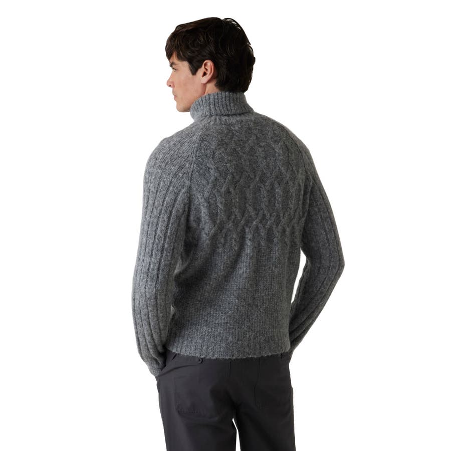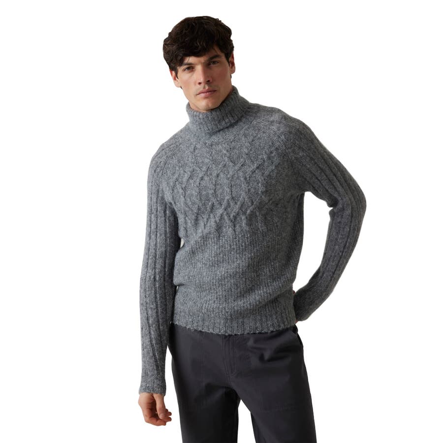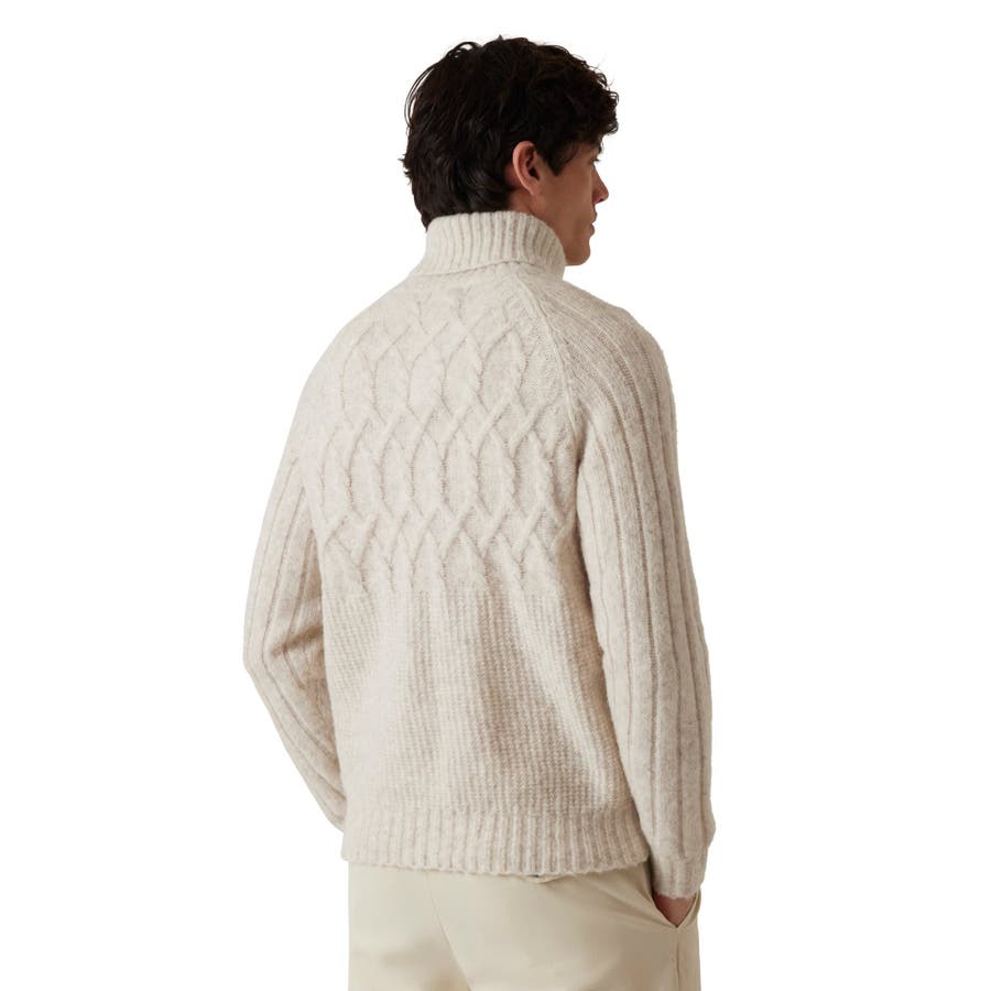 前後の身頃にはダイヤ模様のようなアラン風の編み柄が施され、クラシックで温かみのある表情に仕上がっています。