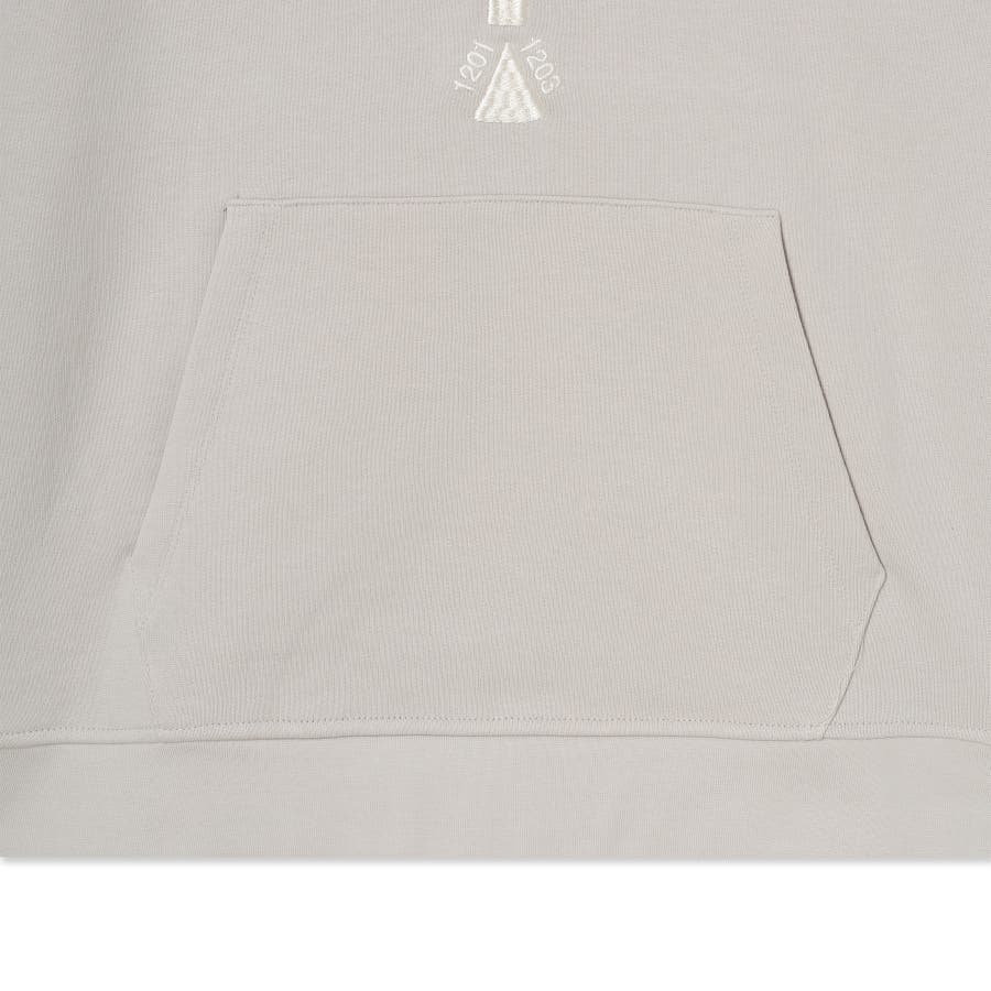 トライアングルに配置されたロゴ刺しゅうがユニークなフーディスウェット。