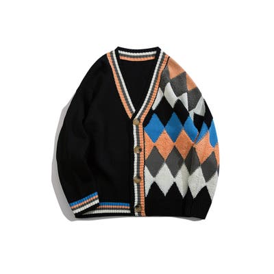 アシンメトリー カラフルなアーガイル幾何学模様リンガーカーディガン メンズ