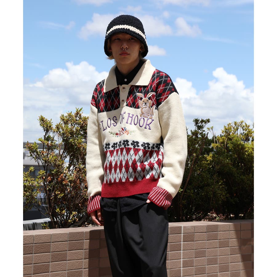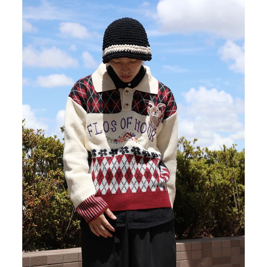 配色のアーガイル柄と古着感覚の花/うさぎ刺繍入りポロ襟ニット。身幅や袖にゆとりを持たせることで、丸みのあるシルエットを表現しつつも、インナーとしても合わせ易いよう計算された、程好くリラックス感のある絶妙なシルエットが魅力。程よい厚みとさらりと優しい着心地なので秋から冬、春先までのロングシーズンお使いいただけます。男女問わずユニセックスで着用頂けるので、ご自身用は勿論、プレゼントとしても喜んでいただけるおすすめのアイテムです。