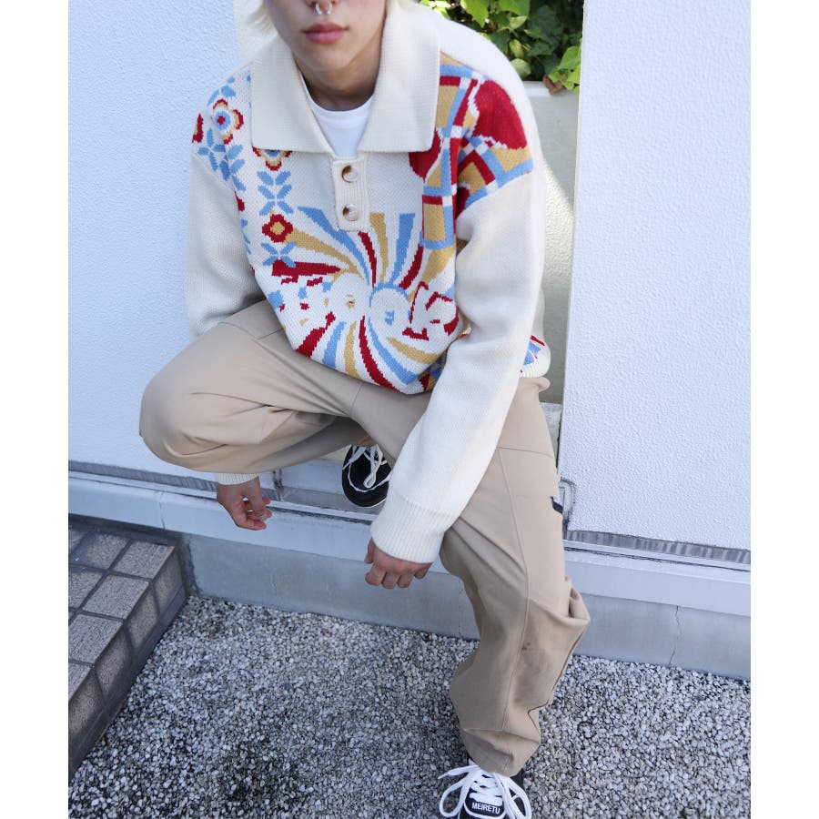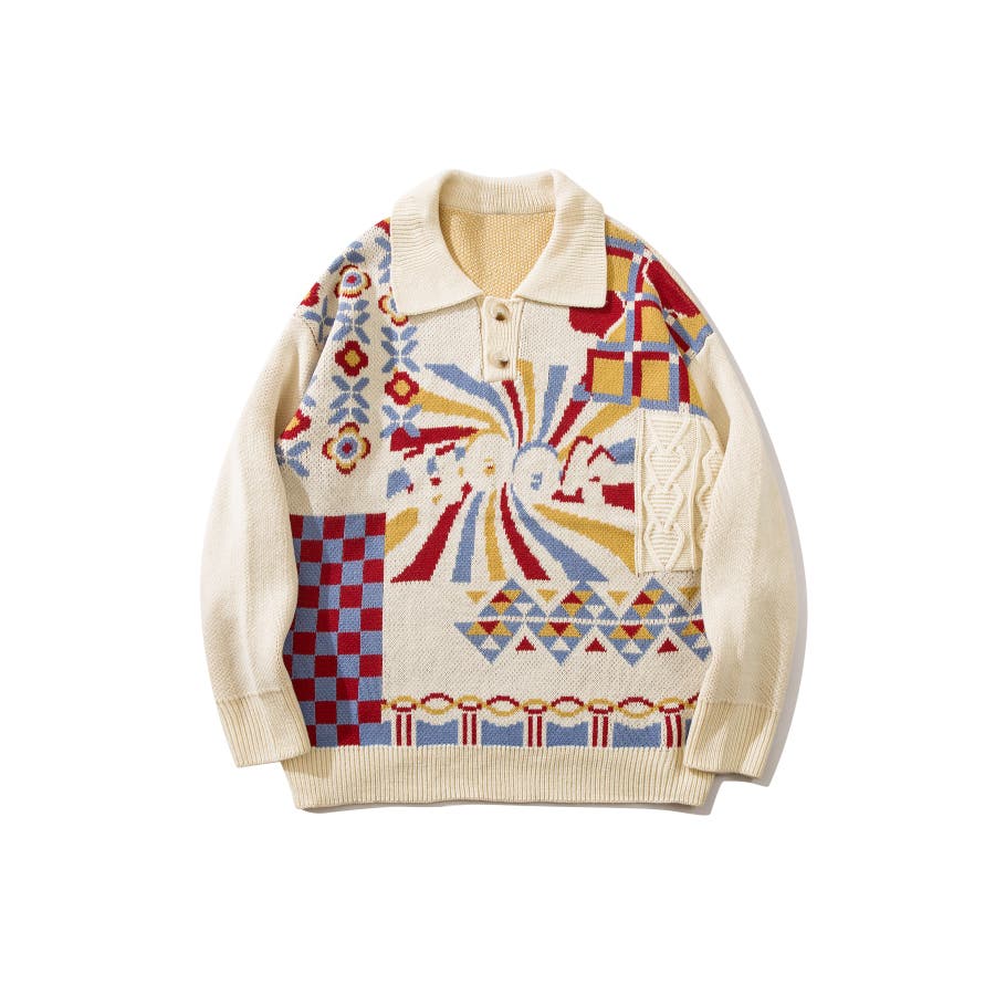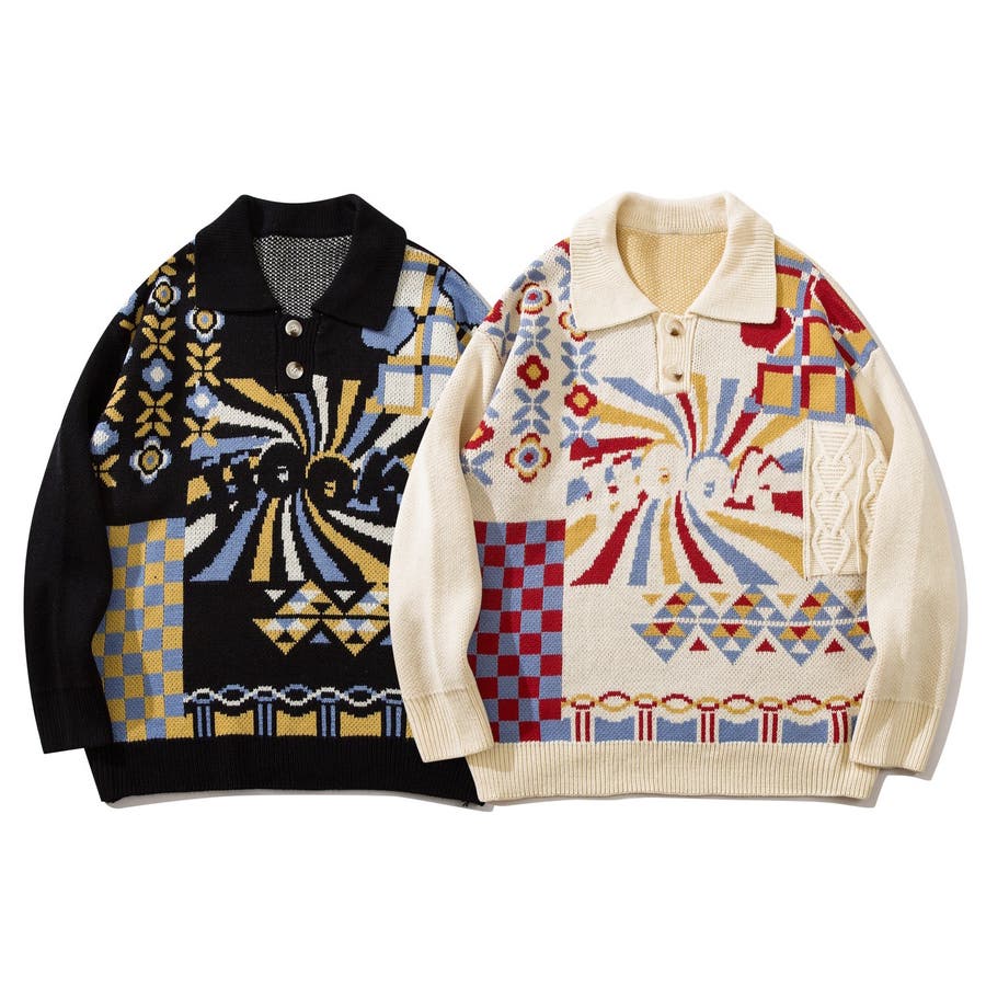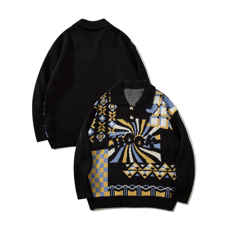 古着風 レトロ調パッチワック模様ポロ襟ニットスウェット【AW】