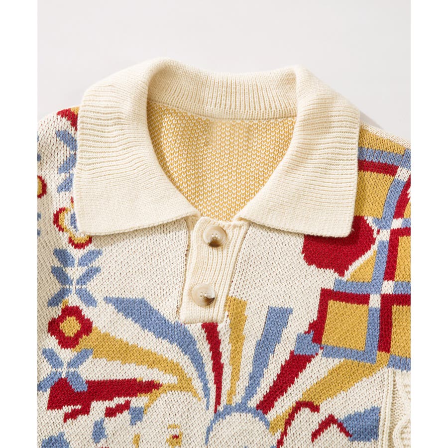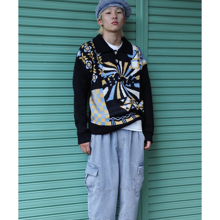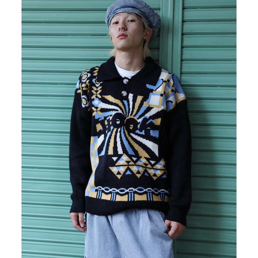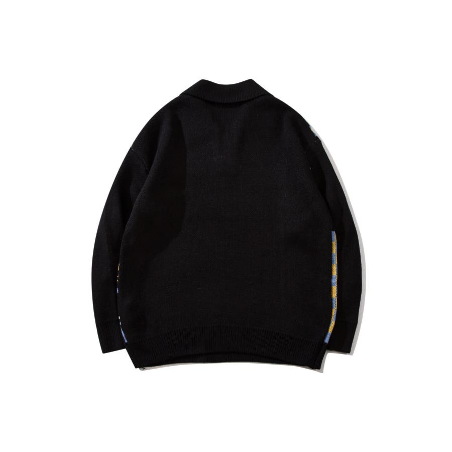 古着風 レトロ調パッチワック模様ポロ襟ニットスウェット【AW】