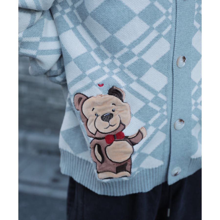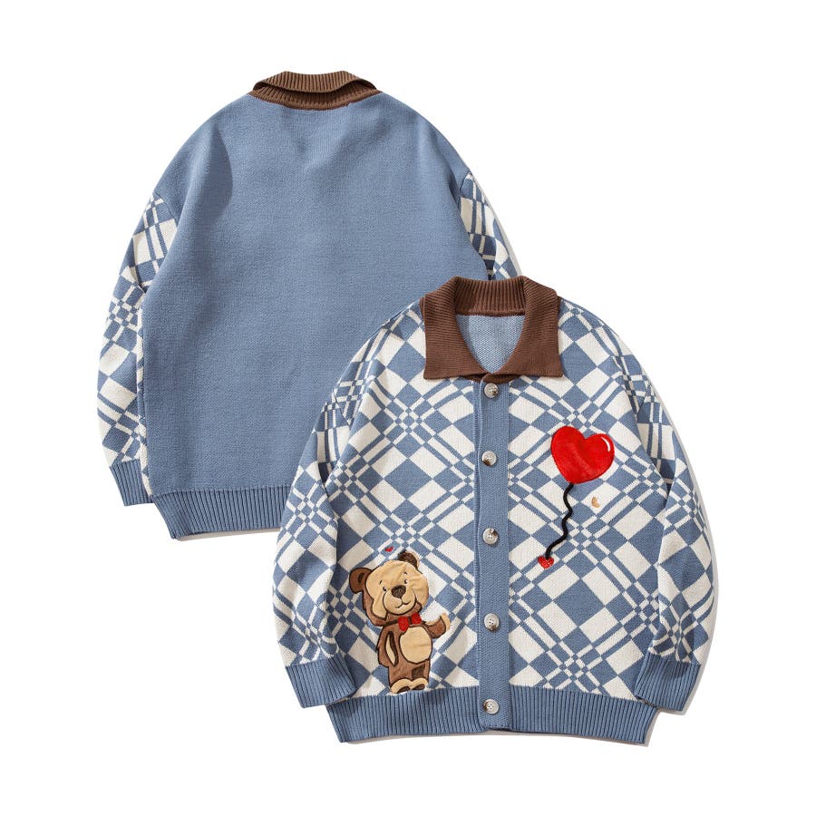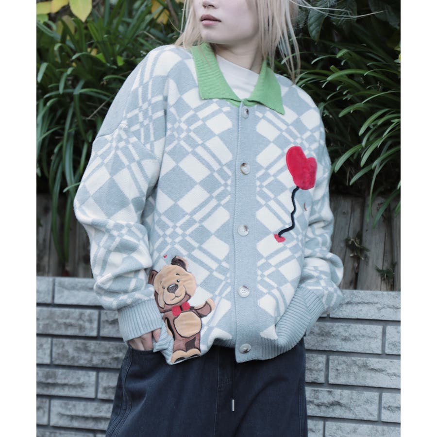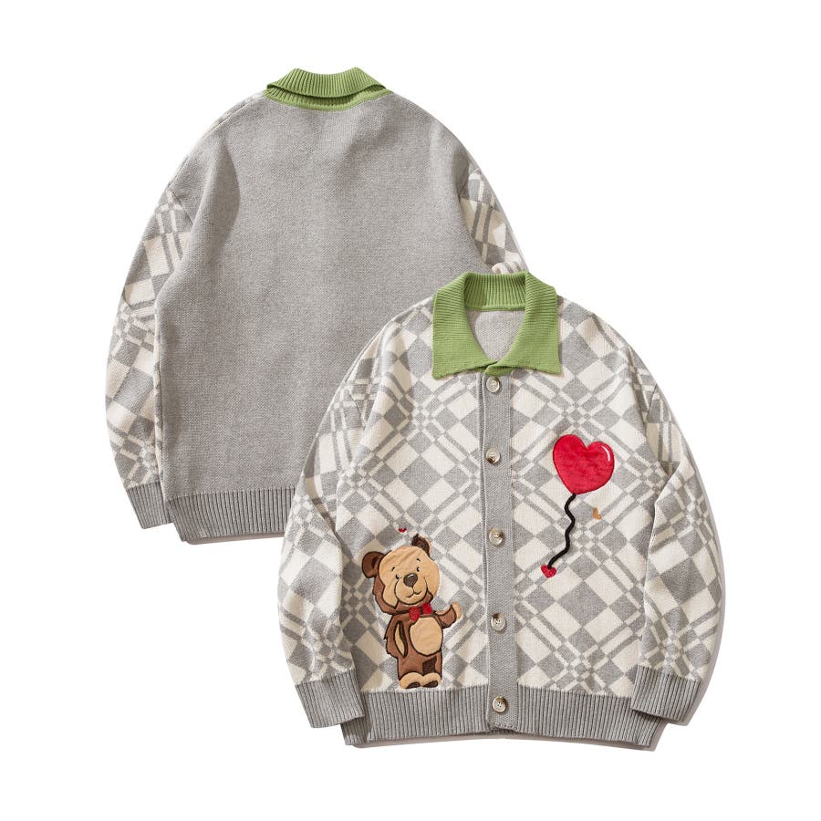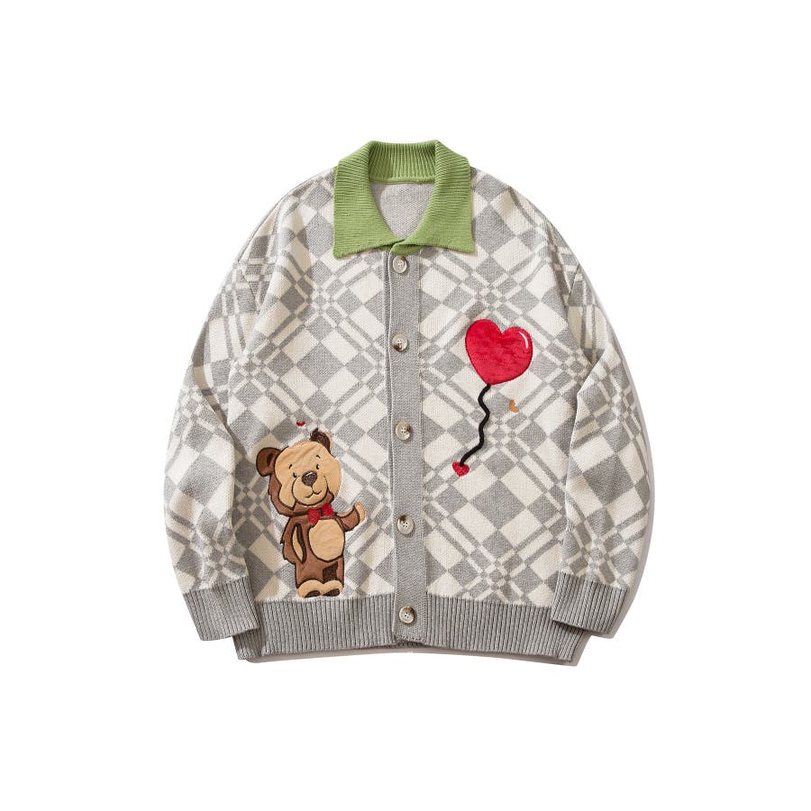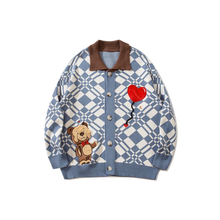 ハートの風船を飛ばしたクマちゃんがかわいらしいニットカーディガン。フリース生地で作られたパッチワーク刺繍はHOOKらしい凝ったデザイン。レトロ調の幾何学模様とジャカード編み模様は古着コーデに馴染む一枚。柔らかい糸を使用し手触りは抜群。前ボタン開き仕様なのでプルオーバーとして切るのはもちろん、前を空けて羽織としても便利なアイテムです。冬から春先まで大活躍する一枚。男女問わずユニセックスで着用頂けるので、ご自身用は勿論、プレゼントとしても喜んでいただけるおすすめのアイテムです。