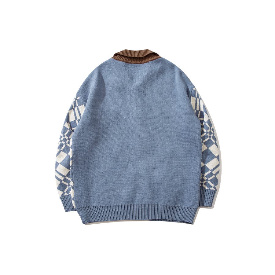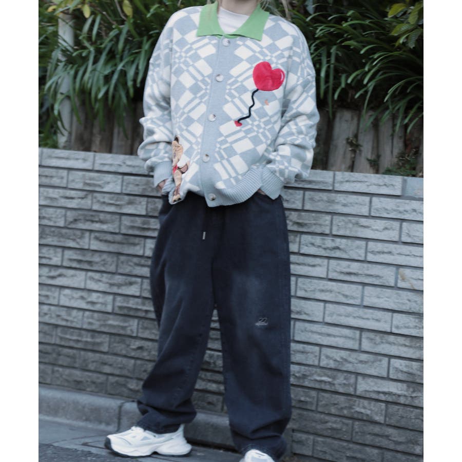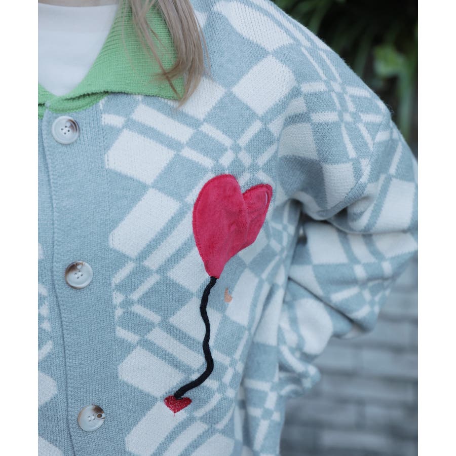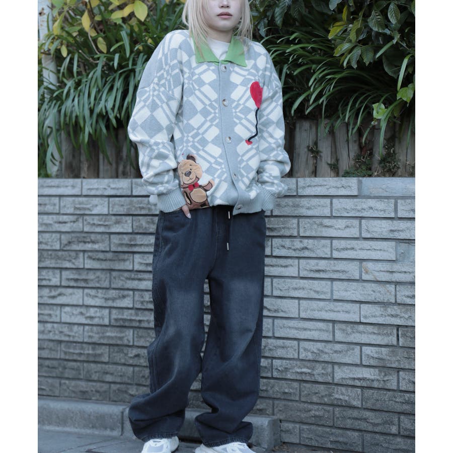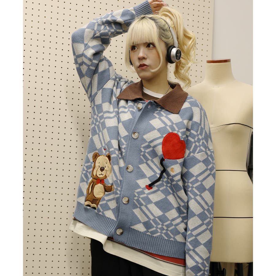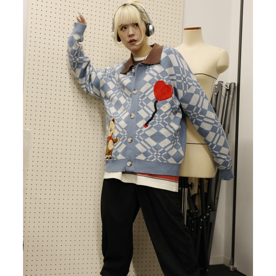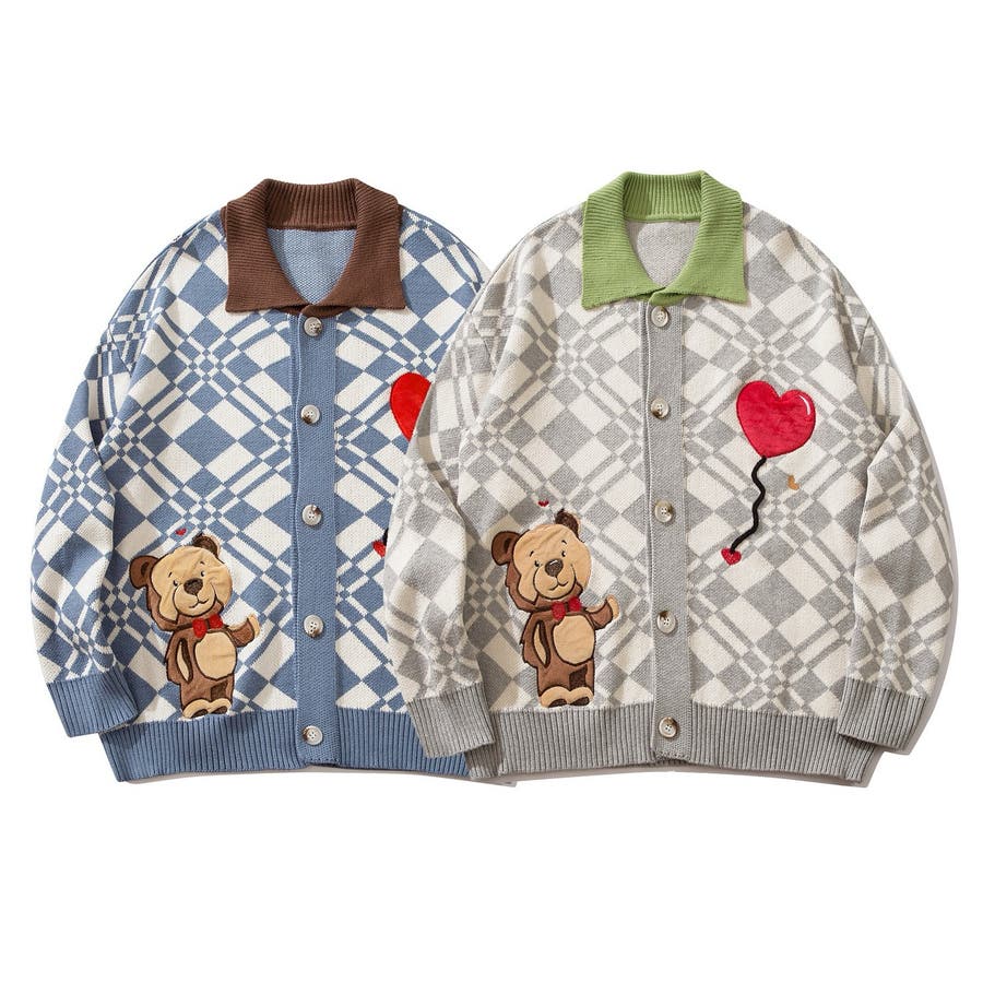 ハートの風船を飛ばしたクマちゃんがかわいらしいニットカーディガン。フリース生地で作られたパッチワーク刺繍はHOOKらしい凝ったデザイン。レトロ調の幾何学模様とジャカード編み模様は古着コーデに馴染む一枚。柔らかい糸を使用し手触りは抜群。前ボタン開き仕様なのでプルオーバーとして切るのはもちろん、前を空けて羽織としても便利なアイテムです。冬から春先まで大活躍する一枚。男女問わずユニセックスで着用頂けるので、ご自身用は勿論、プレゼントとしても喜んでいただけるおすすめのアイテムです。