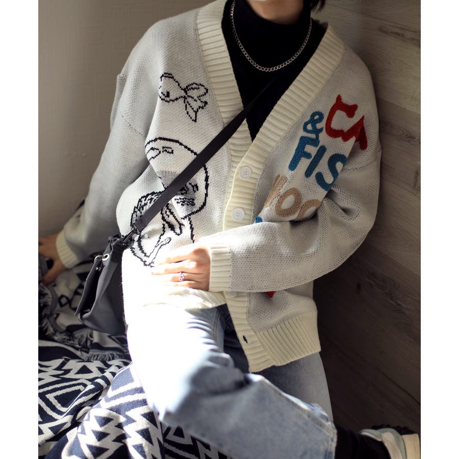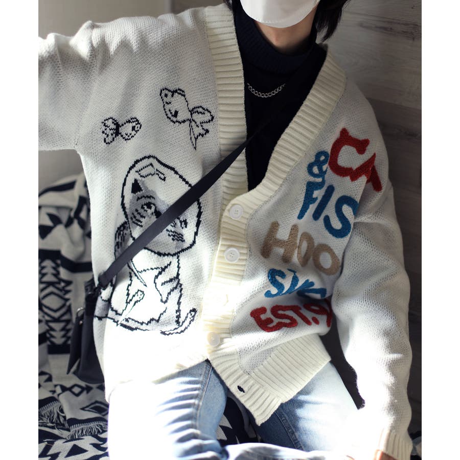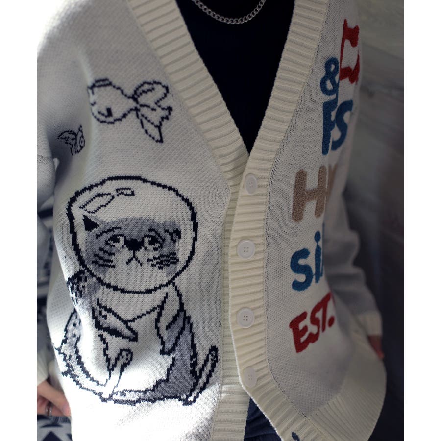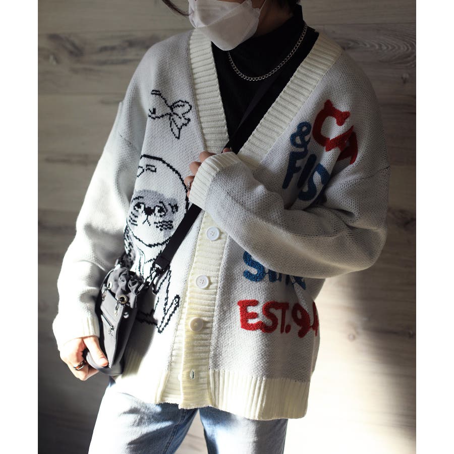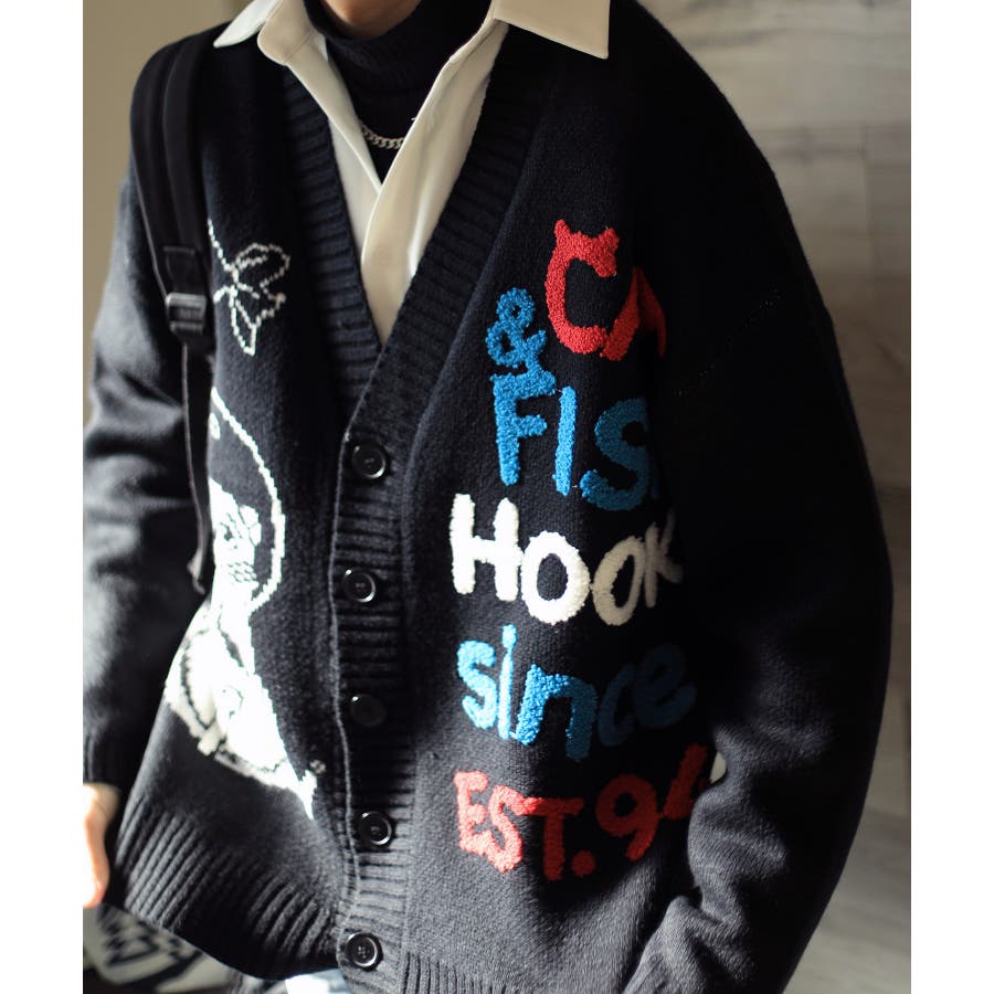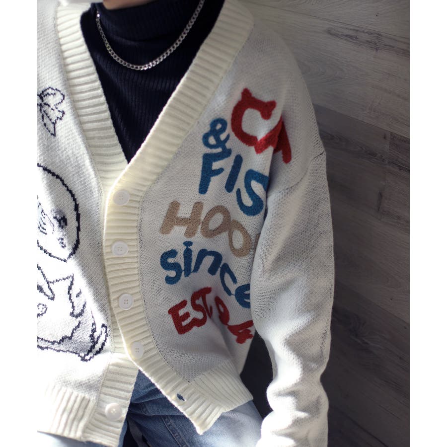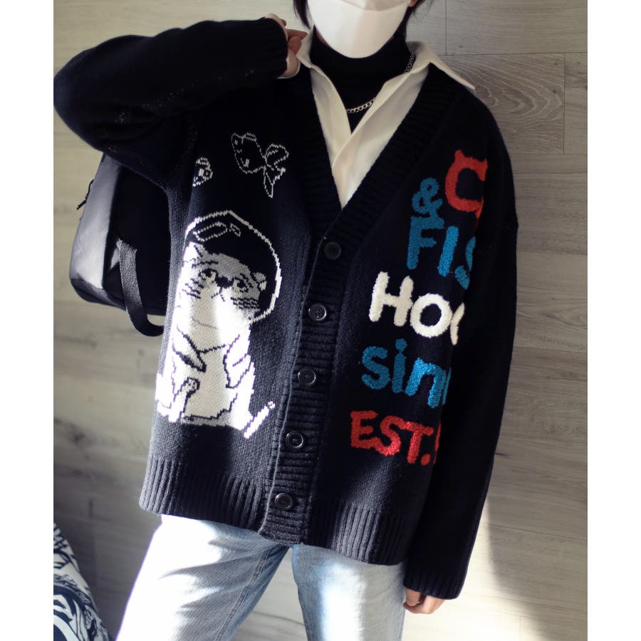 「CAT&FISH」英字刺繍猫イラストカーディガン ユニセックス オーバーサイズ