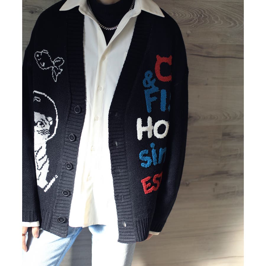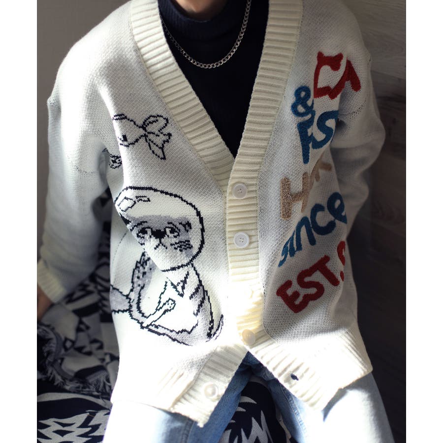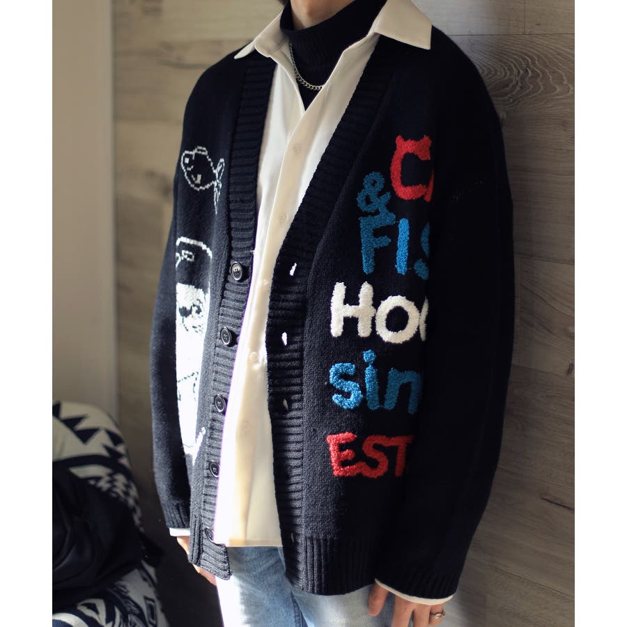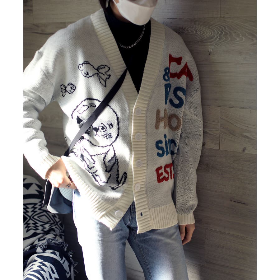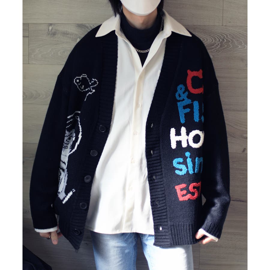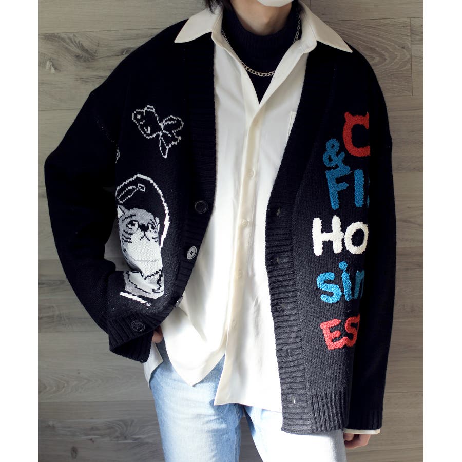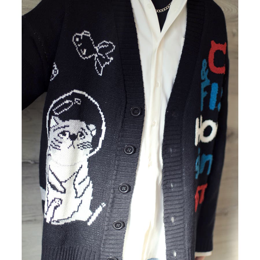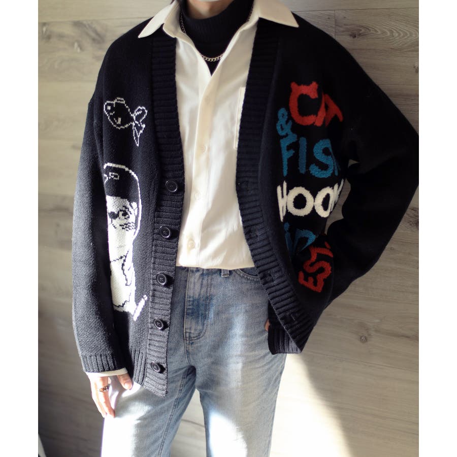 「CAT&FISH」英字刺繍猫イラストカーディガン ユニセックス オーバーサイズ