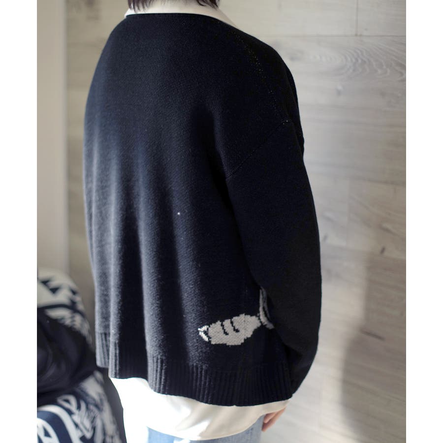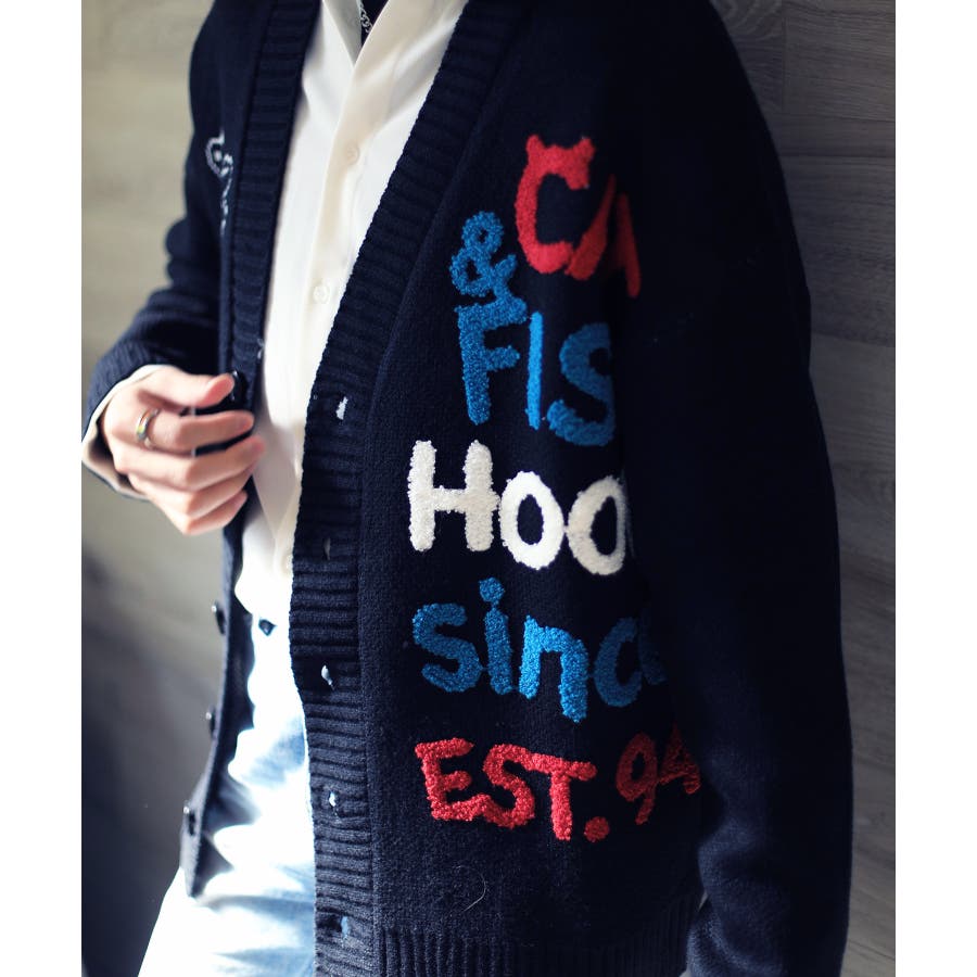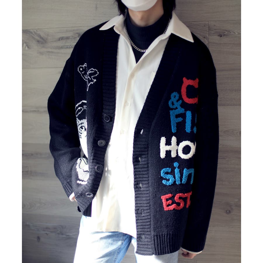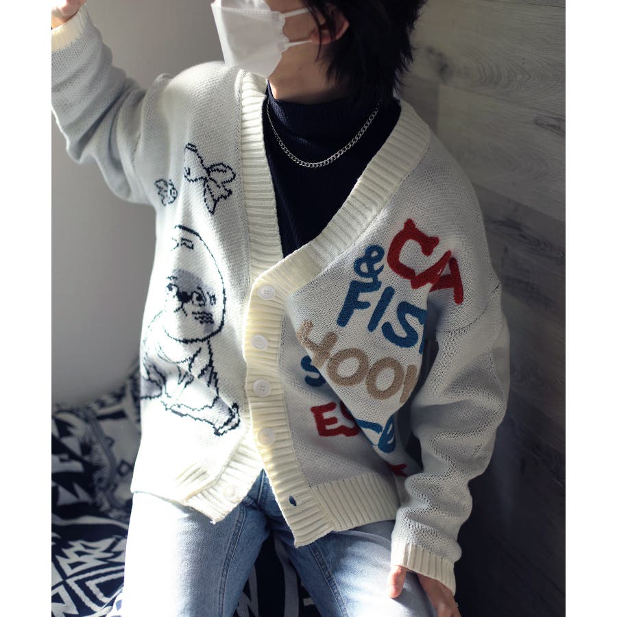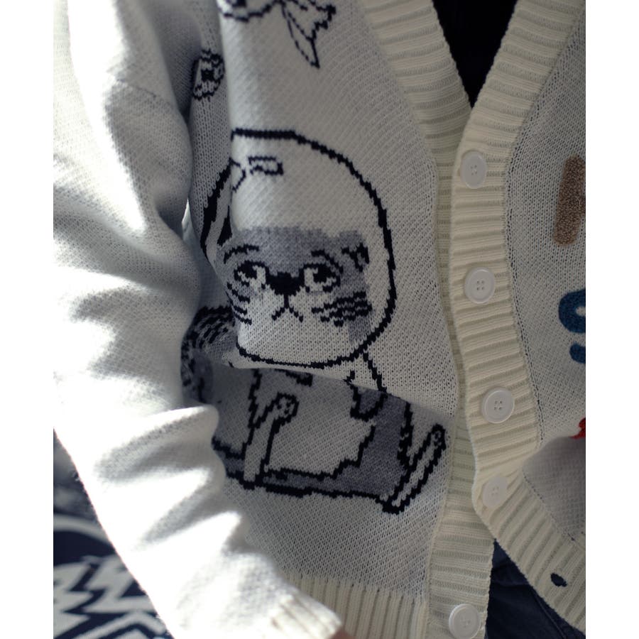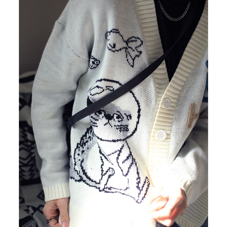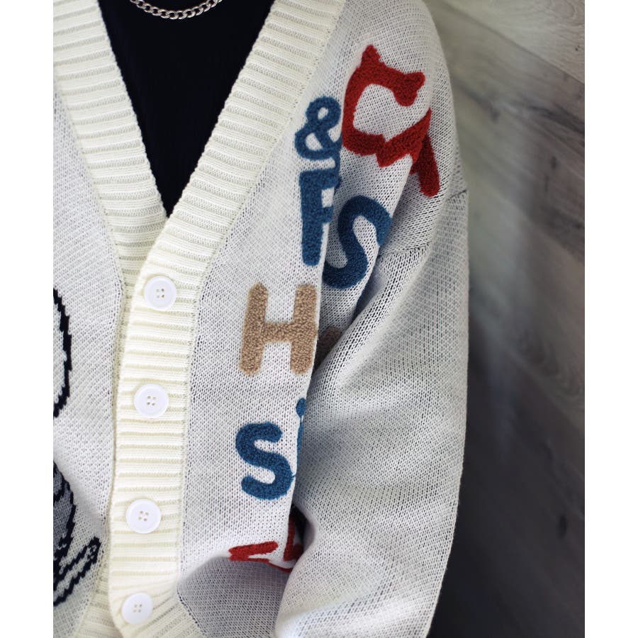 「CAT&FISH」英字刺繍猫イラストカーディガン ユニセックス オーバーサイズ